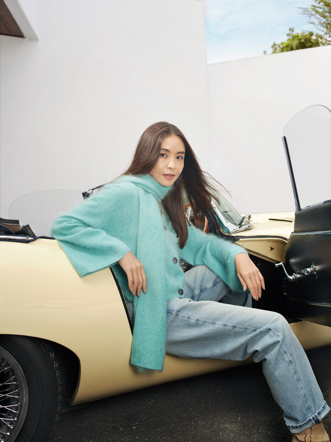目の覚めるようなミントカラーのブラッシュド カシミヤのカーディガンが特徴的。ブラッシュドカシミヤ フレアスリーブセーター ¥30,000、ブラッシュドウールカシミヤ スカーフ ¥28,000、ストレートデニム ¥18,000、ネックレス ¥8,000、ブーティー ¥40,000