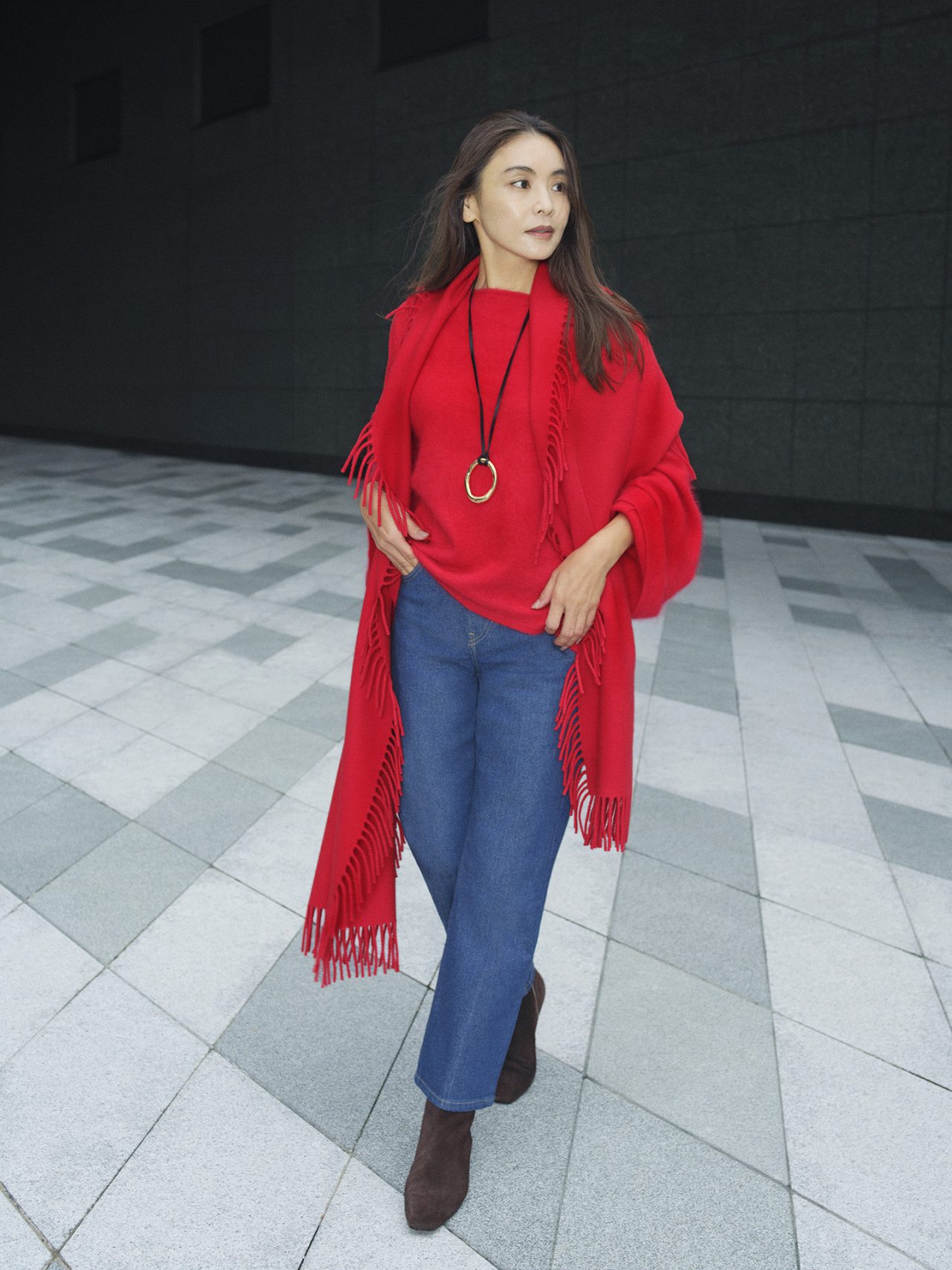 主役級の存在感を放つレッドのブラッシュド カシミヤが印象的。ブラッシュド カシミヤ フレアスリーブ セーター ¥34,000、フリンジウールスカーフ ¥16,000、ハイライズ スリム ブーツカットジーンズ ¥17,000、スエード ブーティー ¥45,000、ネックレス ¥16,000