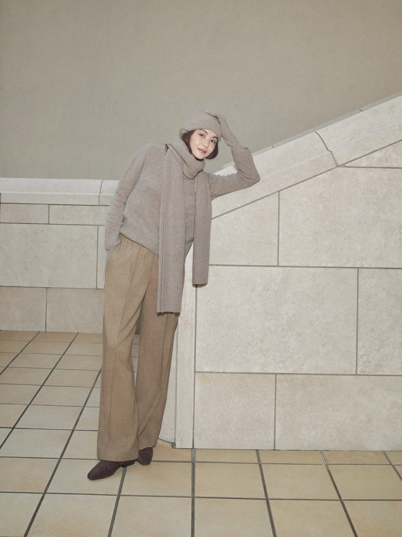 カシミヤのニットとアクセサリーをトープカラーで統一して、モードな印象に。オーバーサイズ ミッドウェイト カシミヤ タートルネックセーター ¥28,000、シグネチャー カシミヤスカーフ ¥26,000、シグネチャー カシミヤビーニー ¥9,000、シグネチャー カシミヤ ロンググローブ ¥9,000