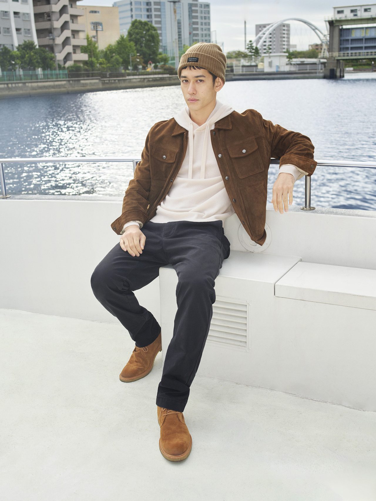カシミヤの極上の肌触りを存分に堪能できるフーディを主役にした、アクティブなウィークエンドスタイル。カシミヤ フーディ― ¥27,000、スエード トラッカー ジャケット ¥88,000、イタリアン メリノウールブレンド ビーニー ¥7,000