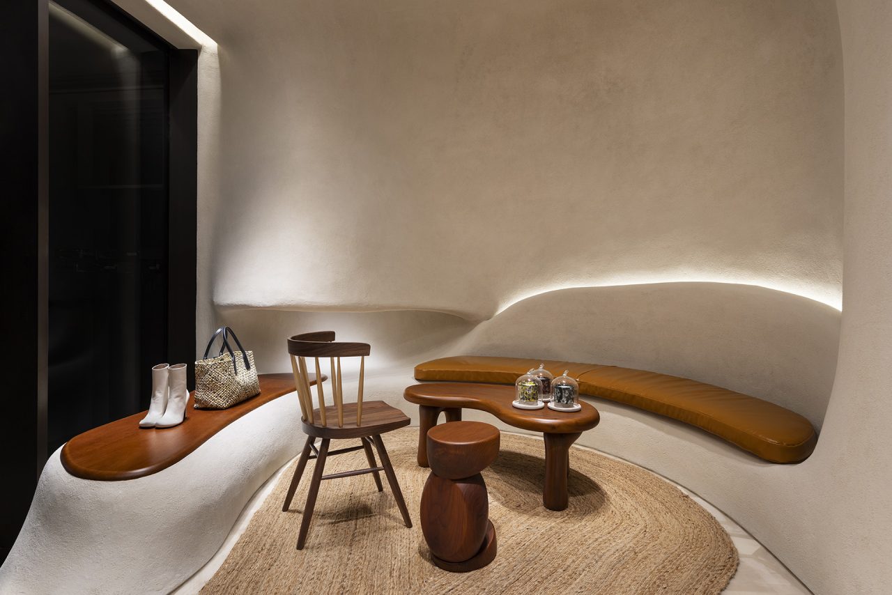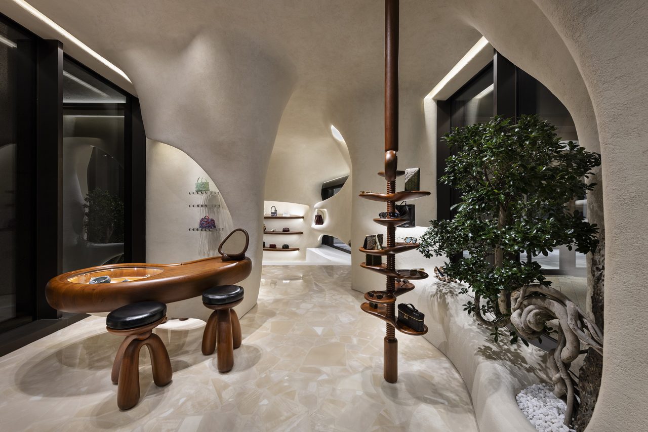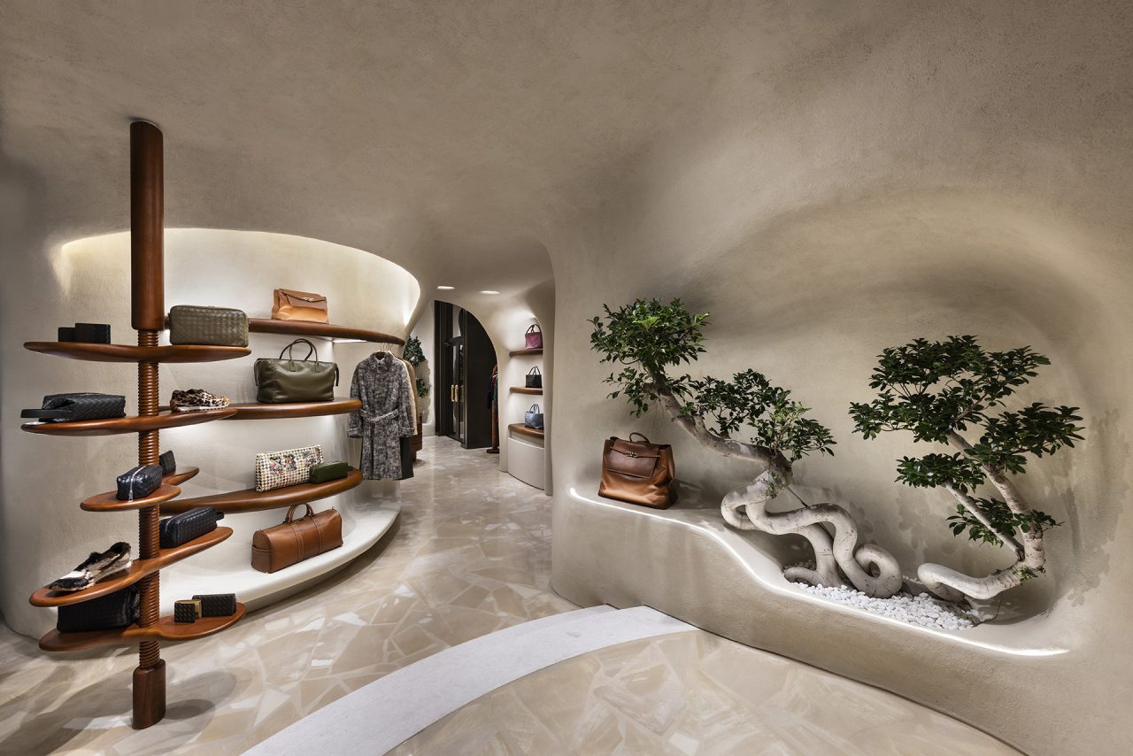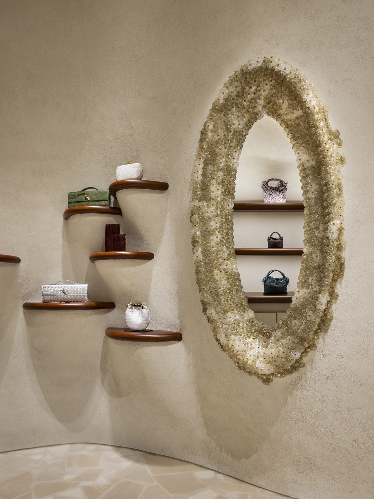 クリエイティブ・ディレクターの Matthieu Blazy (マチュー・ブレイジー) 自らデザインを手がけた BOTTEGA VENETA 麻布台ヒルズが新たにオープン。日本とイタリアのクラフトとデザインにオマージュを捧げ、地中海のモダニズム建築に見られる丸みを帯びた面使いに日本の白い漆喰を施した。また床材は、1966年に創業した BOTTEGA VENETA のルーツである北リア・ヴェネト地方で流行したパッラーディオ様式をモダンにアレンジ。そして店内には日本のガラスアーティスト・三嶋りつ恵による唯一無二のインスタレーションが強い存在感を放つ。国境と時代を越えて、あらゆる感情が巧みに調和する空間を作り上げた。