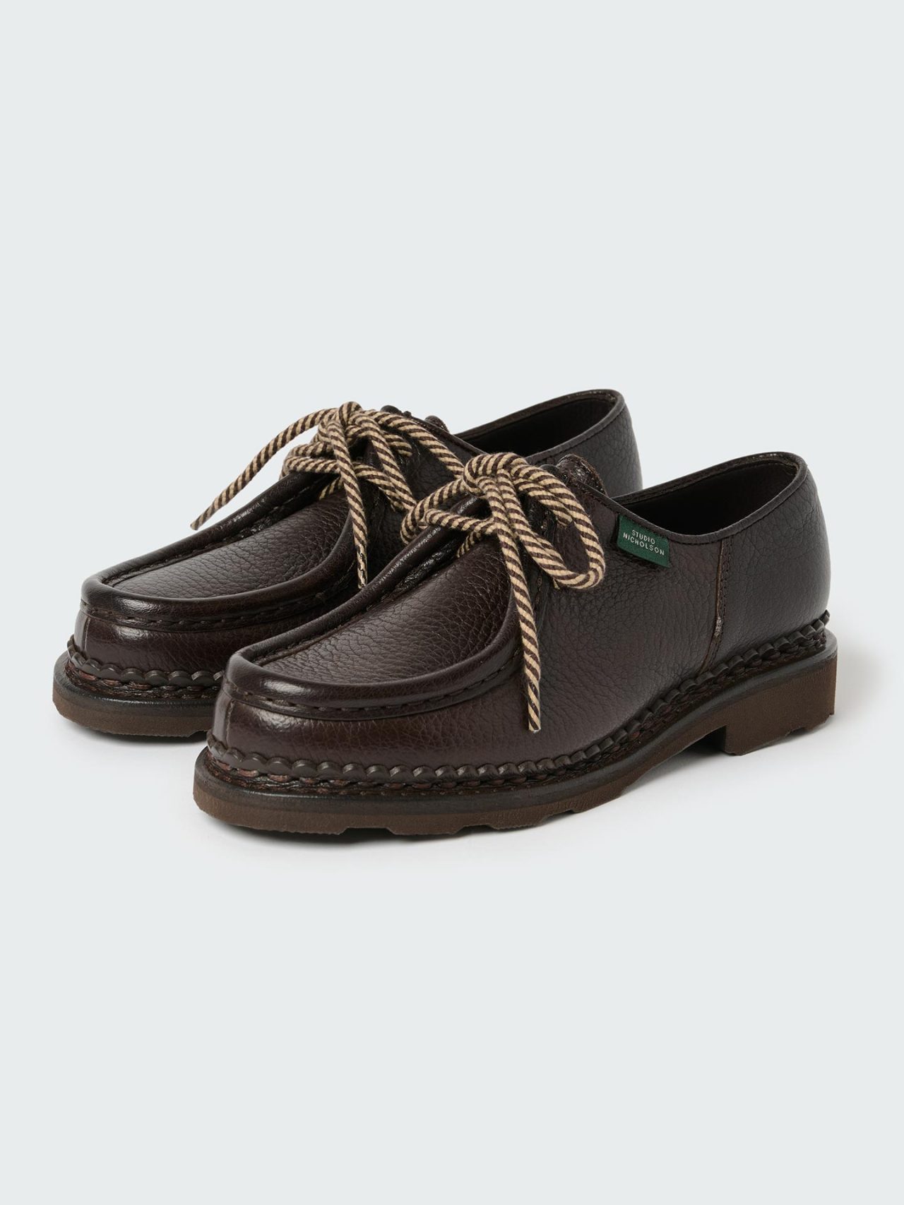 STUDIO NICHOLSON が持つファブリックファーストの理念と Paraboot の世界トップクラスの靴製造の伝統を活かし、素材選び、機能性にこだわった職人技溢れる本コラボ。今回は、Paraboot のシグネチャーシューズである「Micheal (ミカエル) 」をベースに仕上げられている。STUDIO NICHOLSON 2024年秋冬コレクションに調和するカラーの、ダークブラウンで登場。