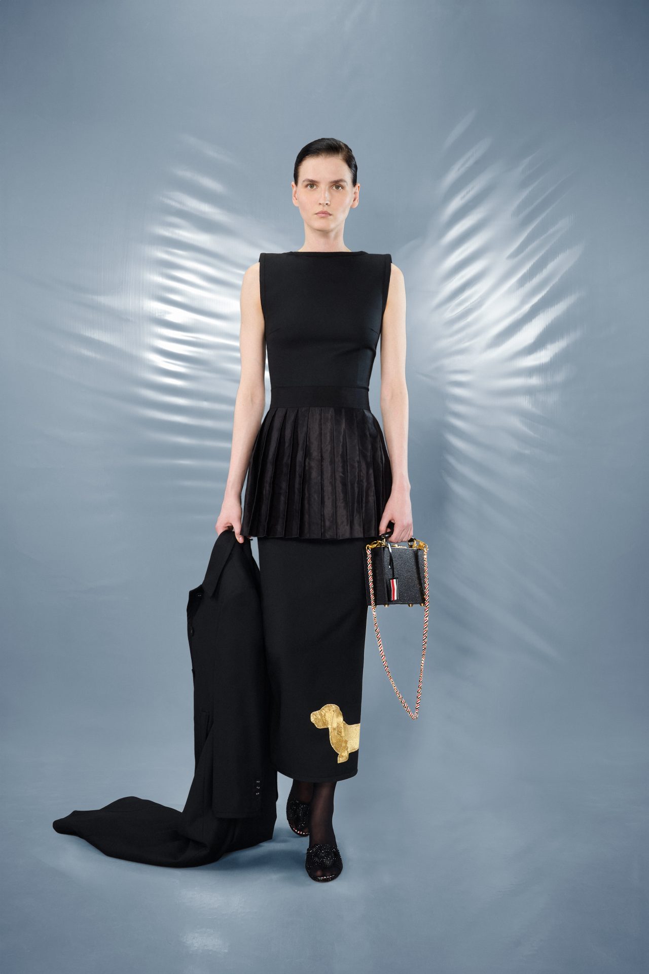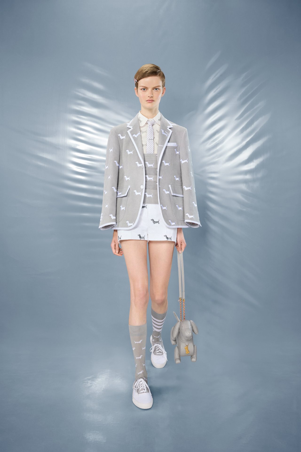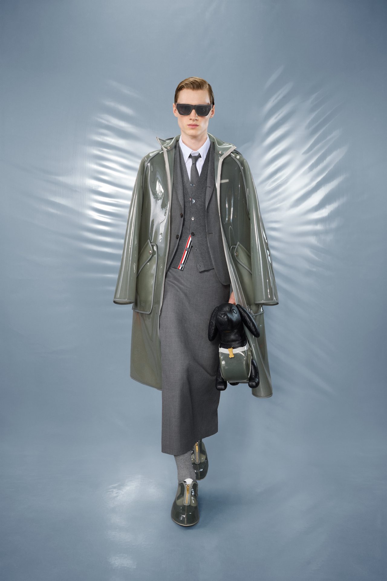 THOM BROWNE 2025年春コレクションにてメンズ、ウィメンズ両方のファーストルックを飾るのは、光沢感のあるモスグリーンのコート。またデザイナー Thom Browne の愛犬であり、昨年のホリデーコレクションでもフィーチャーされた Hector Browne (ヘクター ブラウン) がバッグ、セットアップのプリントなど、可愛らしいモチーフとなってコレクションに華を添える。そしてウィメンズの中盤には爽やかなカラーリングのルックが登場し、ウィメンズ2020年リゾートや2021年春夏を彷彿とさせる。一方メンズでは、これまでの THOM BROWNE を象徴するようなトラディショナルなスタイル、脱構築的なデザインが多く見られる。装飾を削るようなシルエットがテーラードの美しさを強調し、ブランドの原点を見つめ直すようだ。過去と現在が呼応し、タイムスリップのような夢を見せてくれる THOM BROWNE 2025年春コレクション。ブランドの真髄を感じるとともに、未来への期待も膨らむ。