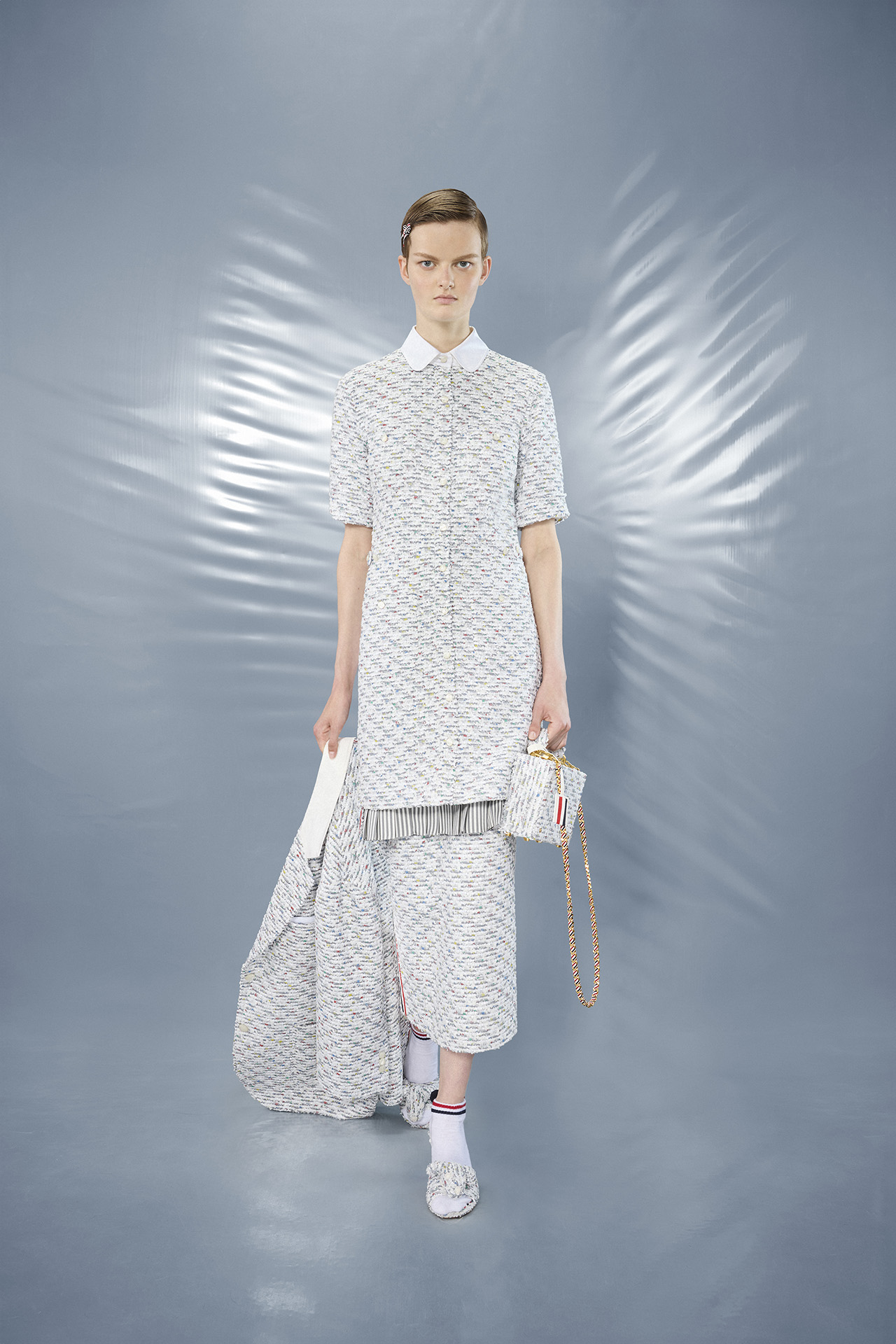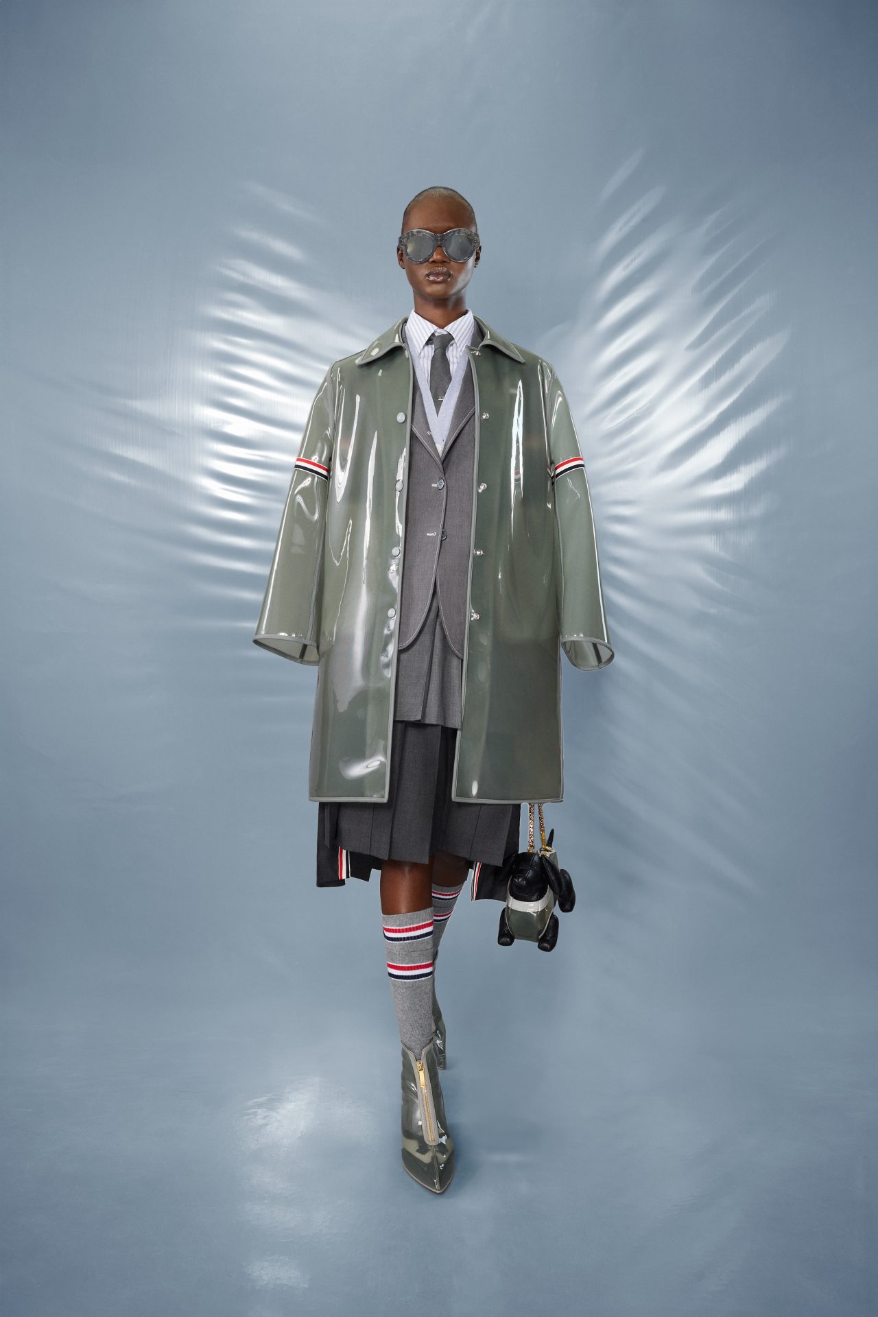 THOM BROWNE 2025年春コレクションのテーマは、過去と現在の対話。ブランドは2001年にデザイナーの名を冠してスタート、2005年にニューヨーク・ファッションウィークにてコレクションデビューを果たして以来、テーラリングの常識を打ち壊してきた。本コレクションはそんな初心に立ち返り、ブランドの起源を辿るようなルックを披露。クラシックなスタイルに革新性と創造性を与えた大胆なアイデアが随所に散りばめられ、THOM BROWNE のタイムレスな魅力を体現する。