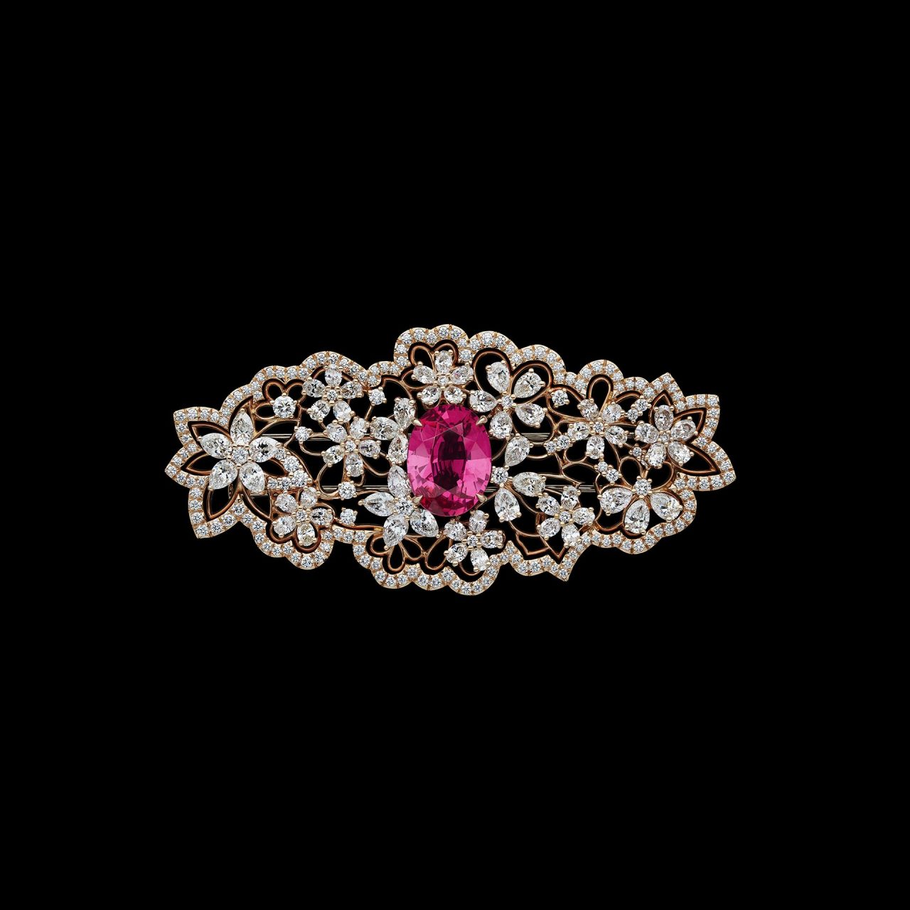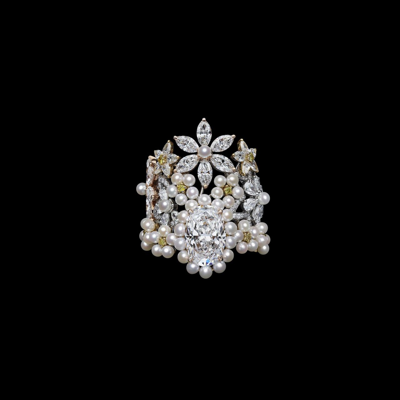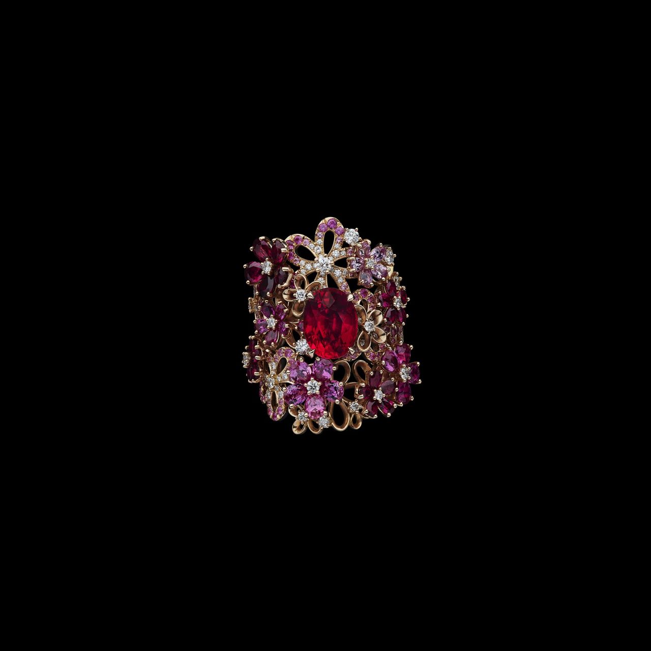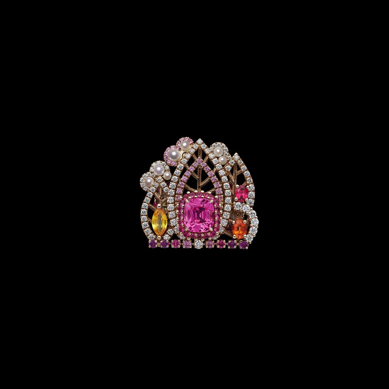 ホワイトやイエロー、ピンクゴールドを基調とし、クチュールの上質な糸で織られたレースを彷彿とさせる精巧なデザインが特徴的な本コレクション。煌めきと軽やかさが交錯し、あしらわれた珠玉の宝石と優美なパールがもたらす輝きの色彩が華やかさを際立たせている。さらに、洗練されたギピュールレースの織り目を思わせる、繊細な細工を施したセッティングとダイヤモンドやルビー、トルマリン、サファイアの幾重にも放たれる輝きの組み合わせも印象的だ。きめ細かさと豊満さが共生した唯一無二のデザインでオートクチュールのエスプリを体現するクリエイションは、Victoire de Castellane の大胆さと創造性、そして卓越した職人技により生み出されていく。