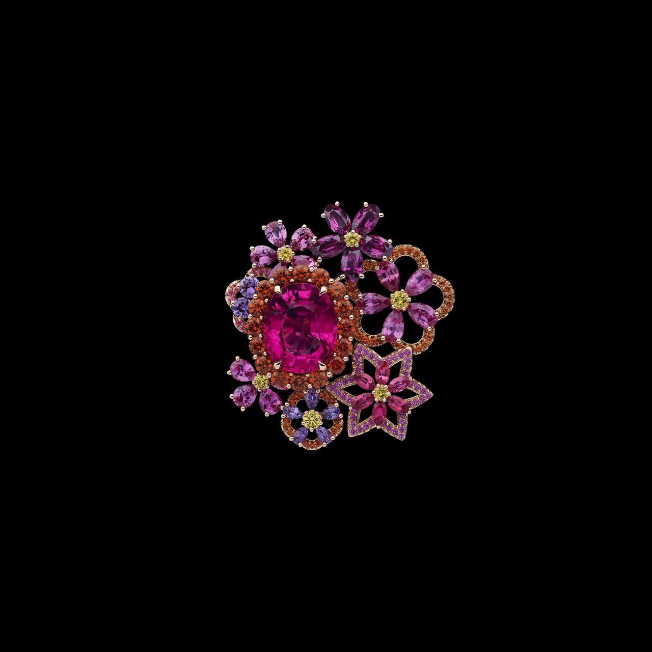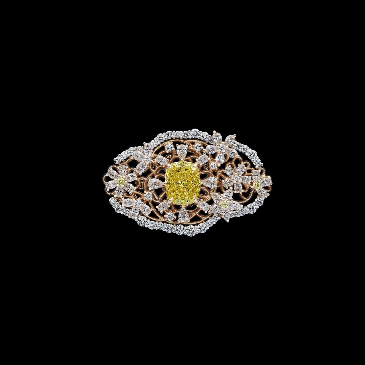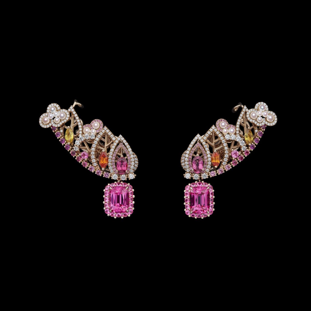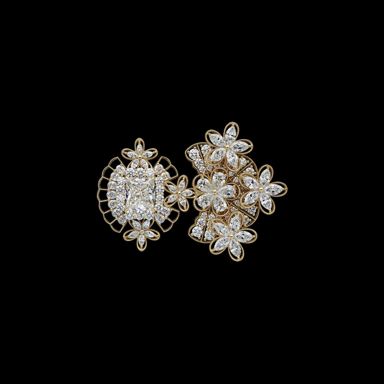 ホワイトやイエロー、ピンクゴールドを基調とし、クチュールの上質な糸で織られたレースを彷彿とさせる精巧なデザインが特徴的な本コレクション。煌めきと軽やかさが交錯し、あしらわれた珠玉の宝石と優美なパールがもたらす輝きの色彩が華やかさを際立たせている。さらに、洗練されたギピュールレースの織り目を思わせる、繊細な細工を施したセッティングとダイヤモンドやルビー、トルマリン、サファイアの幾重にも放たれる輝きの組み合わせも印象的だ。きめ細かさと豊満さが共生した唯一無二のデザインでオートクチュールのエスプリを体現するクリエイションは、Victoire de Castellane の大胆さと創造性、そして卓越した職人技により生み出されていく。