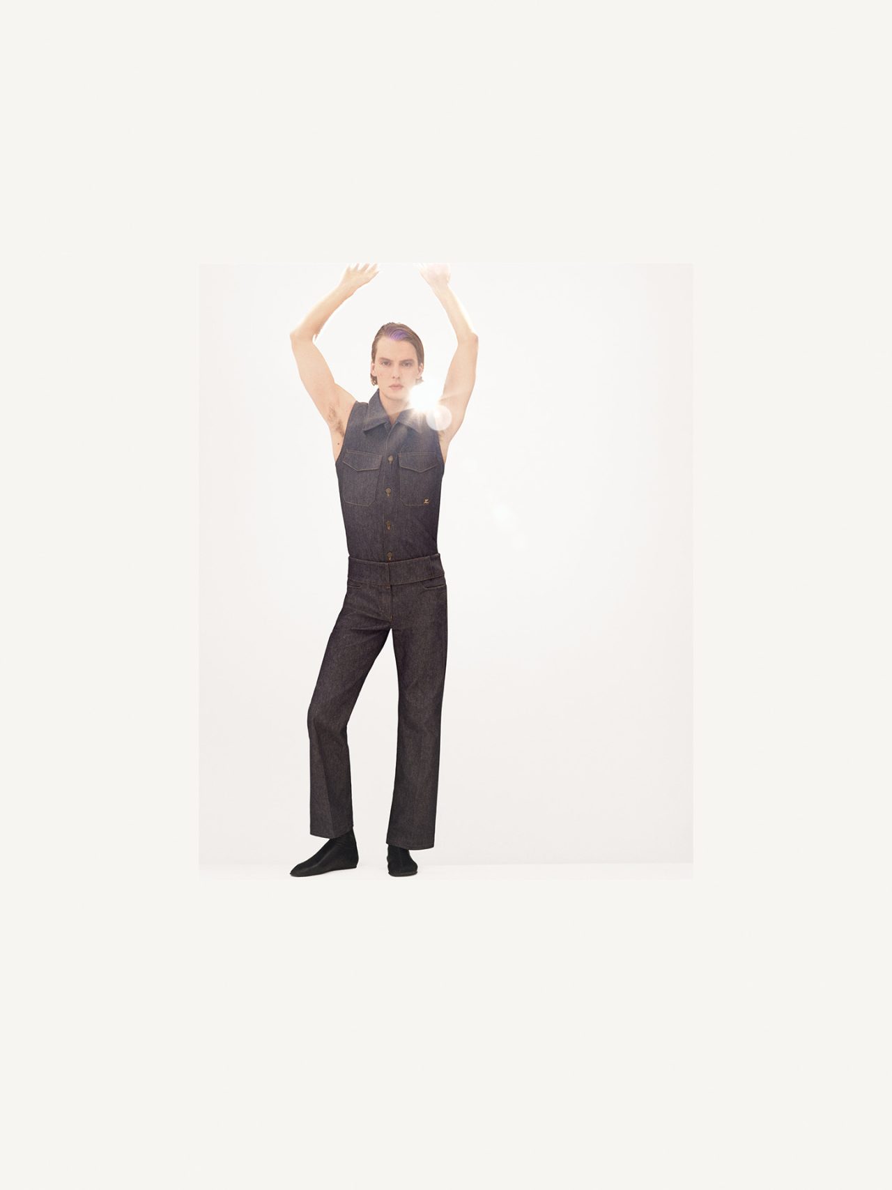 テーラードデニムのセットアップやレザーブルゾン、ブランドのアイコンである「Holy Bag (ホーリー バッグ)」などのシンプルかつスタイリッシュなアイテムは、ミニマムな空間だからこそモデルの個性や厳格なシルエットが際立つ。洗練された Courrèges の新たなキャンペーンをぜひチェックしてみて。