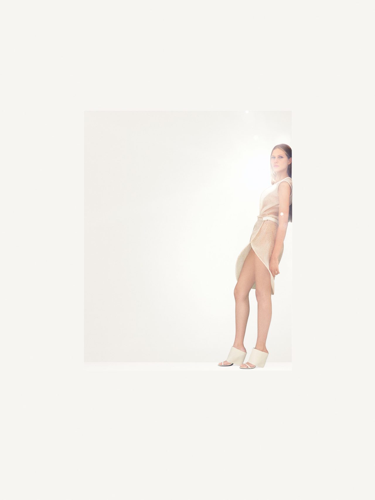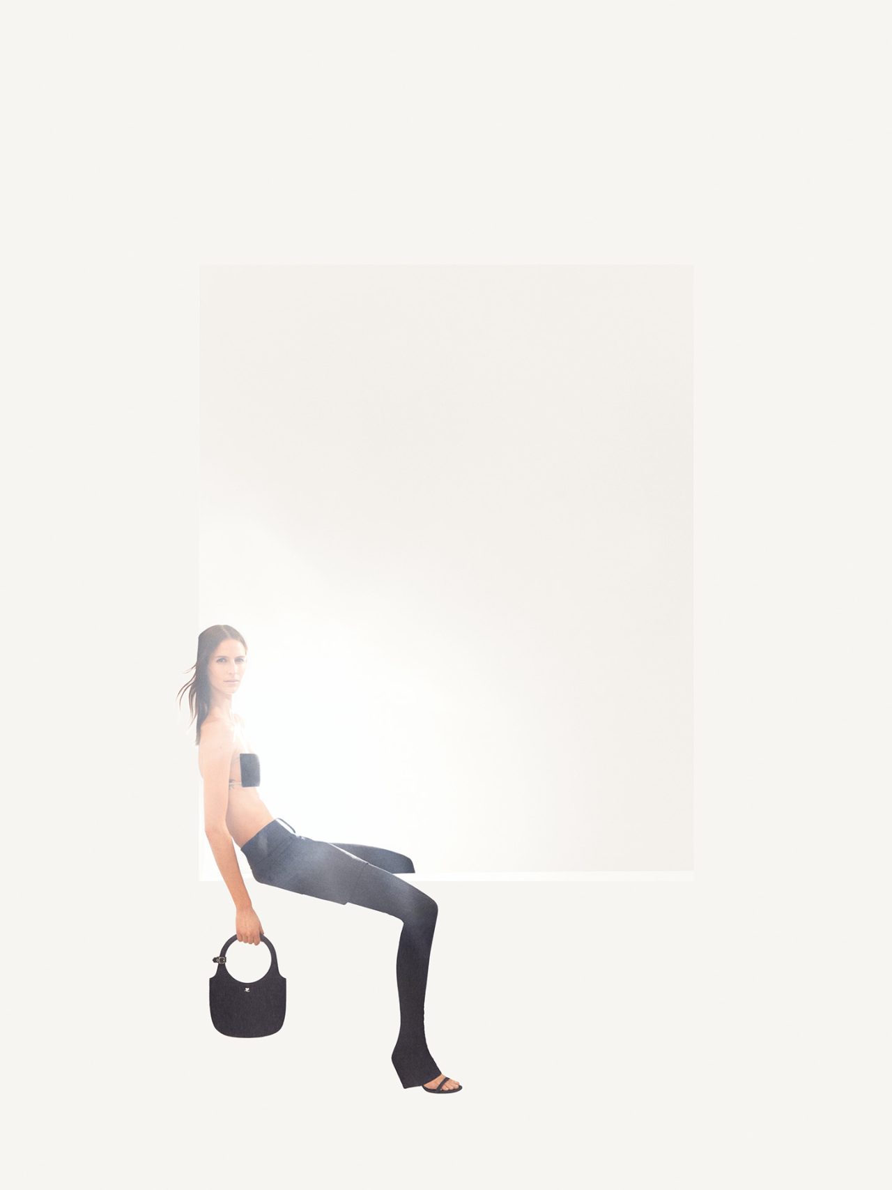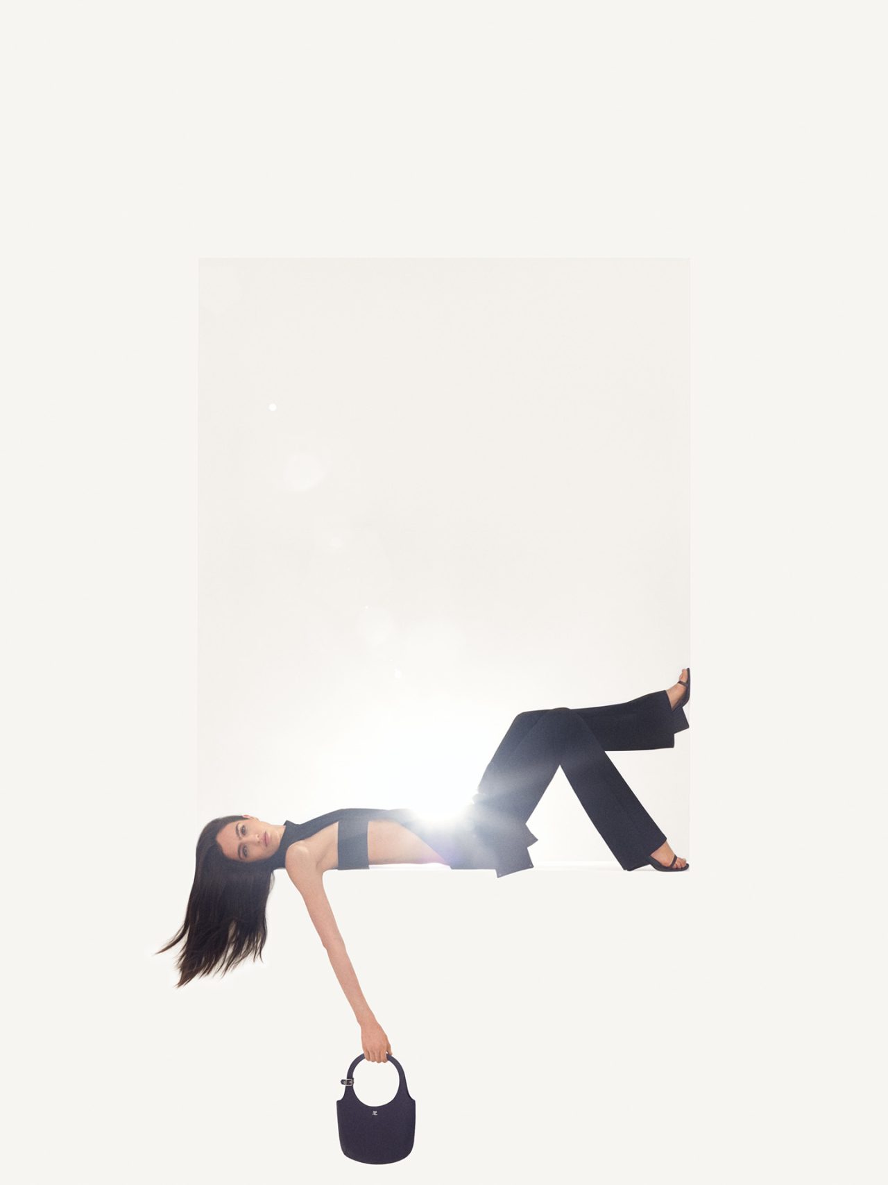 本キャンペーンのイメージは、 Courrèges の象徴である「Carré Magique (魔法の四角形)」を詩的に再解釈したもの。2024年秋冬キャンペーンでは、大胆な色彩とスケールでブランドが持つ幾何学的なコードを拡大させていたのに対し、今回は洗練された白い背景とポートレートが持つ温かさを融合。幾何学と現実が交差する世界における楽観的な精神を表した。白い背景から切り取られた、長方形のフレームに佇むモデルは、何かを待ち望む一瞬の静けさや落ち着きを漂わせ、一筋の光がノスタルジックでロマンスを感じさせるムードを演出している。