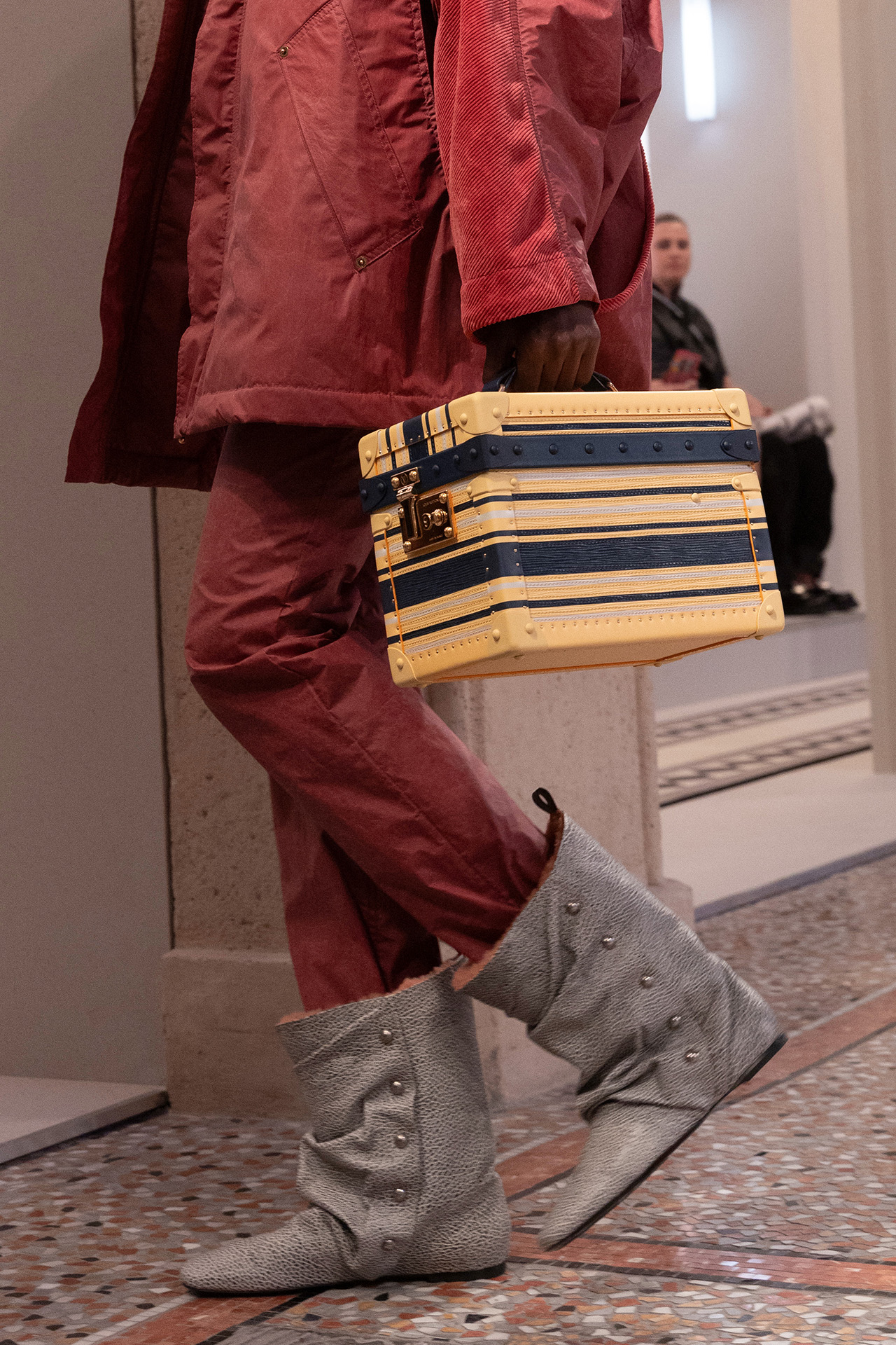 時代を卓越するトラベルウォッチ「LV Ⅱ」が本コレクションで華麗に復刻。ネックレスとしてもブレスレットとしても使用できるデザインに進化して蘇った。またメゾンは今回、ドイツを代表するエレクトログループ Kraftwerk (クラフトワーク) とのコラボを実現。ショーのテーマにちなんで、アイコニックなアルバム「Trans-Europe Express (ヨーロッパ特急)」のジャケットデザインがいくつかのルックに落とし込まれている。