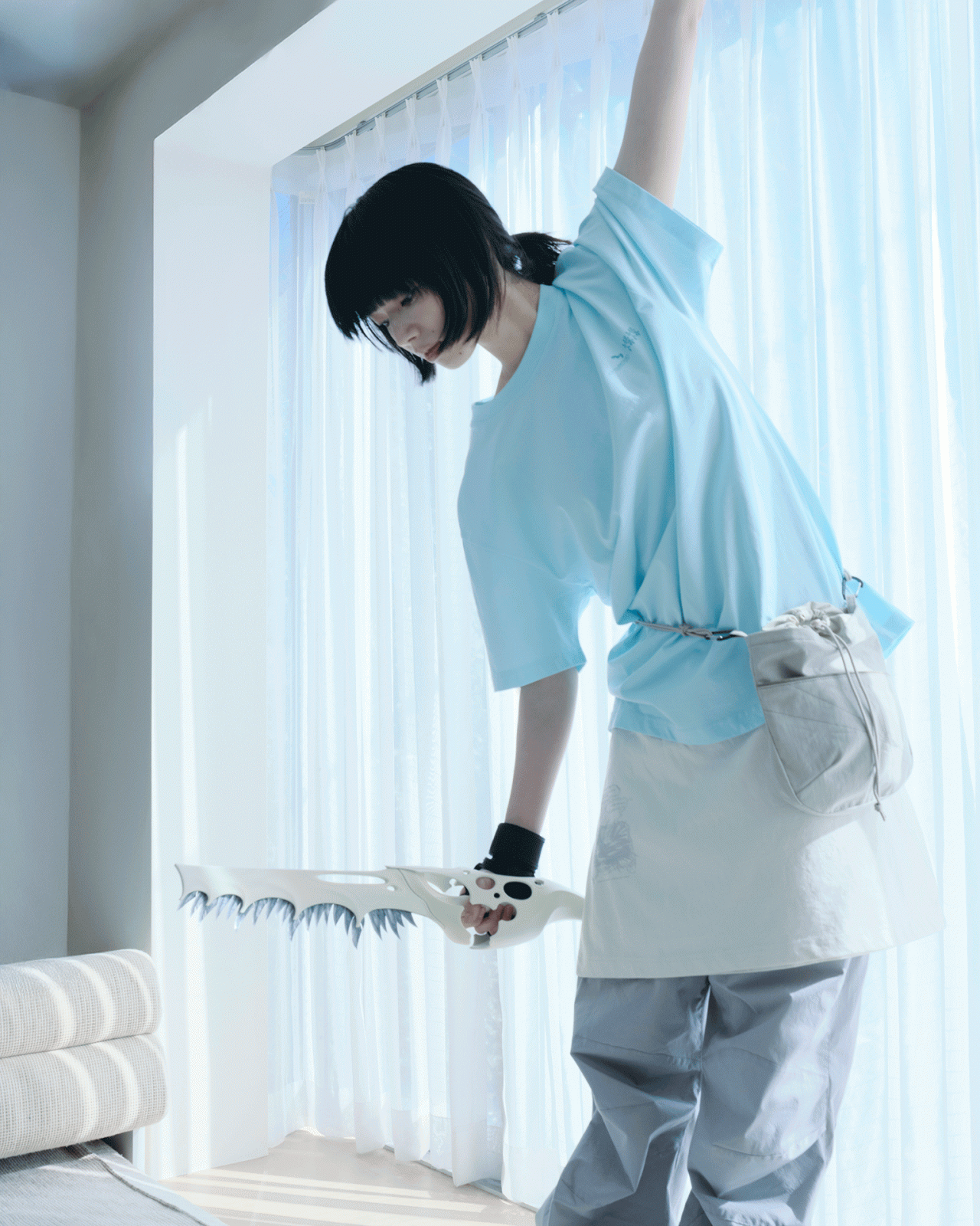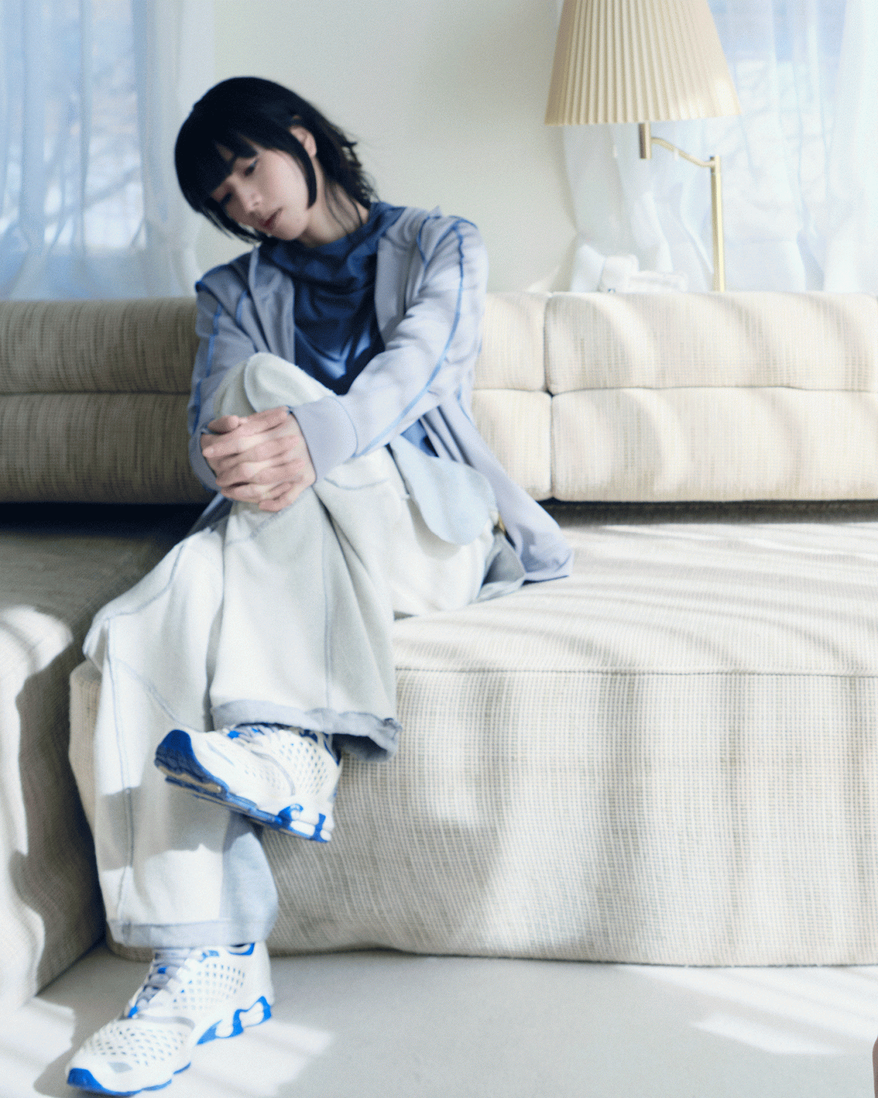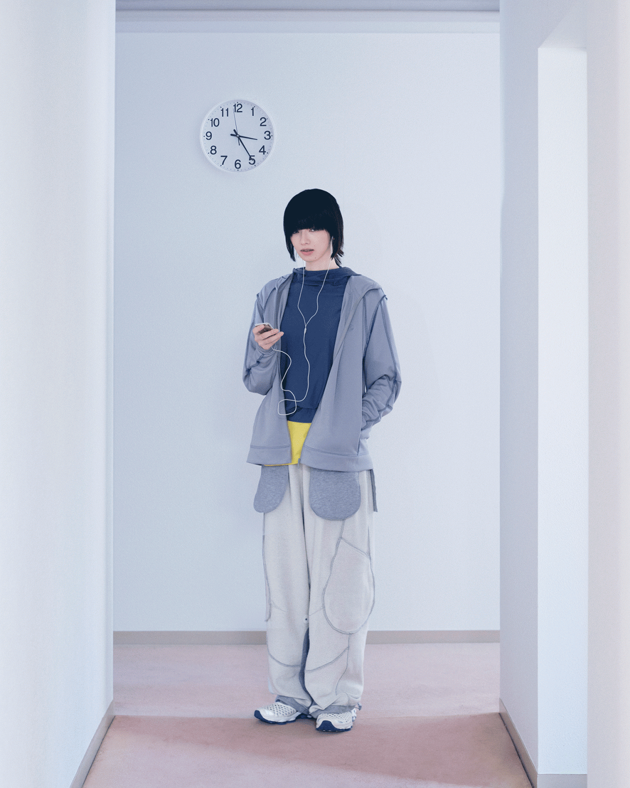 本コレクションで、SAN SAN GEAR まとったのは、俳優の小松奈々。フォトグラファーの Nikolai Ahn (ニコライ・アン) によって撮り下ろされた本撮影は、「循環」、「シュルレアリスム」をテーマに、繰り返される日常の中で新たな始まりと経験に出会う瞬間をとらえている。