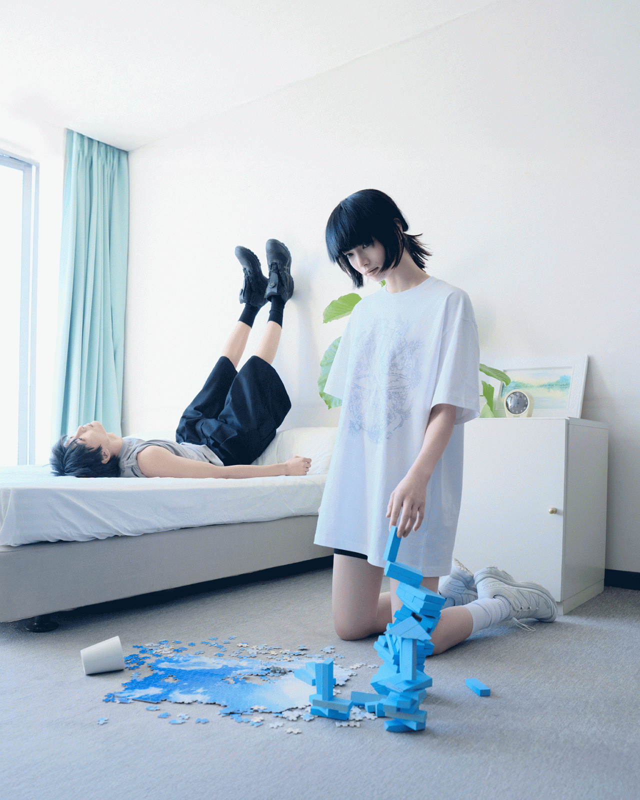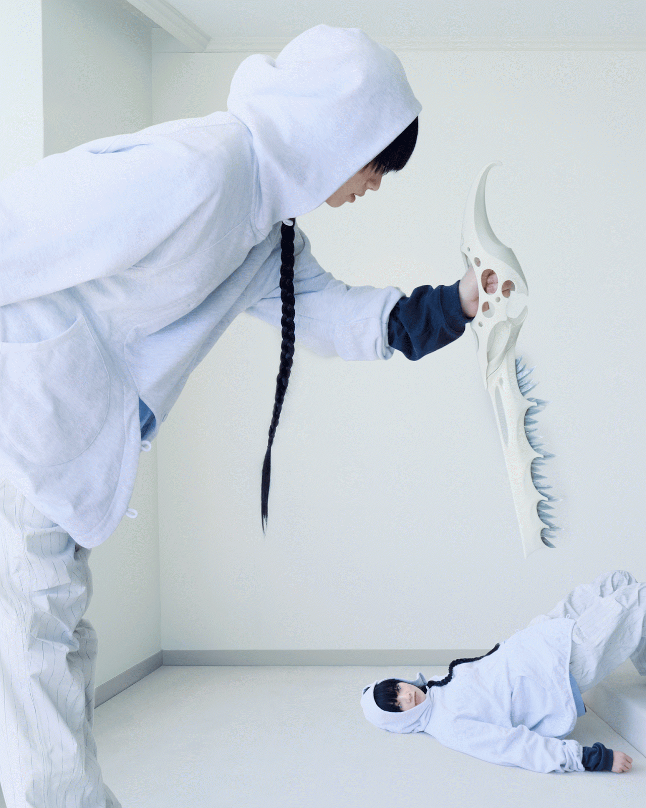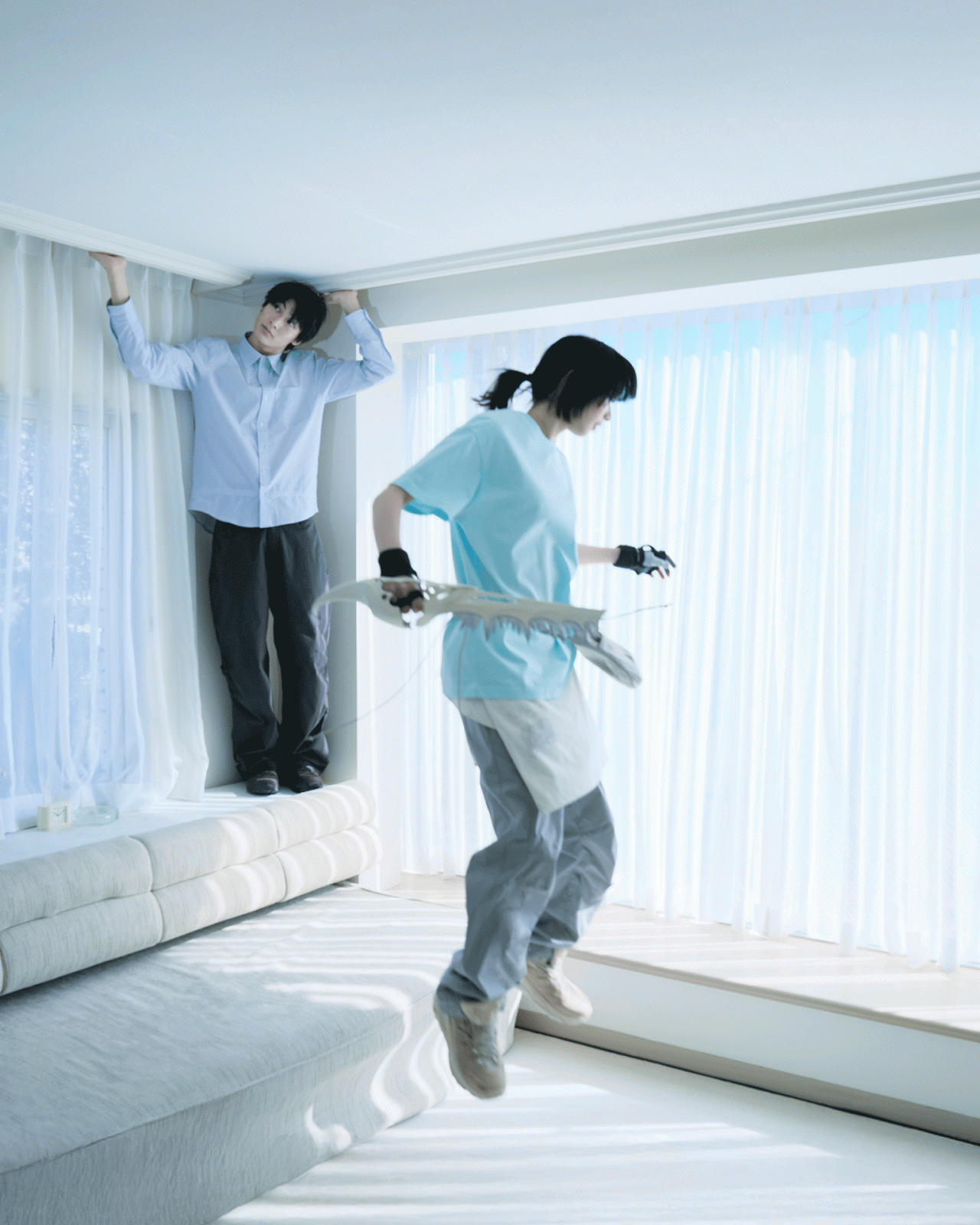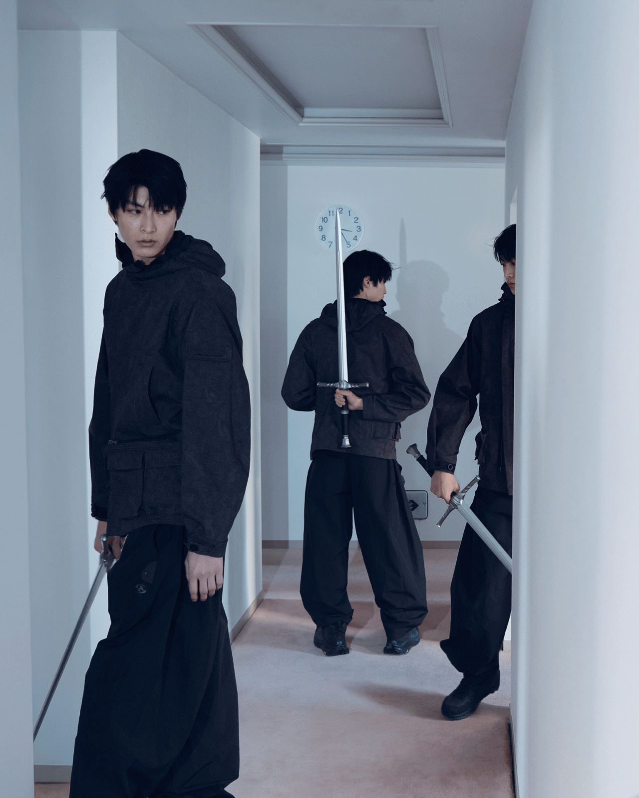 本コレクションで、SAN SAN GEAR まとったのは、俳優の小松奈々。フォトグラファーの Nikolai Ahn (ニコライ・アン) によって撮り下ろされた本撮影は、「循環」、「シュルレアリスム」をテーマに、繰り返される日常の中で新たな始まりと経験に出会う瞬間をとらえている。