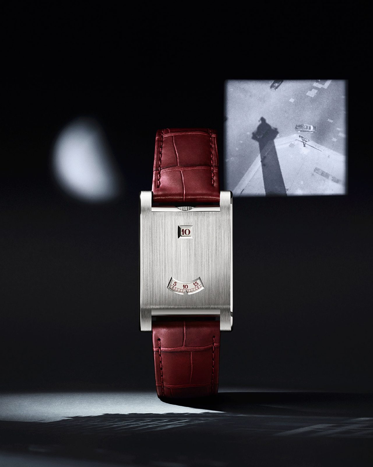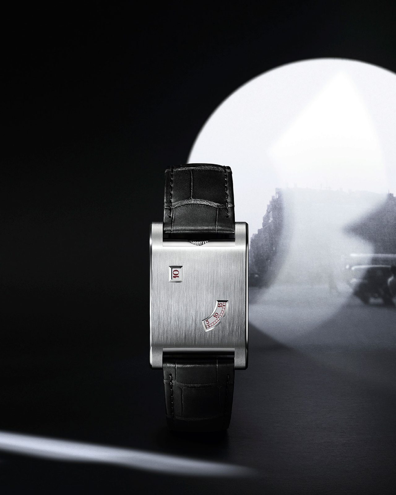 時計愛好家が注目を集める独創的なコレクション「カルティエ プリヴェ」から登場する「タンク ア ギシェ」。本アイテムは、1928年に発表され、技術を活かしたデザインにより、デジタル時刻表示を実現。新しい時計は、1928年モデルのデザインを採用しており、時表示と分表示の小窓をそれぞれ12時位置、6時位置に配している斬新なデザインが特徴。正面は、ゴールドやプラチナにサテン仕上げを施している。