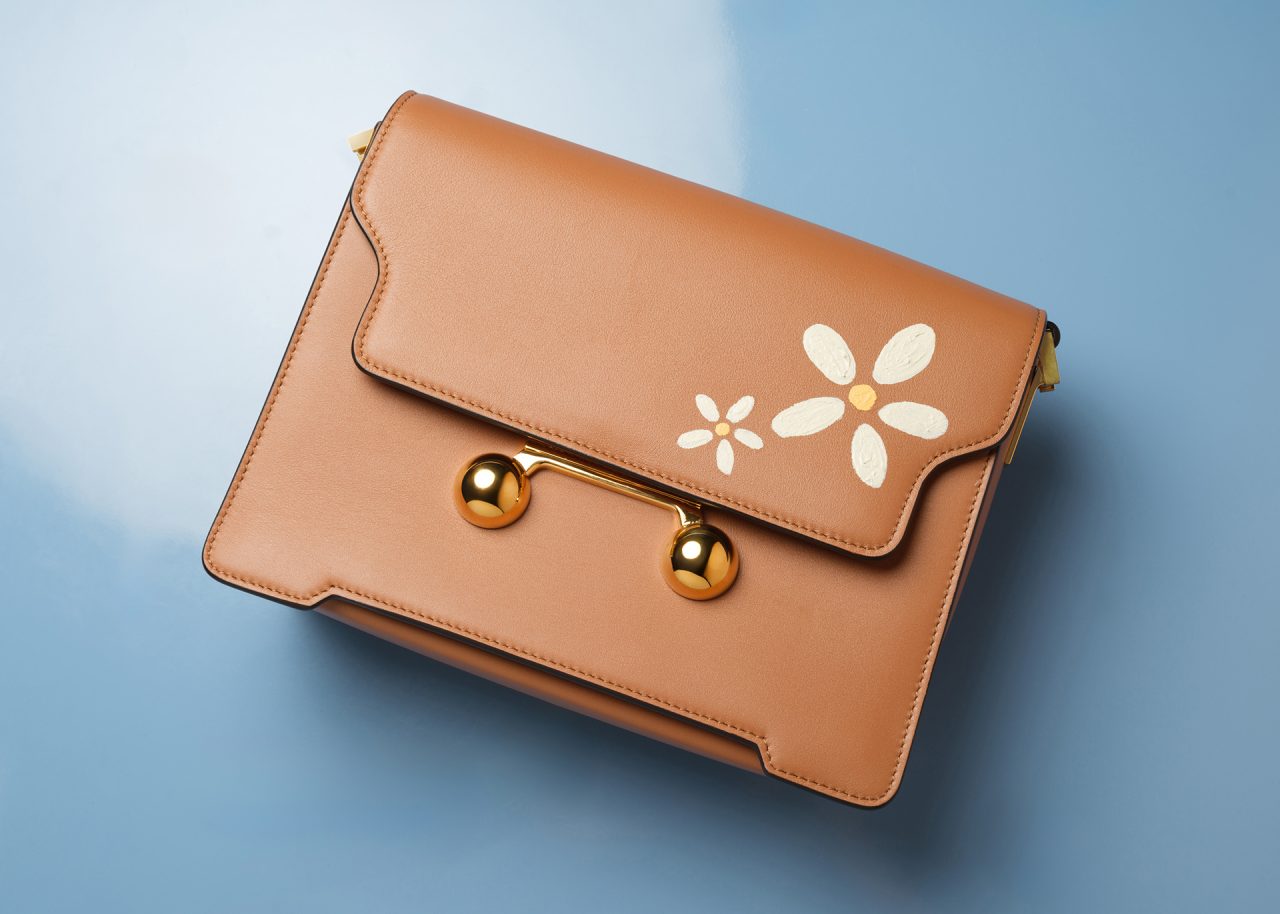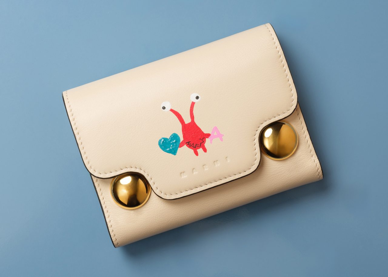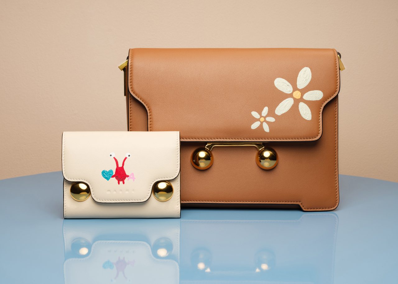 また、購入者先着でアーカイブプリントの風呂敷でお包みするサービスをはじめ、レザーグッズを含む165,000円以上購入した方には、国内初のライブペイントサービスも実施。オリジナルキャラクターの「LITTLE MONSTERS」やフラワー、アルファベットなどのモチーフをレザーグッズにペイントすることができるので、ぜひ MARNI の世界観を楽しんで。