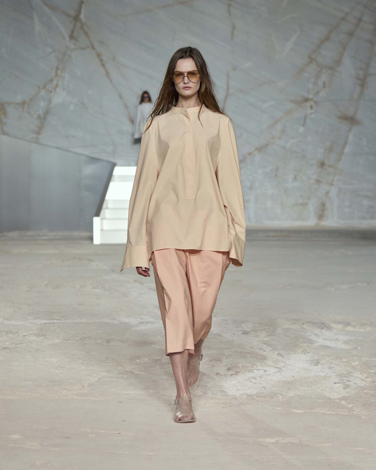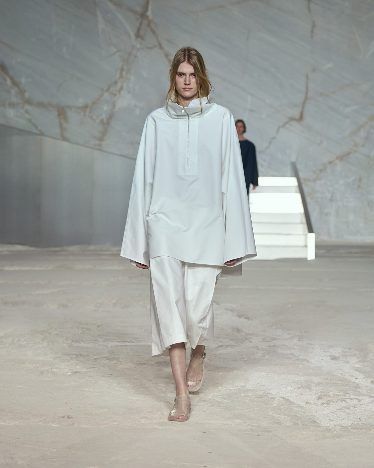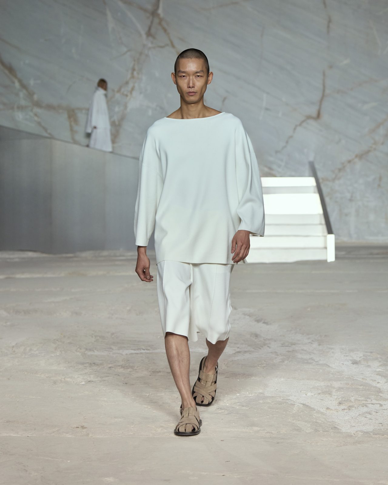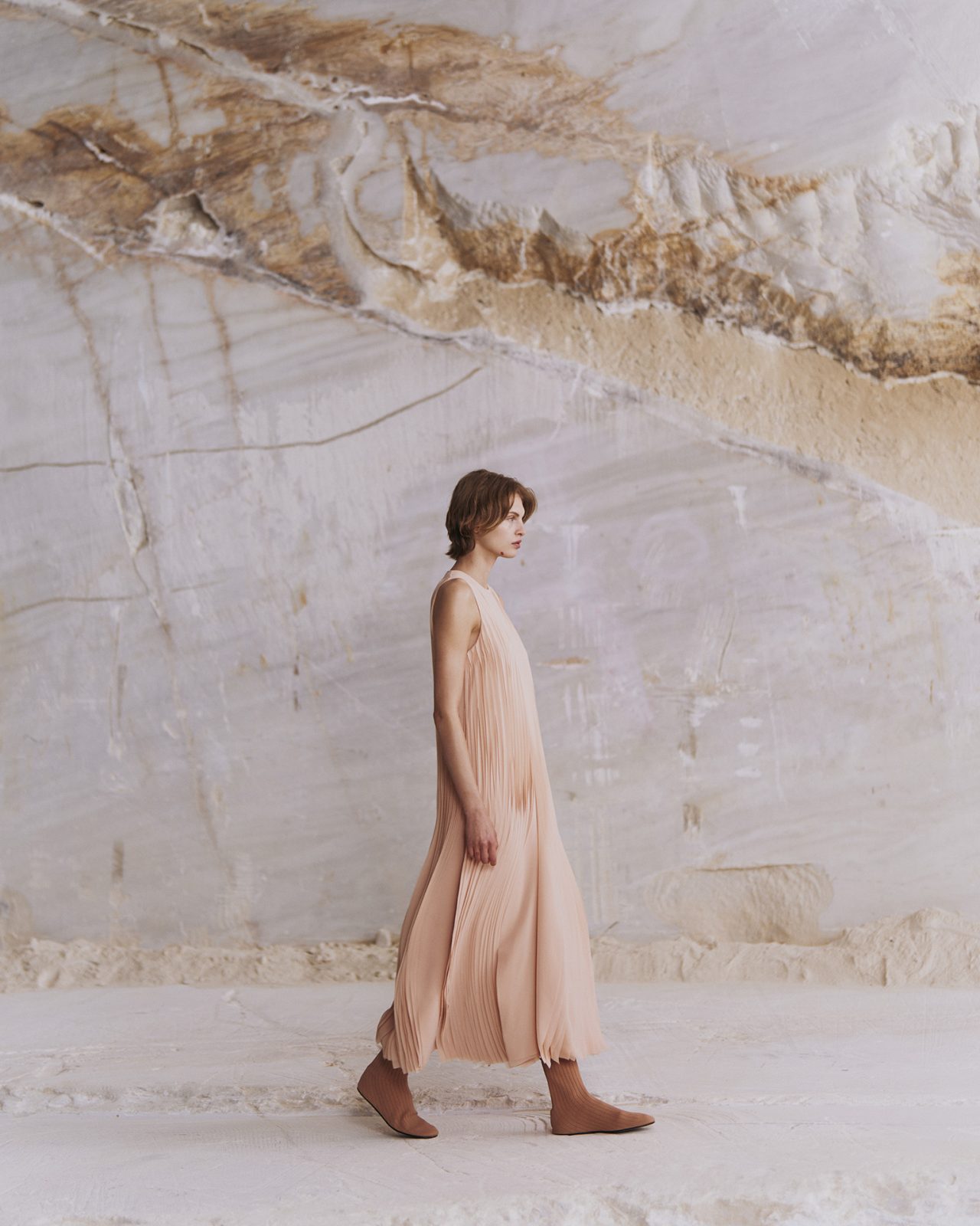 今回の舞台になったのは、パルテノン神殿などに使われる大理石が採掘されたディオニソス大理石採石場。大理石に囲まれた会場が、コンセプチュアルでありながら意外性のあるコントラストを生み、コレクションのクリーンなミニマリズムさと彫刻的なラインを強調する。