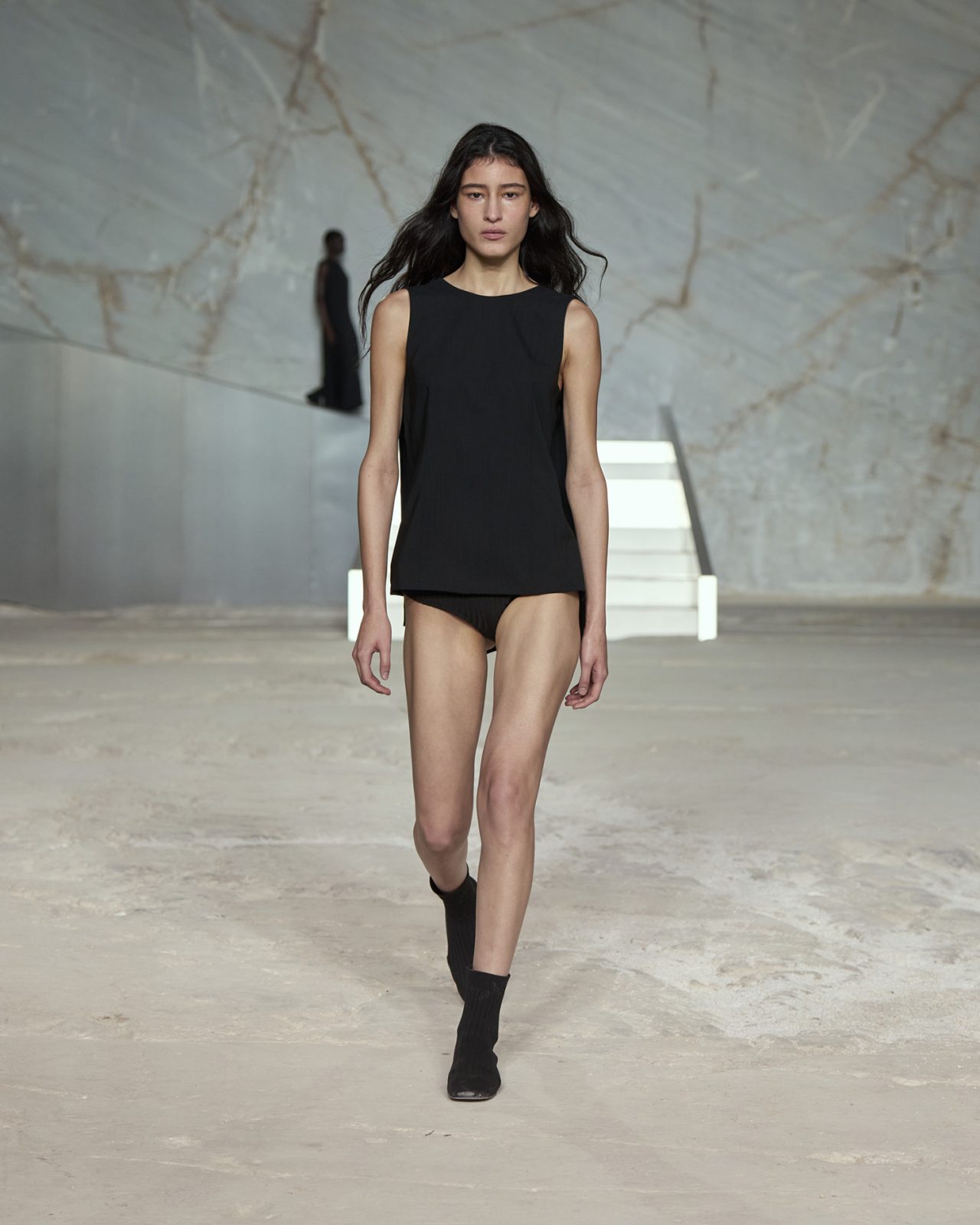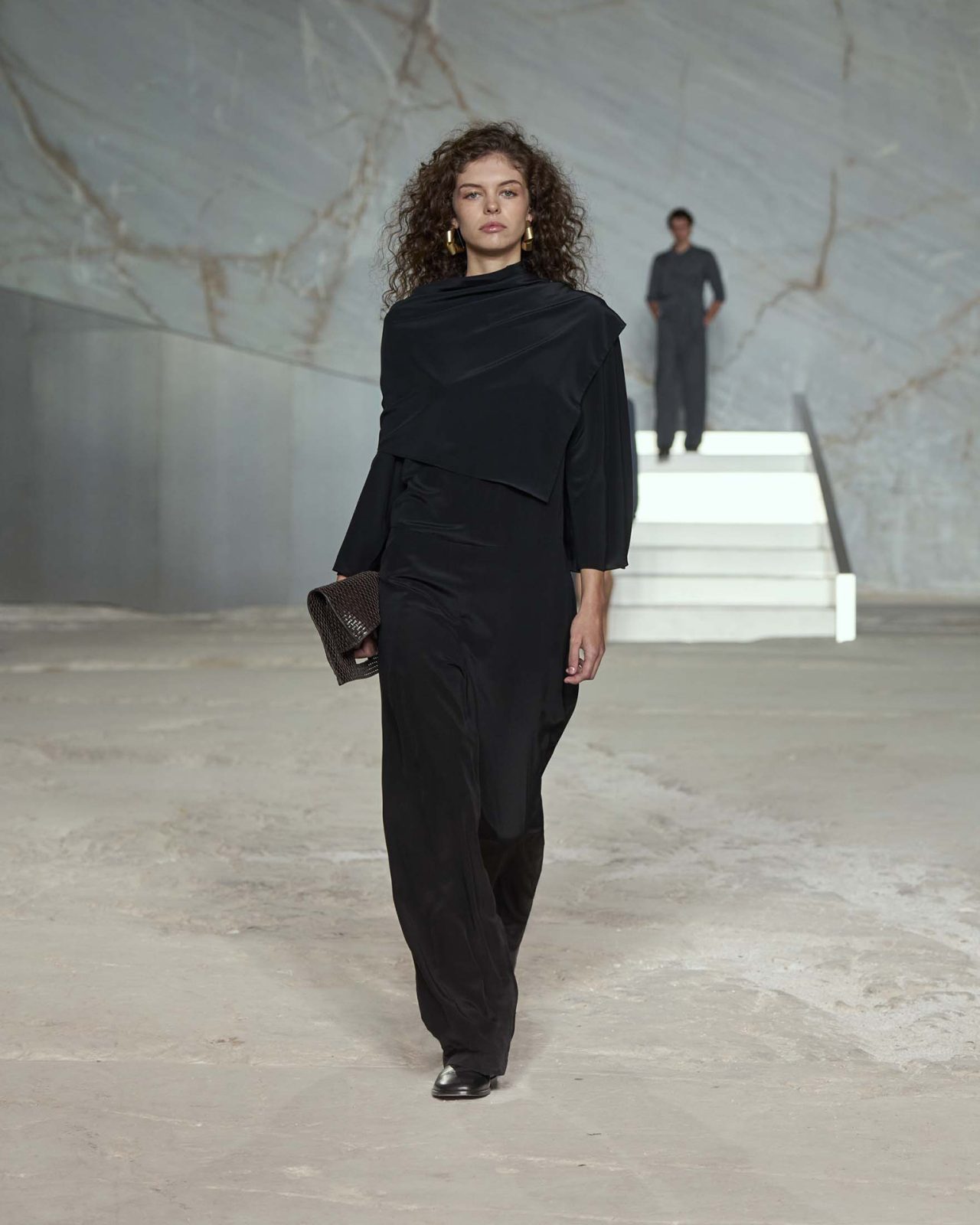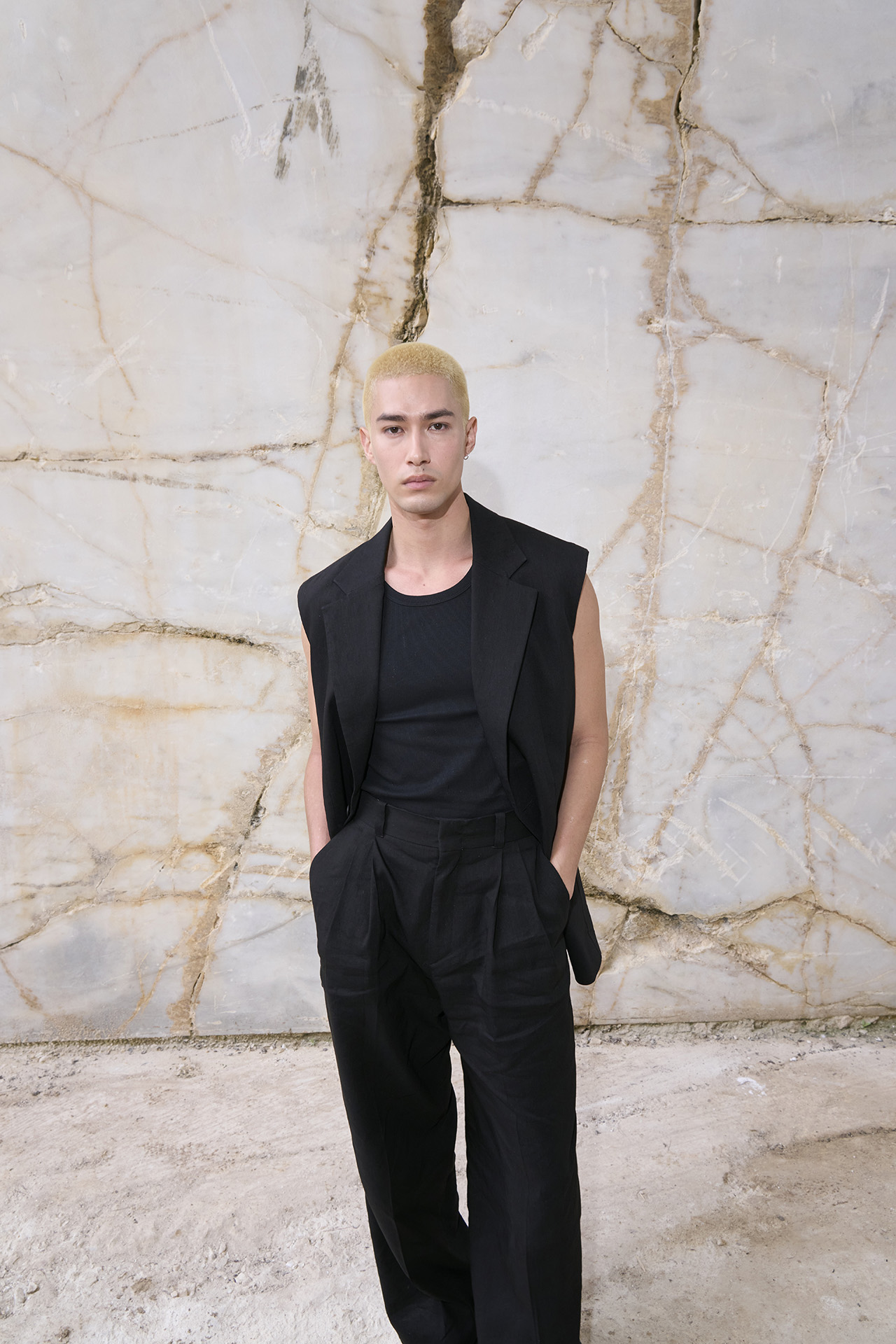 今回の舞台になったのは、パルテノン神殿などに使われる大理石が採掘されたディオニソス大理石採石場。大理石に囲まれた会場が、コンセプチュアルでありながら意外性のあるコントラストを生み、コレクションのクリーンなミニマリズムさと彫刻的なラインを強調する。