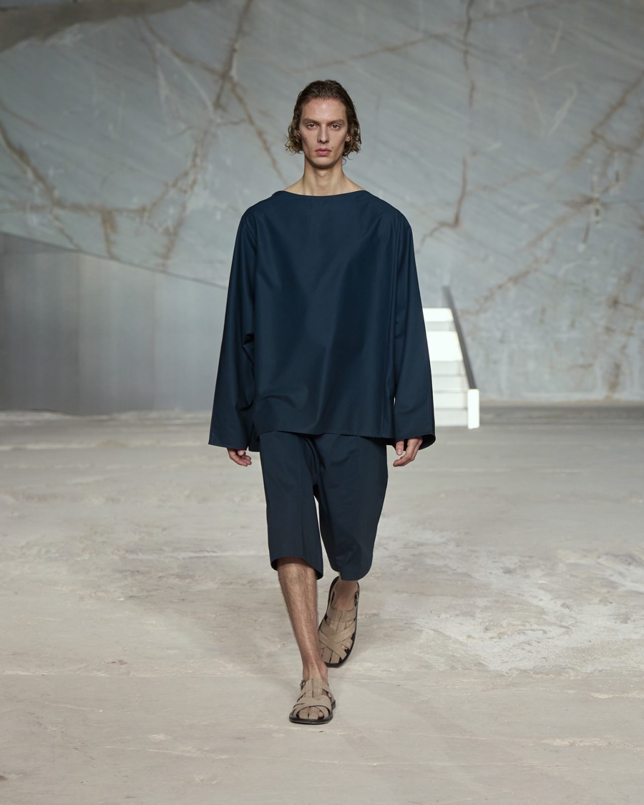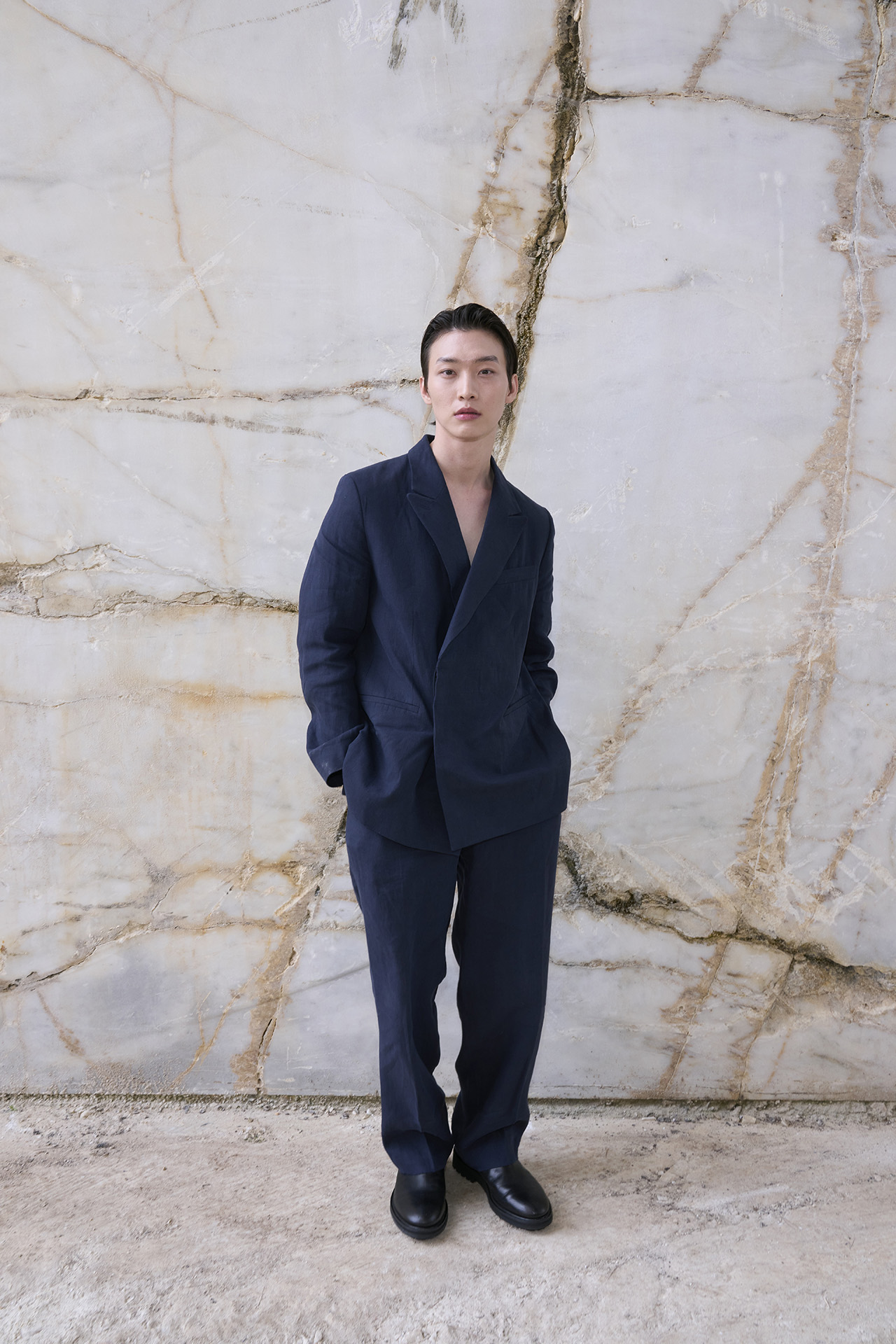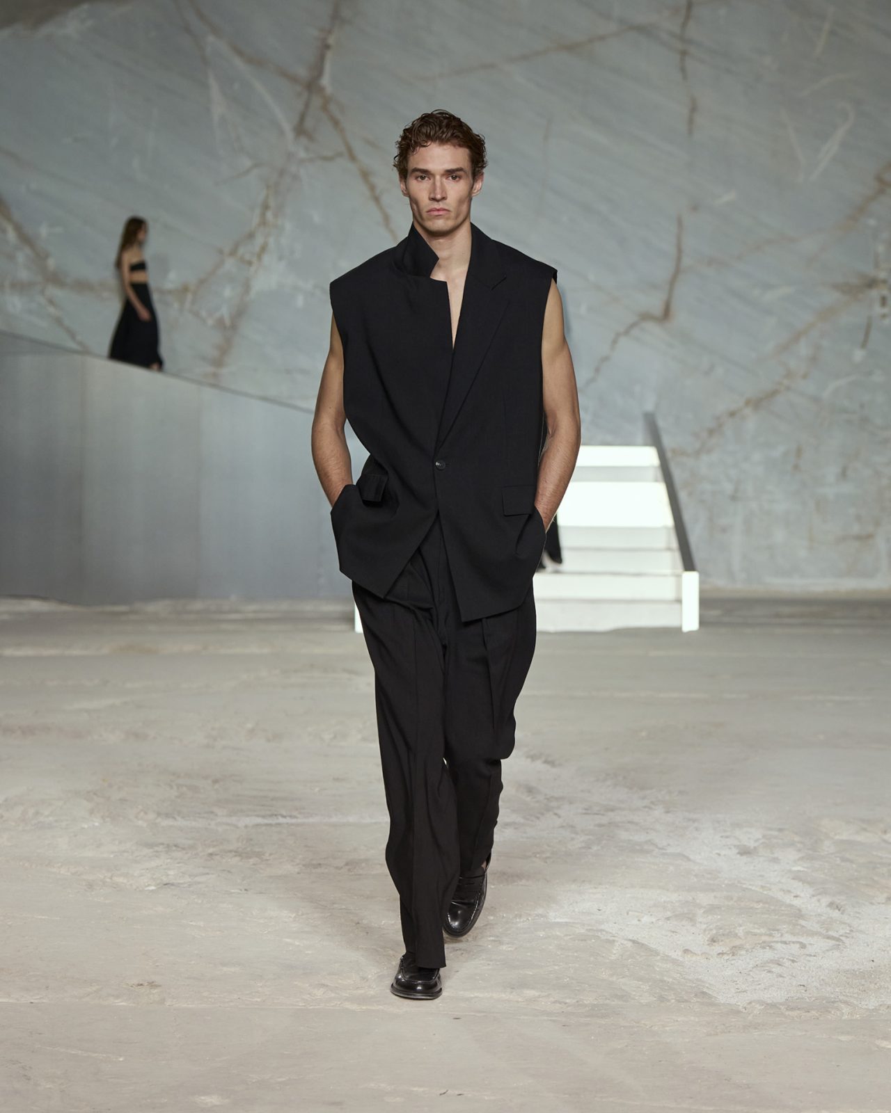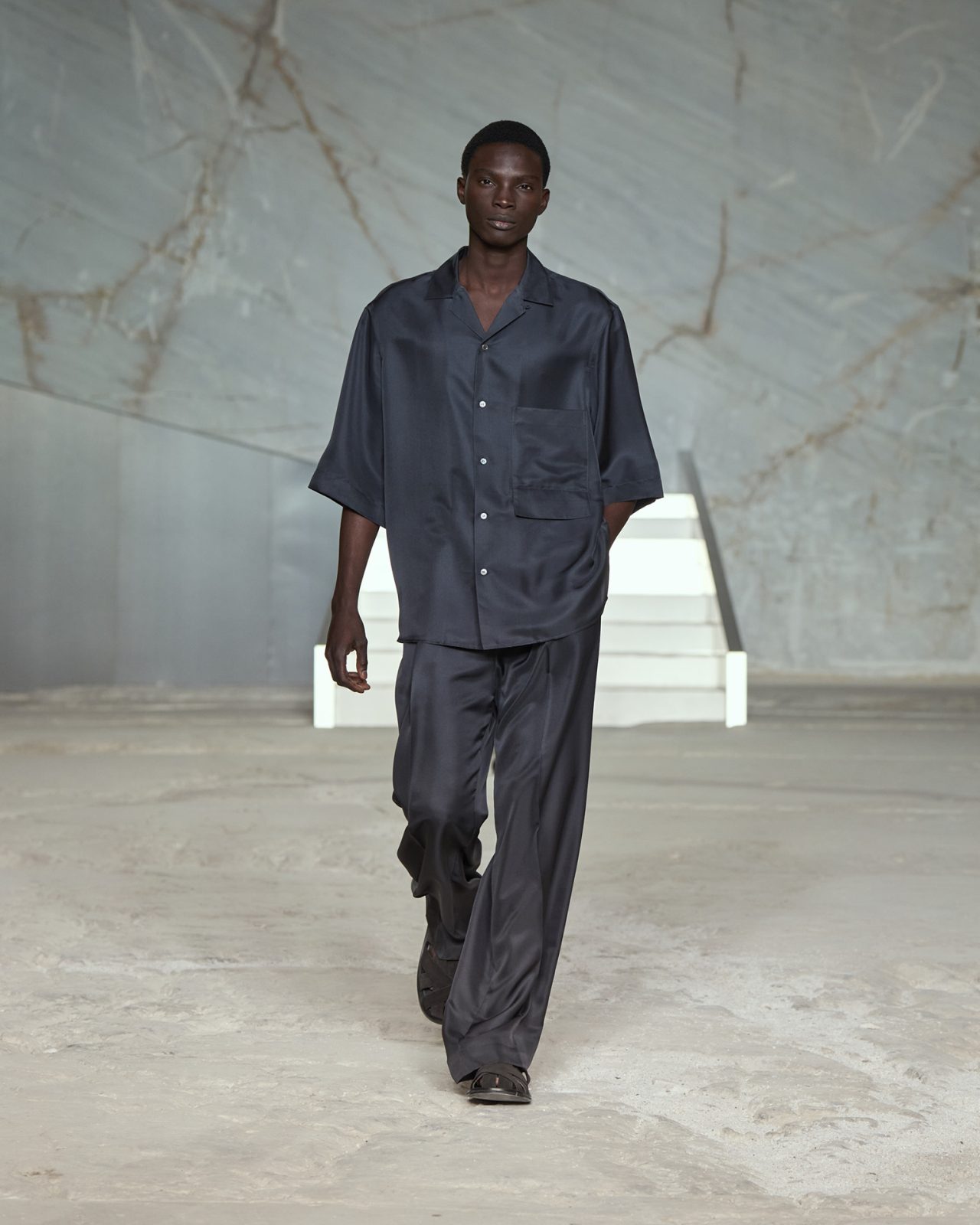 メンズウェアでは、シンプルながらも機能的なアイテムたちが登場。クラシックなテーラリングがノースリーブに落とし込まれ、伝統的なデザインに新たな視点をもたらす。夏の定番でもある、シルクのセットアップは気取らないエレガンスさを、バミューダショーツは洗練されながらもリラックスしたムードを演出。エッセンシャルアイテムの上に重ねられたサマーレザージャケット、柔らかなレザーサンダルやミュールローファーが、現代的なエッジを加えてくれる。