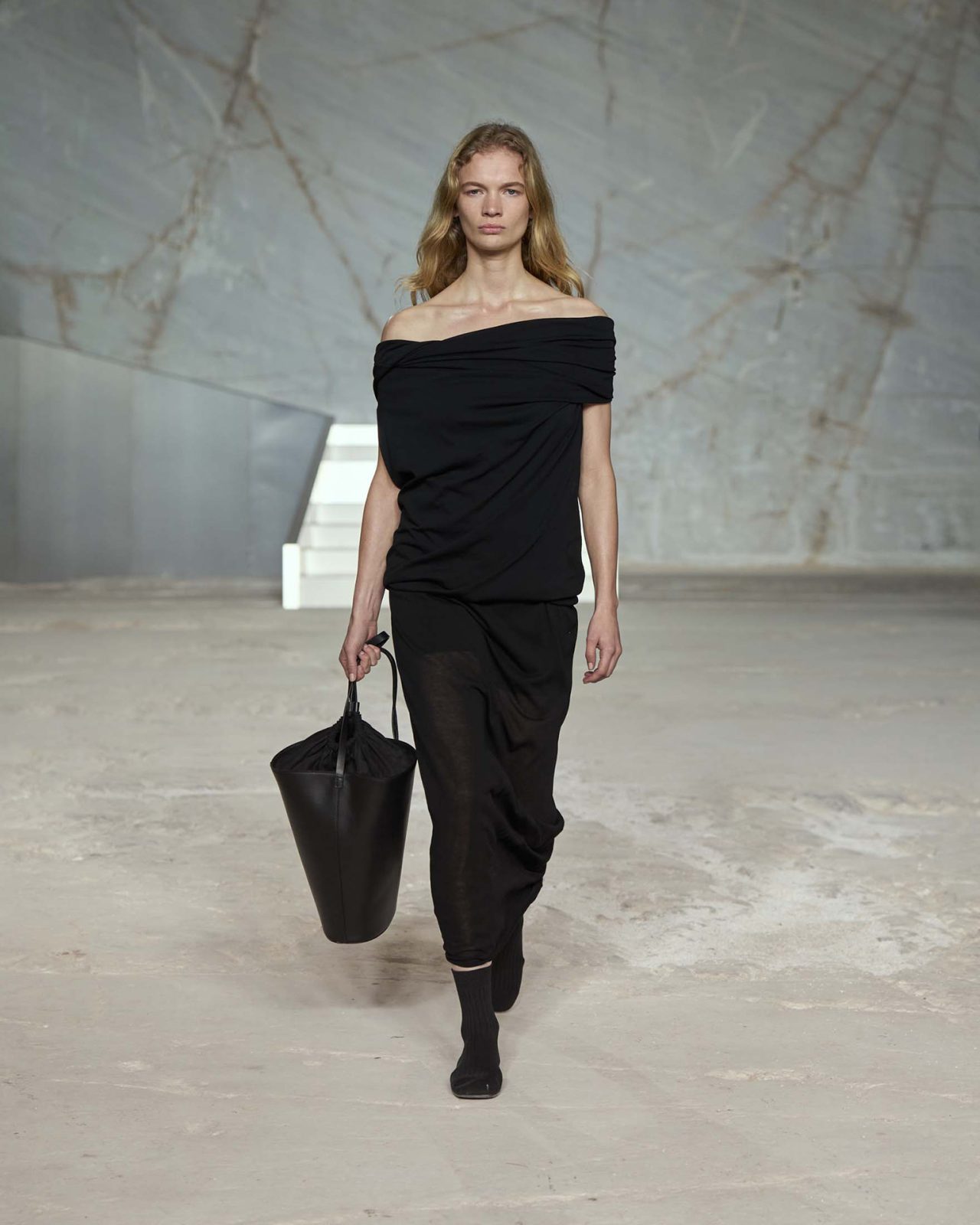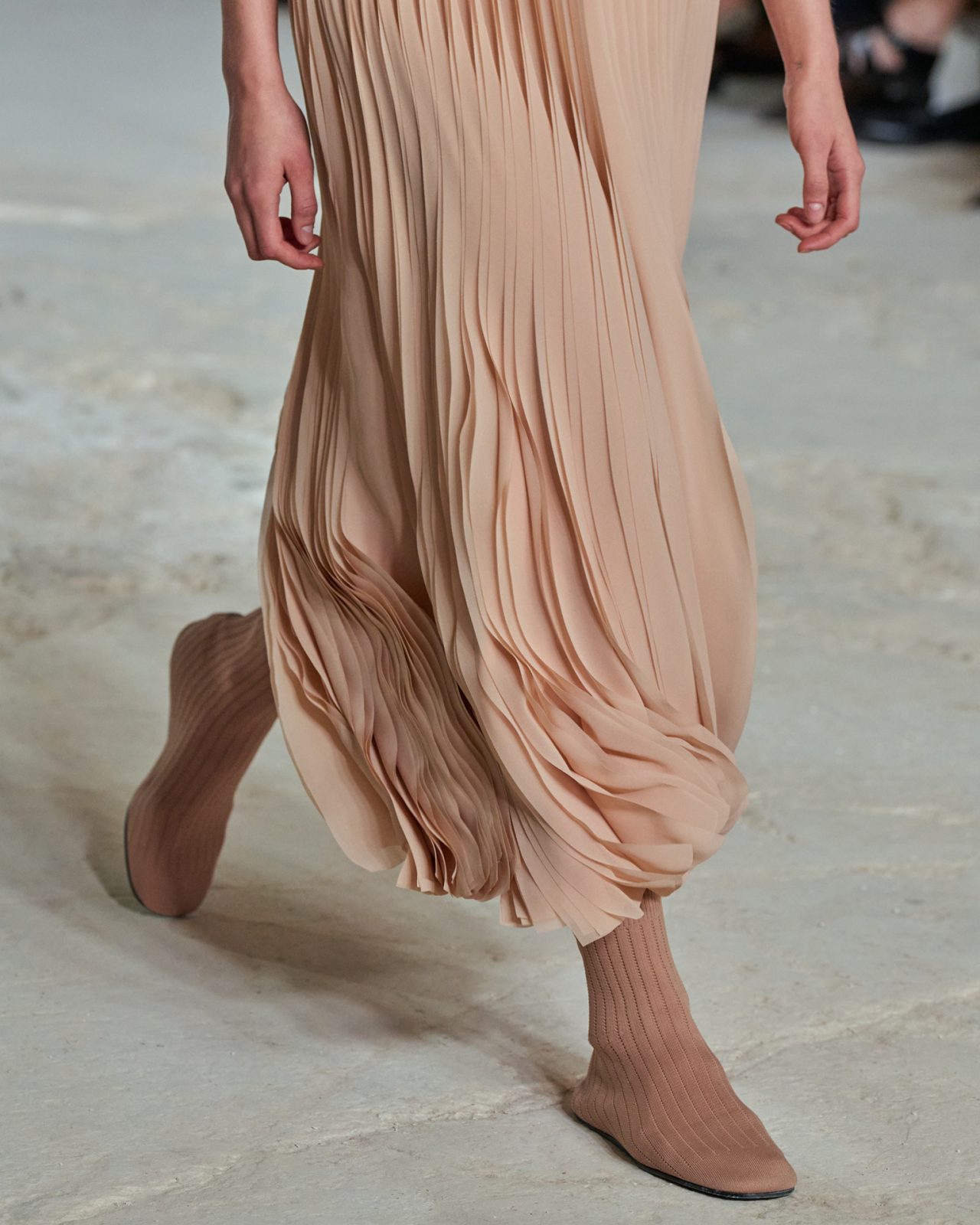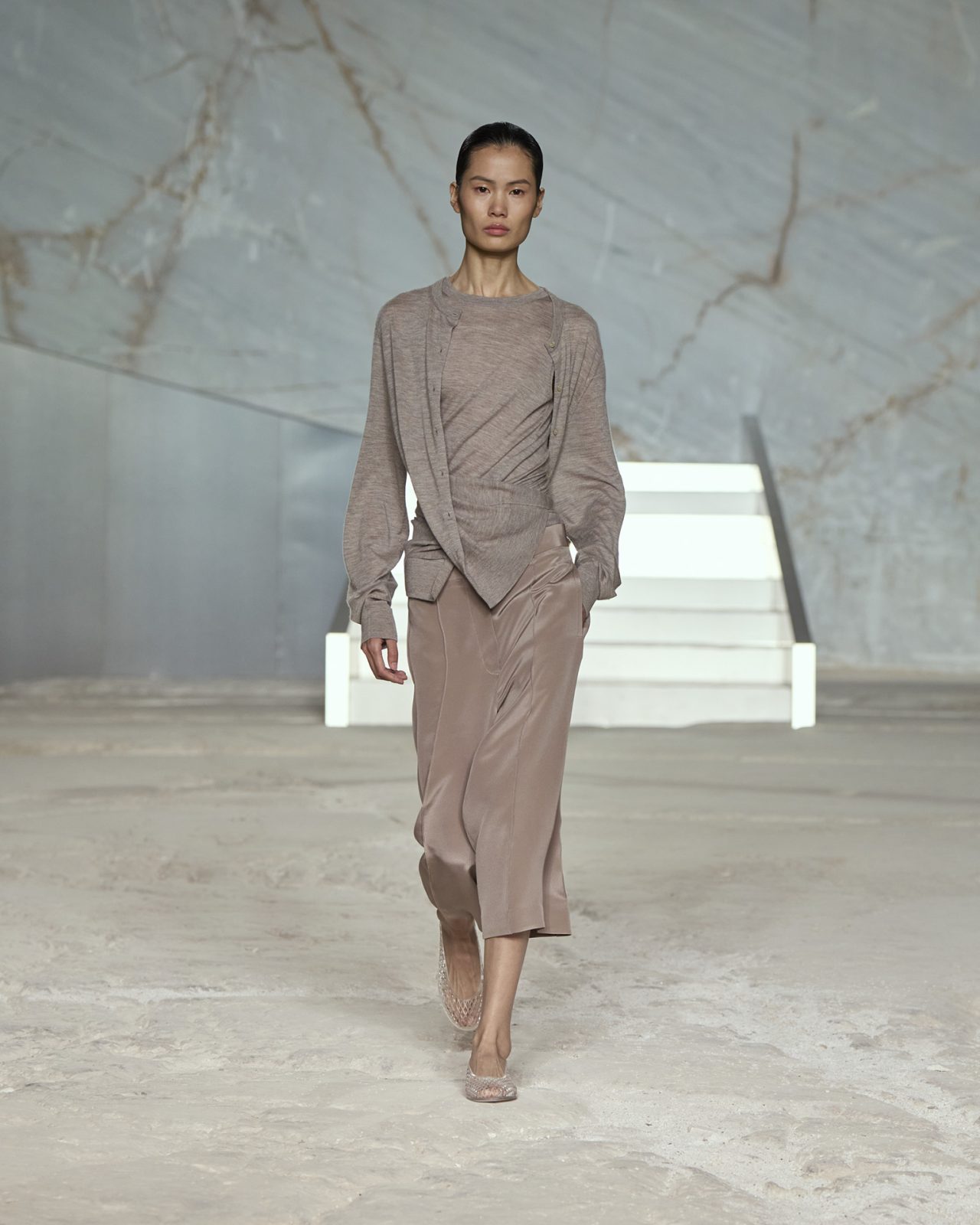ルネサンス芸術から着想を得たウィメンズウェアでは、透け感のある素材で体の輪郭をほのかに見せながら、カスケードのように流れる生地が軽やかに動く。柔らかくも彫刻的なシルエットとドレープが、女性らしいシルエットを形成。それらのルックが、ポインテッドスエードミュールやバレリーナシューズ、ニットソックスブーツで仕上げられた。