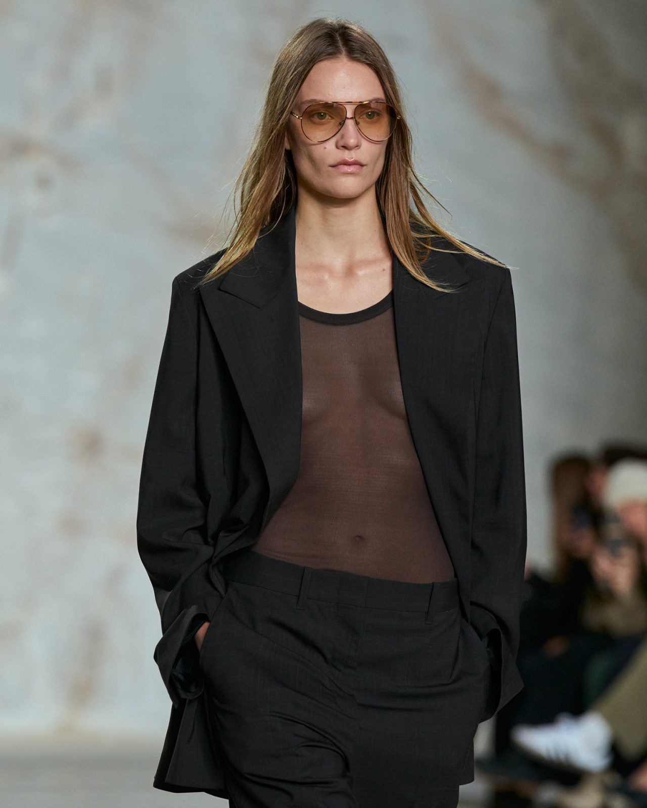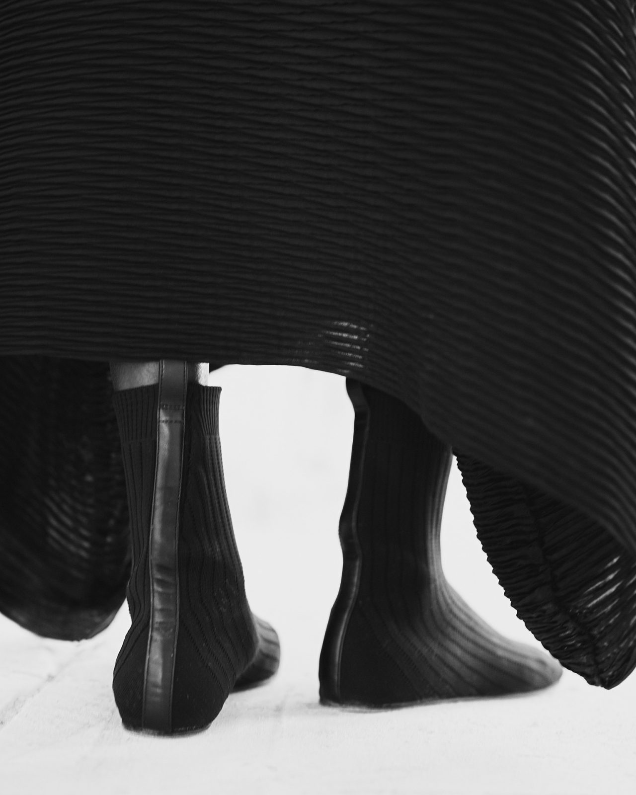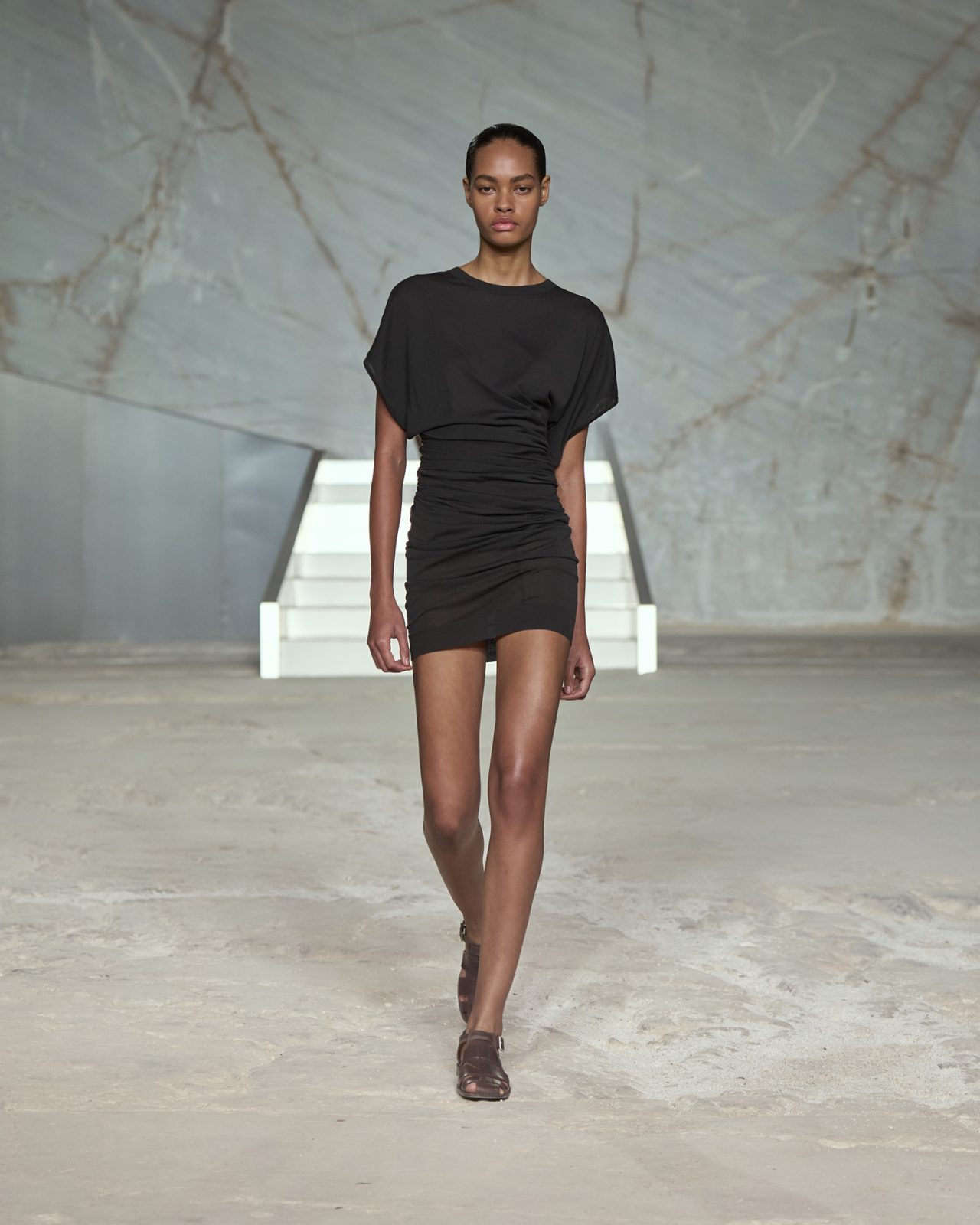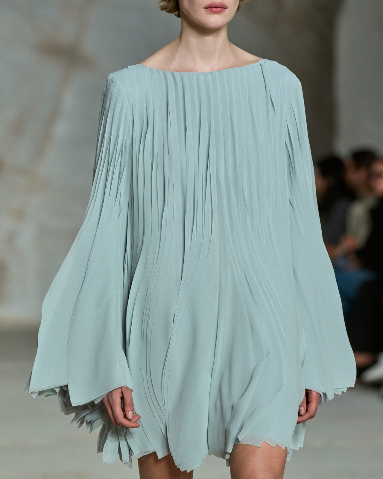 ルネサンス芸術から着想を得たウィメンズウェアでは、透け感のある素材で体の輪郭をほのかに見せながら、カスケードのように流れる生地が軽やかに動く。柔らかくも彫刻的なシルエットとドレープが、女性らしいシルエットを形成。それらのルックが、ポインテッドスエードミュールやバレリーナシューズ、ニットソックスブーツで仕上げられた。