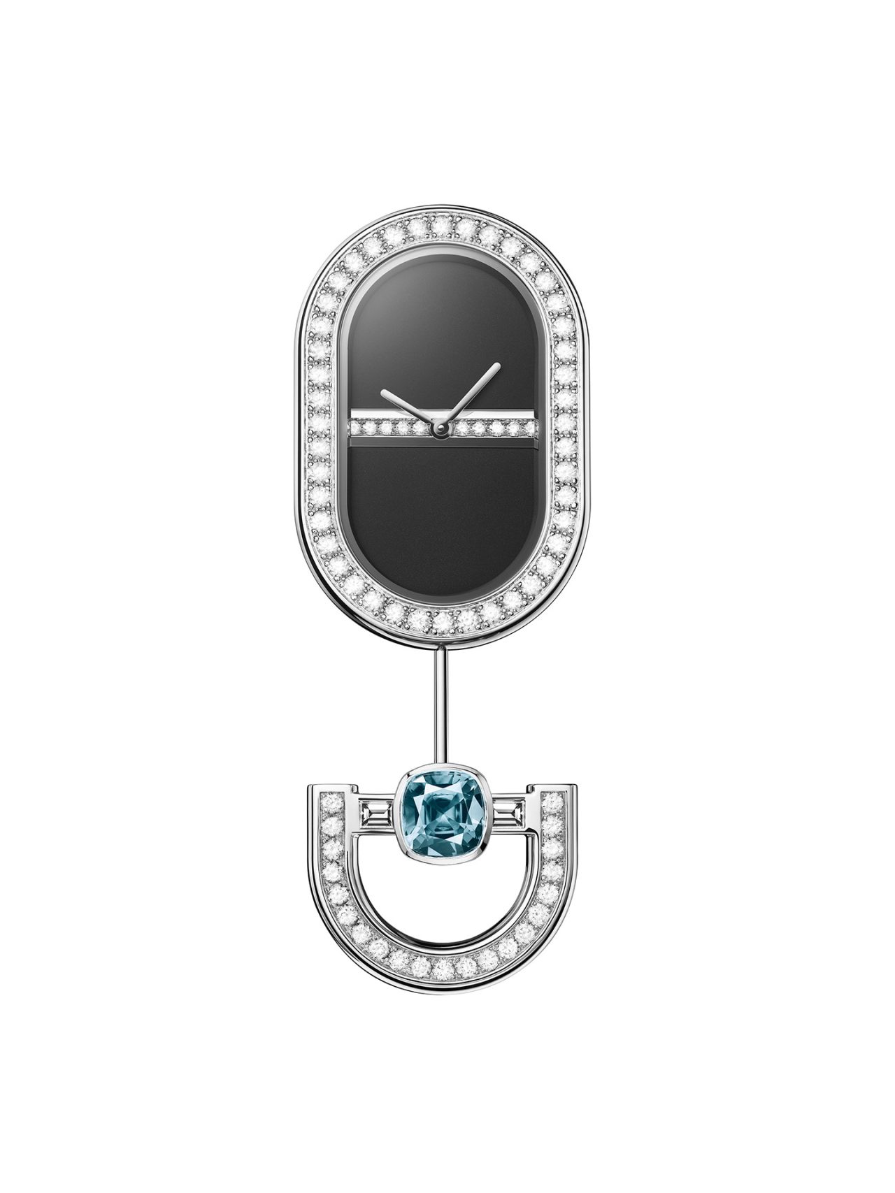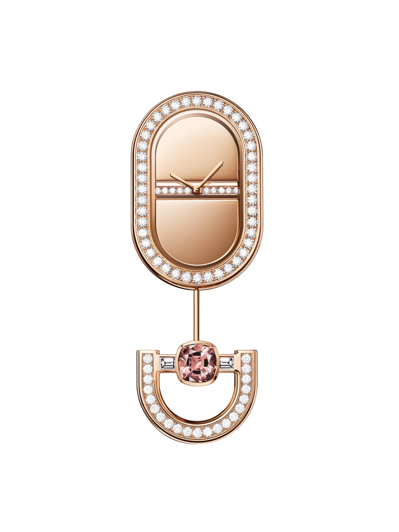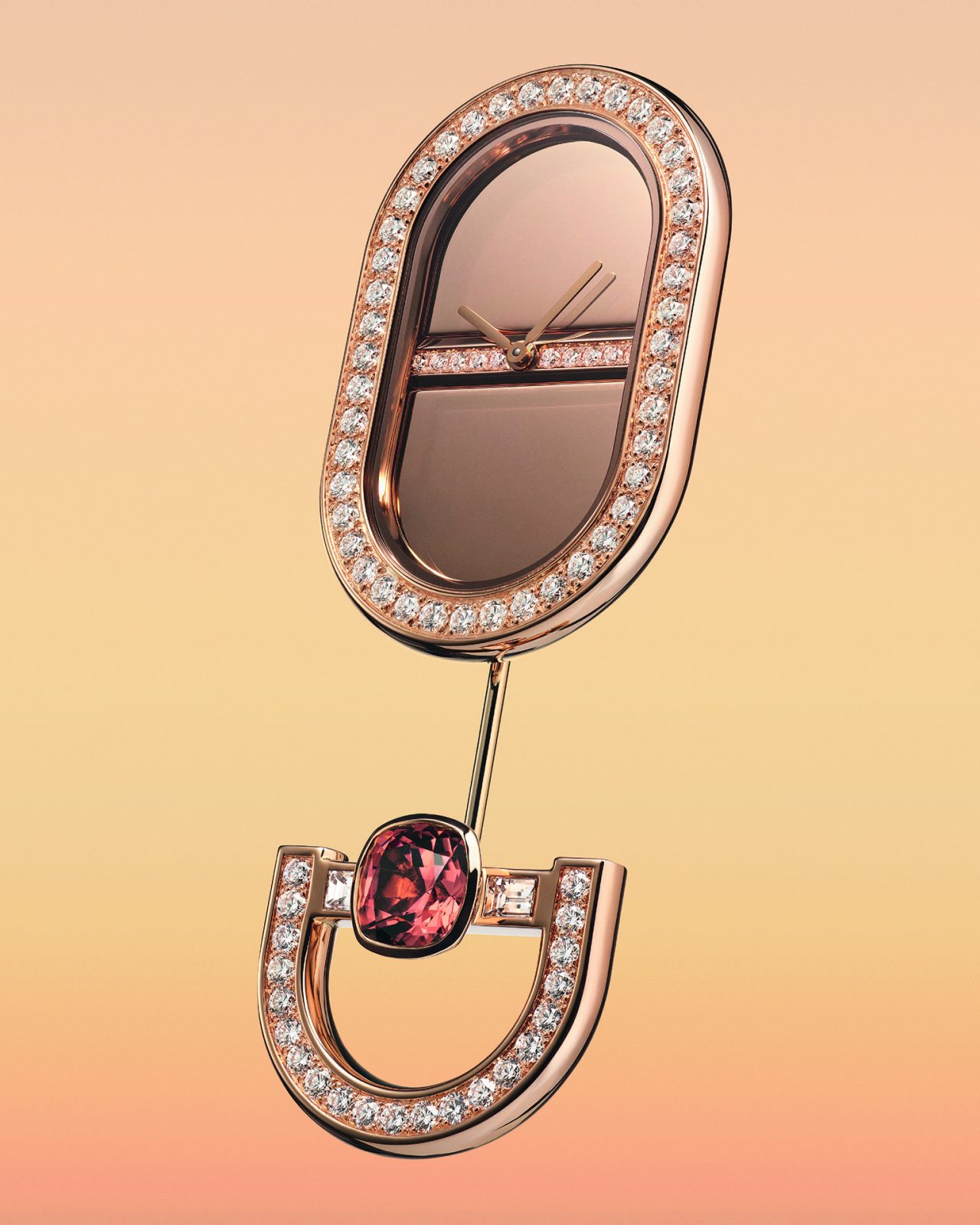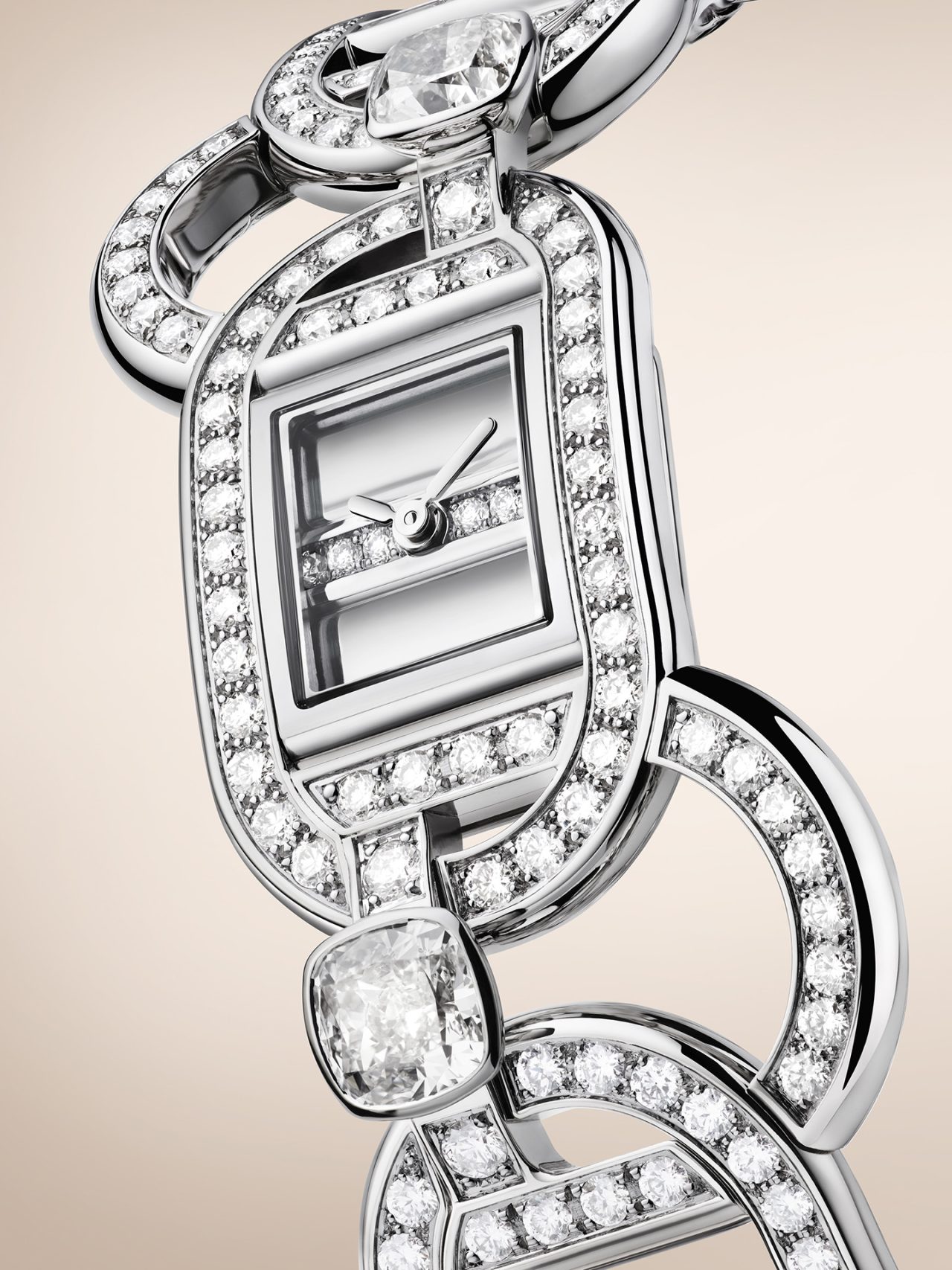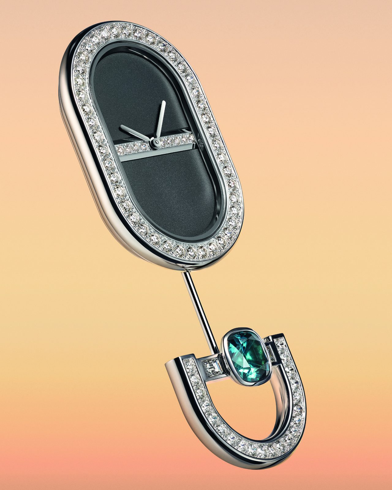 ブランドが新たな領域へと踏み出した証ともいえるのが「マイヨン リーブル」。アイコニックなアンカーチェーンを、腕時計とブローチチェーンにモデルチェンジ。2つのタイムピースにはダイヤモンドを配し、デザインにしなやかさと緊張感を与える。クラシックな男性用アクセサリーであるブローチ時計は、単体で装うことも、レザーコードを通してペンダントとして身につけることも可能だ。