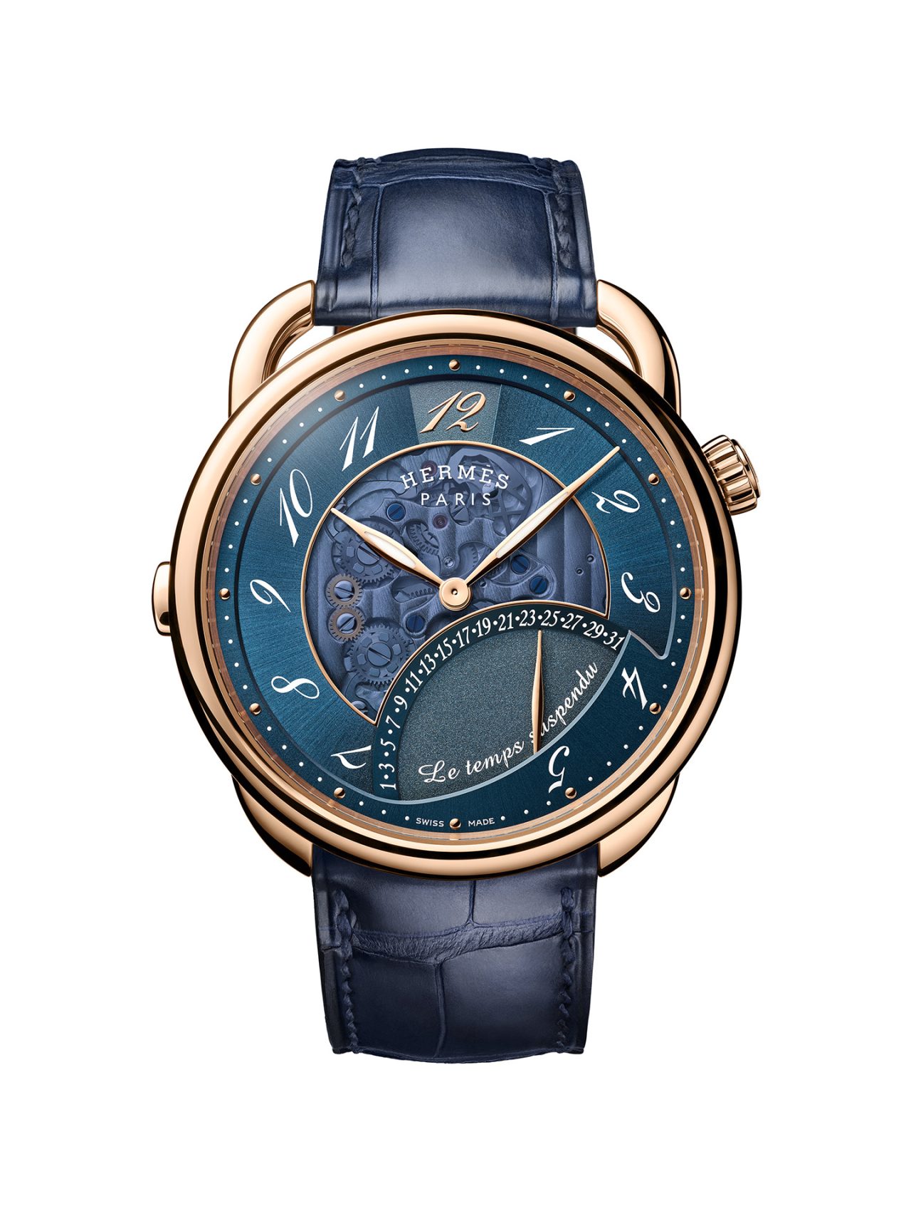 「アルソー タンシュスポンデュ」は、2011年の同モデルからデザインを刷新。透かし細工を施した文字盤の向こうには、エルメス独自のモジュールが垣間見える。ホワイトゴールド、またはピンクゴールドのケースに、サンバースト仕上げのブルー、ブラウン・デゼール、ルージュ・セリエの3つのカラーがエレガントに煌めく。