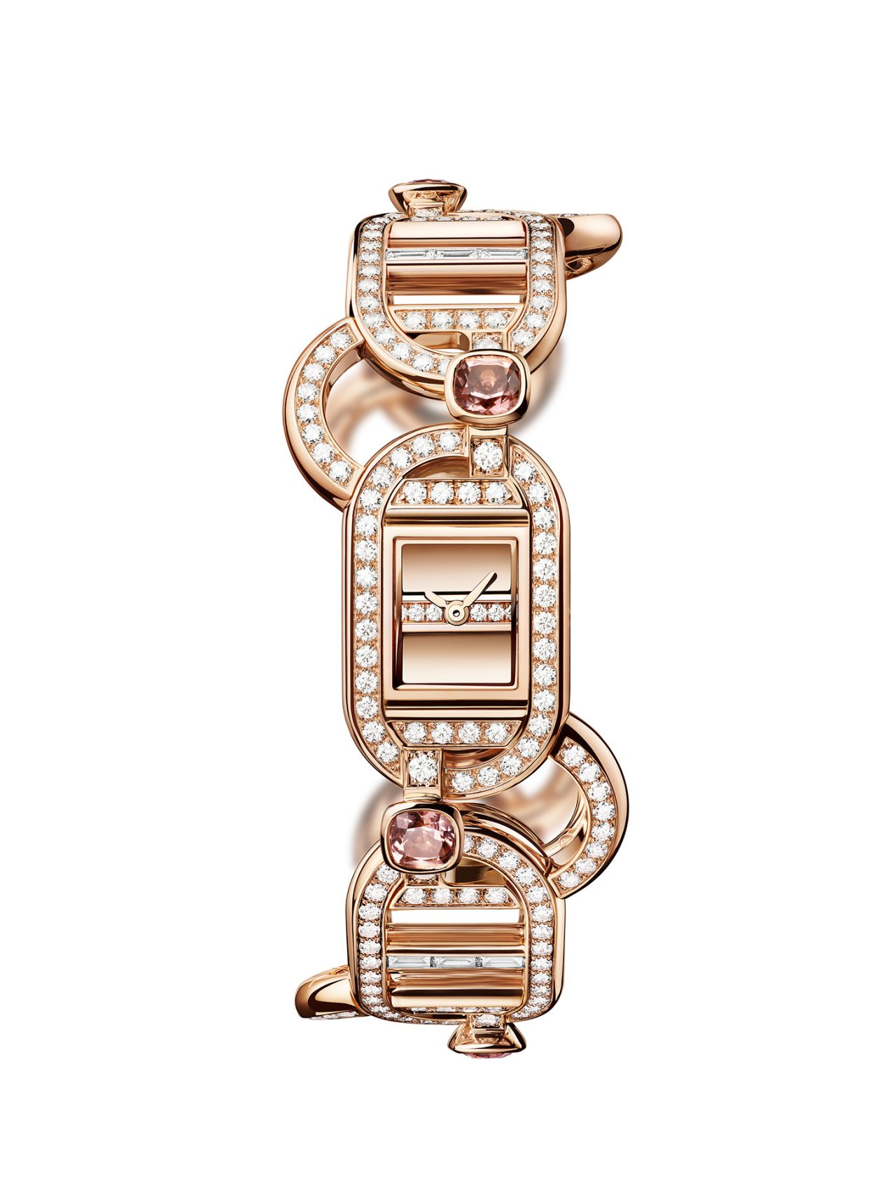 「エルメス カット」コレクションに、初めて複雑機構の技術を取り入れた「エルメス カット タンシュスポンデュ」。シャープなラインと大胆な造形が際立つ39mmのピンクゴールドのケースで、運針には完全に動きを止めるユニークな仕掛けが加えられた。Hermès の遊び心が時間という既成概念を揺さぶり、非日常的な空間を生み出す。赤い文字盤のリミテッドエディションを含め複数のバリエーションが展開されるため、ぜひお気に入りの一つを見つけてみて。