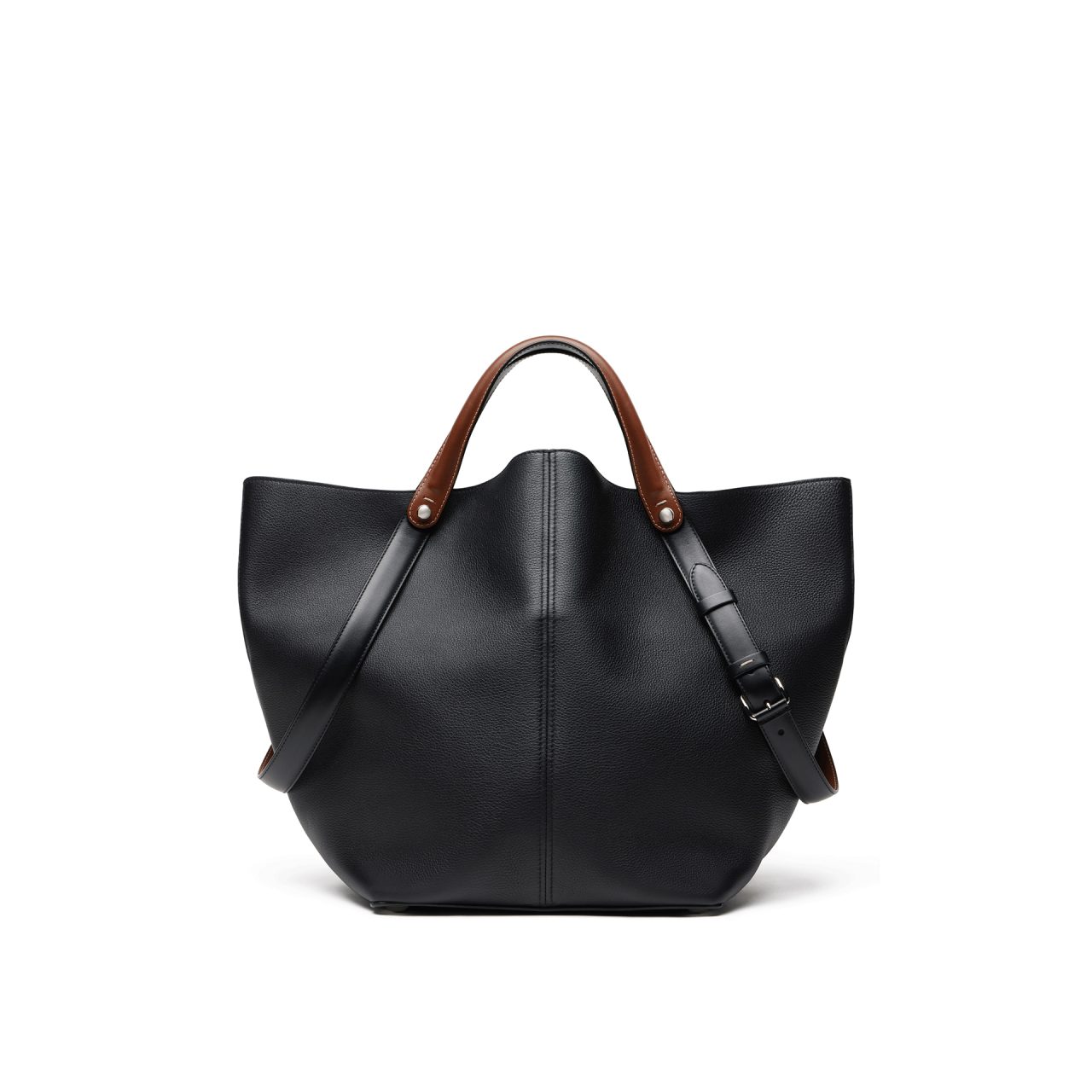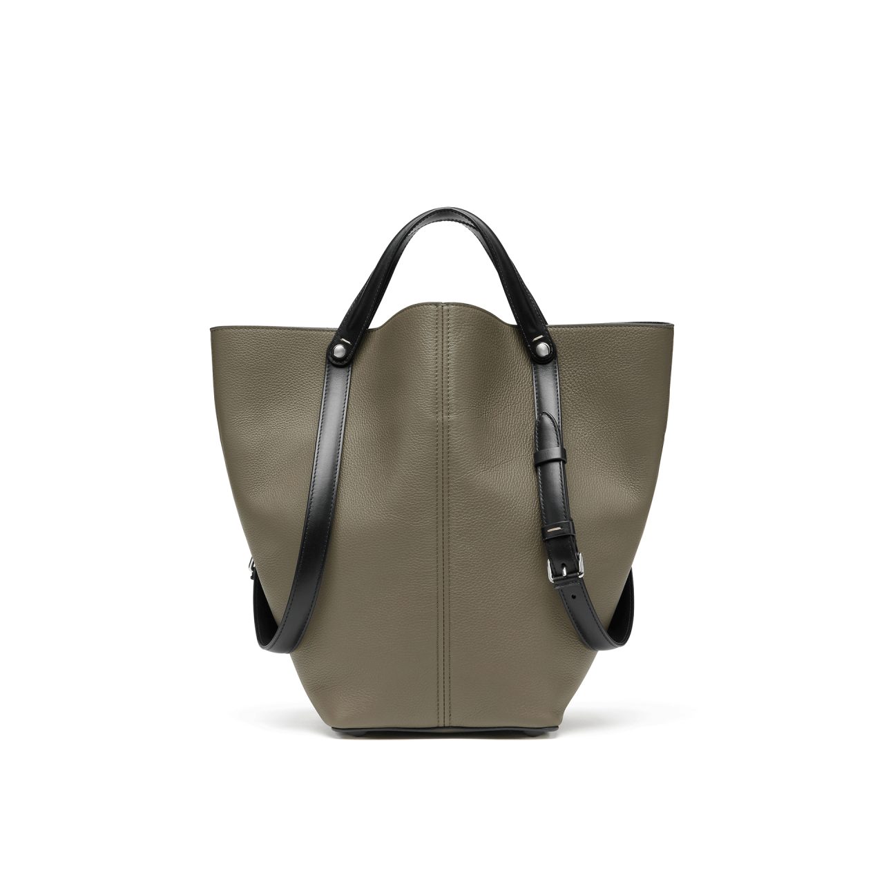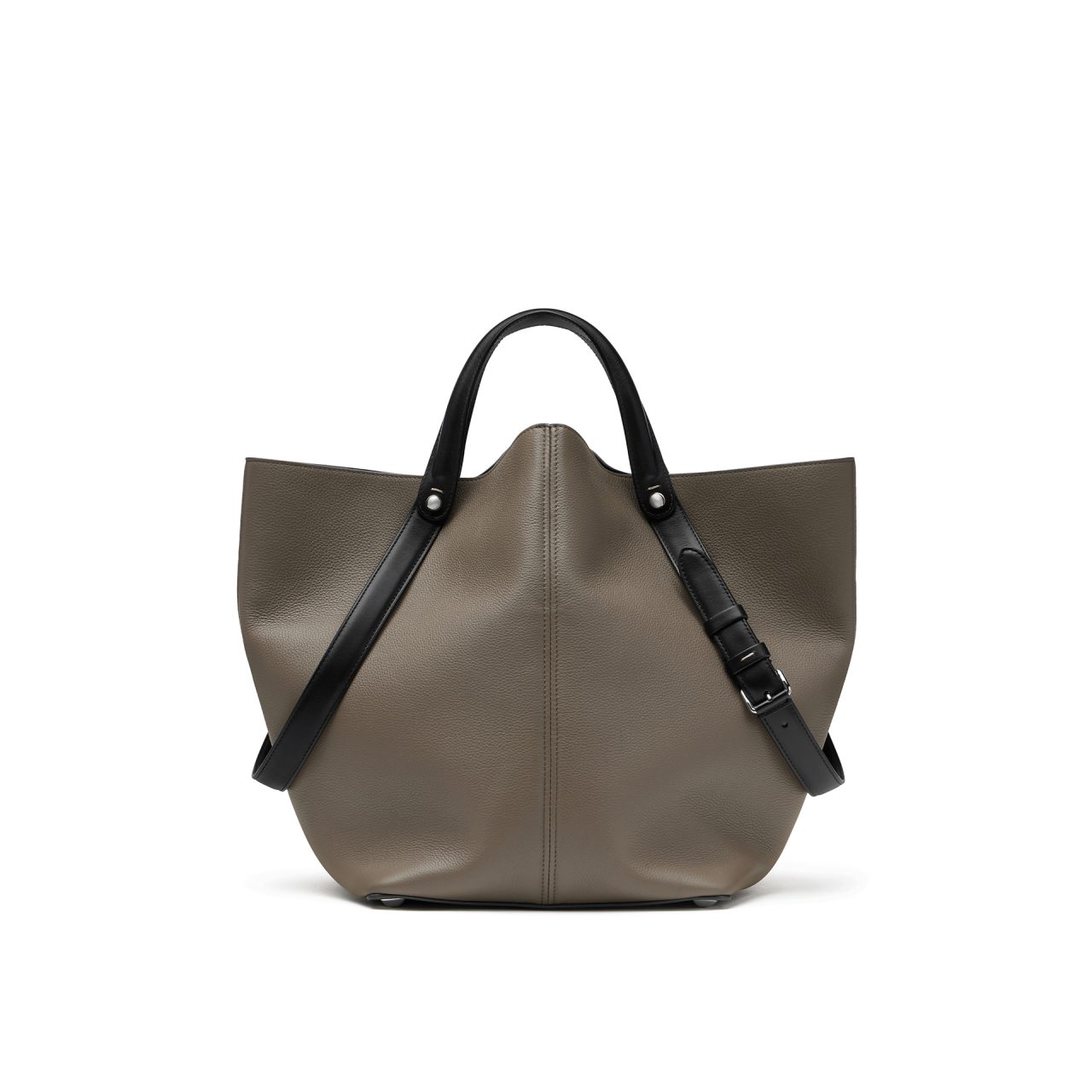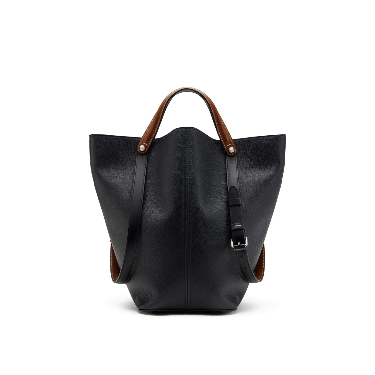 「ドレサージュ」は、厳選された上質なレザーと洗練されたラインが印象的。2通りに使える持ち手は、マグネットで取り付けられており、短いハンドルを持つと長いハンドルが縁に垂れ、また新しい表情を楽しむことができる。