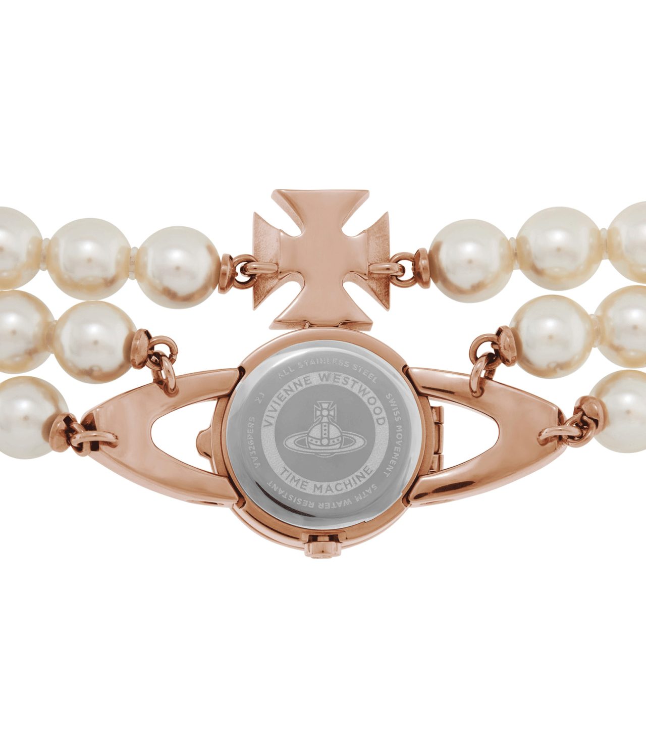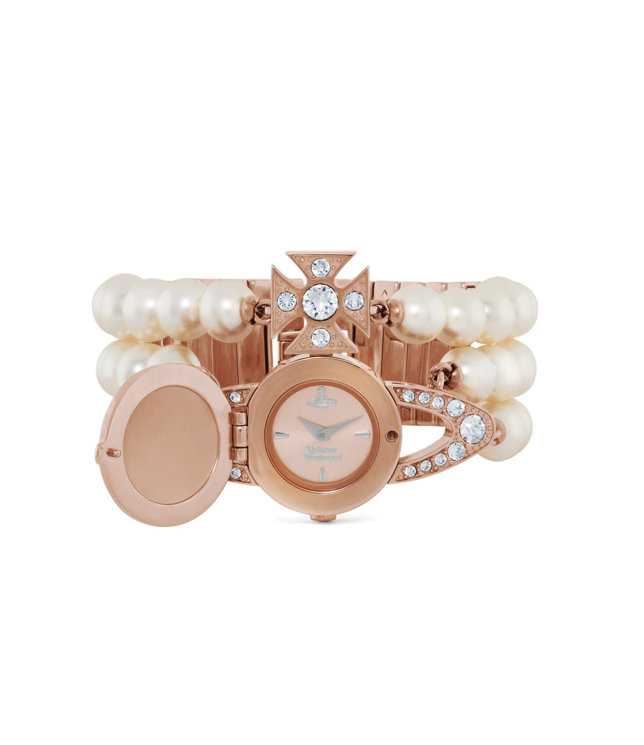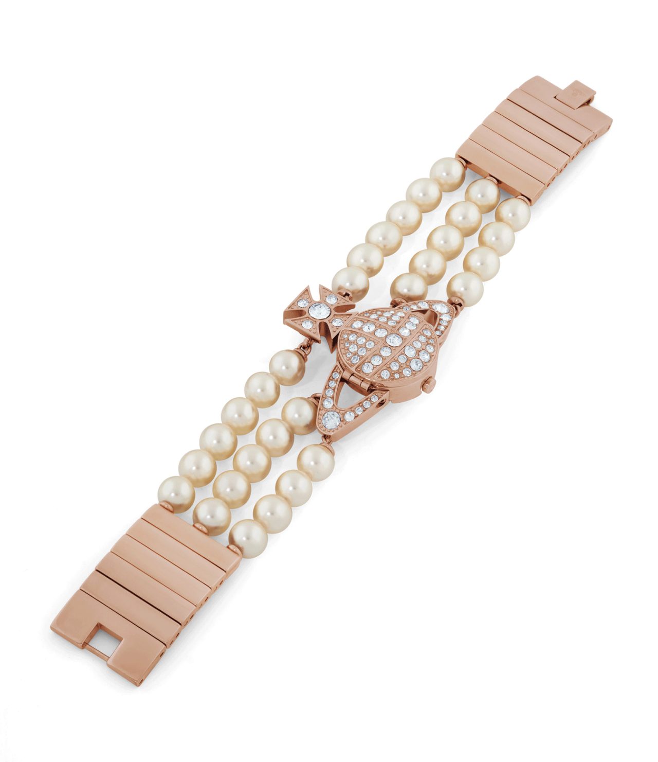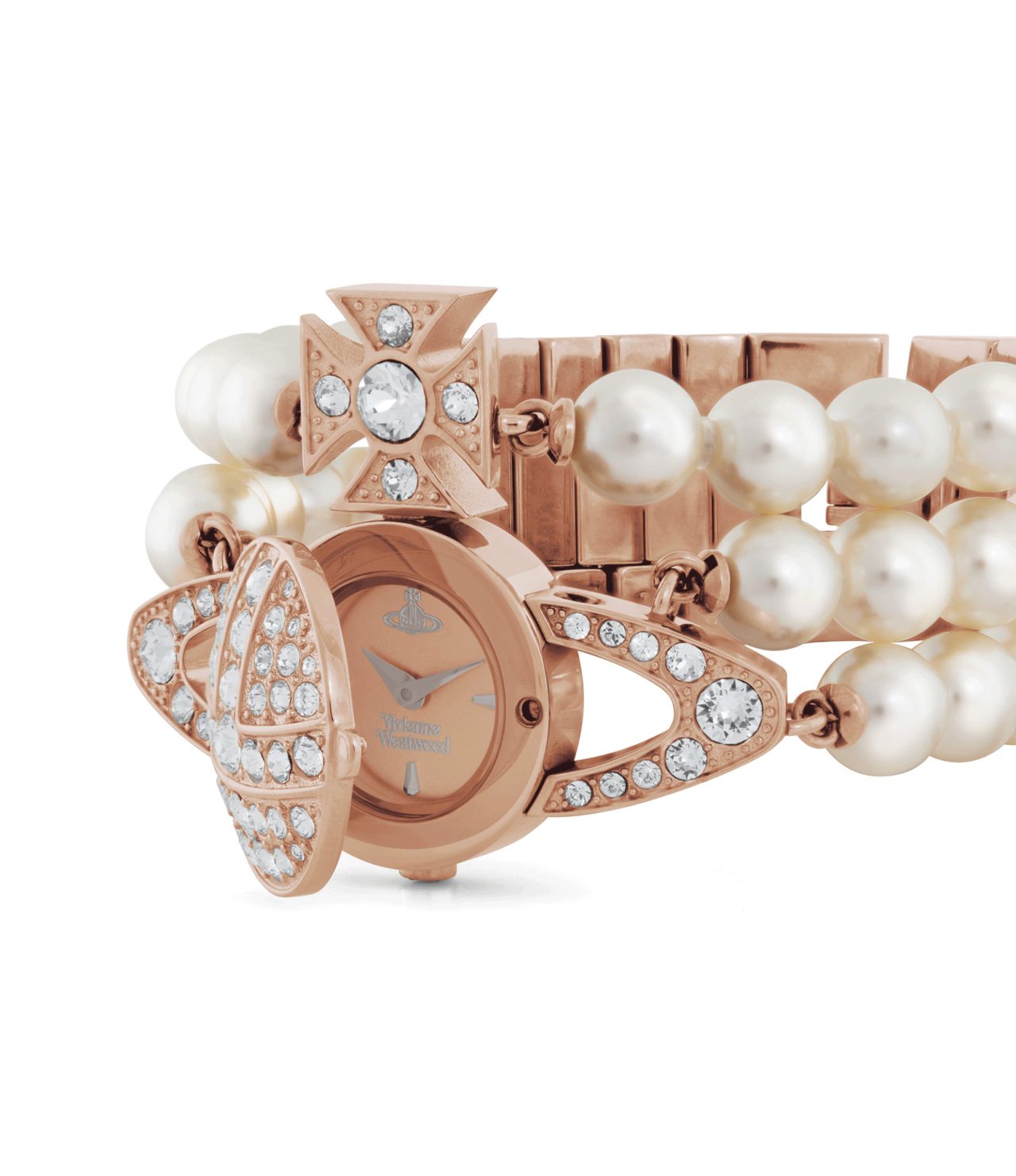 本アイテムのベルト部分は、ジュエリーのような輝きを放つ3連のパールブレスレットを組み合わせたデザインに仕上がっている。開閉式の ORB 内部には、繊細なダイアルとスイス製のムーブメントが搭載され、ローズゴールドカラーのメタルパーツが全体に華やかさを添えている。他と差をつけるなら、ファンならずとも Vivienne Westwood のアイコニックなデザインを時計で取り入れてみては。