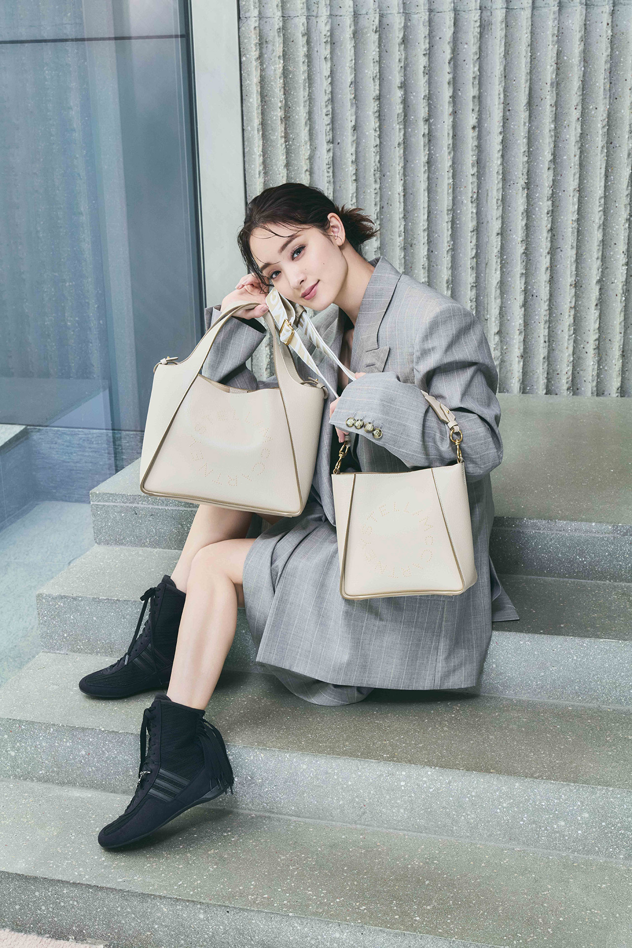 アイコニックなステラ ロゴが、フロントにパンチングやスタッズであしらわれ、さりげなくも確かな存在感を放つ「ステラ ロゴ」シリーズ。洗練されたタイムレスなデザインが、剛力彩芽のエフォートレスな魅力を引き立てた。