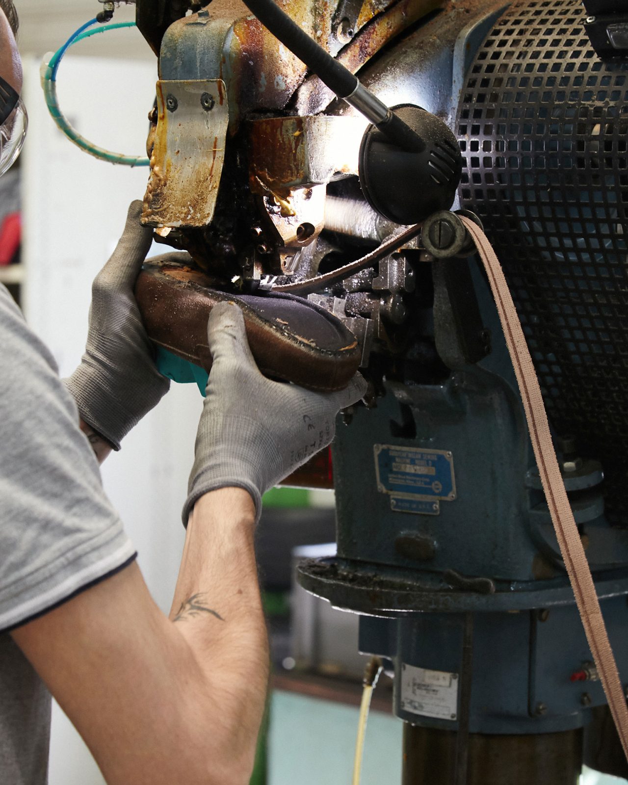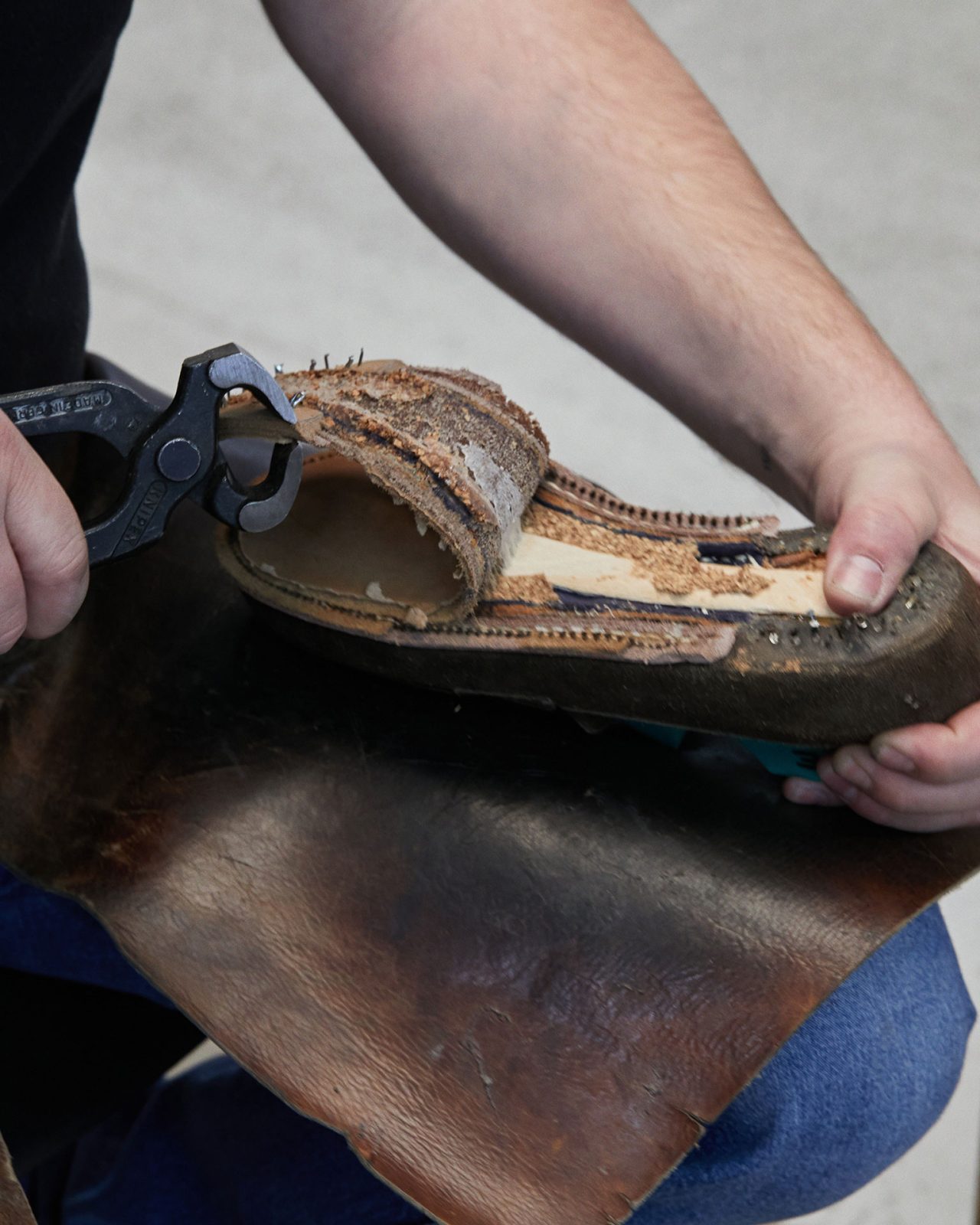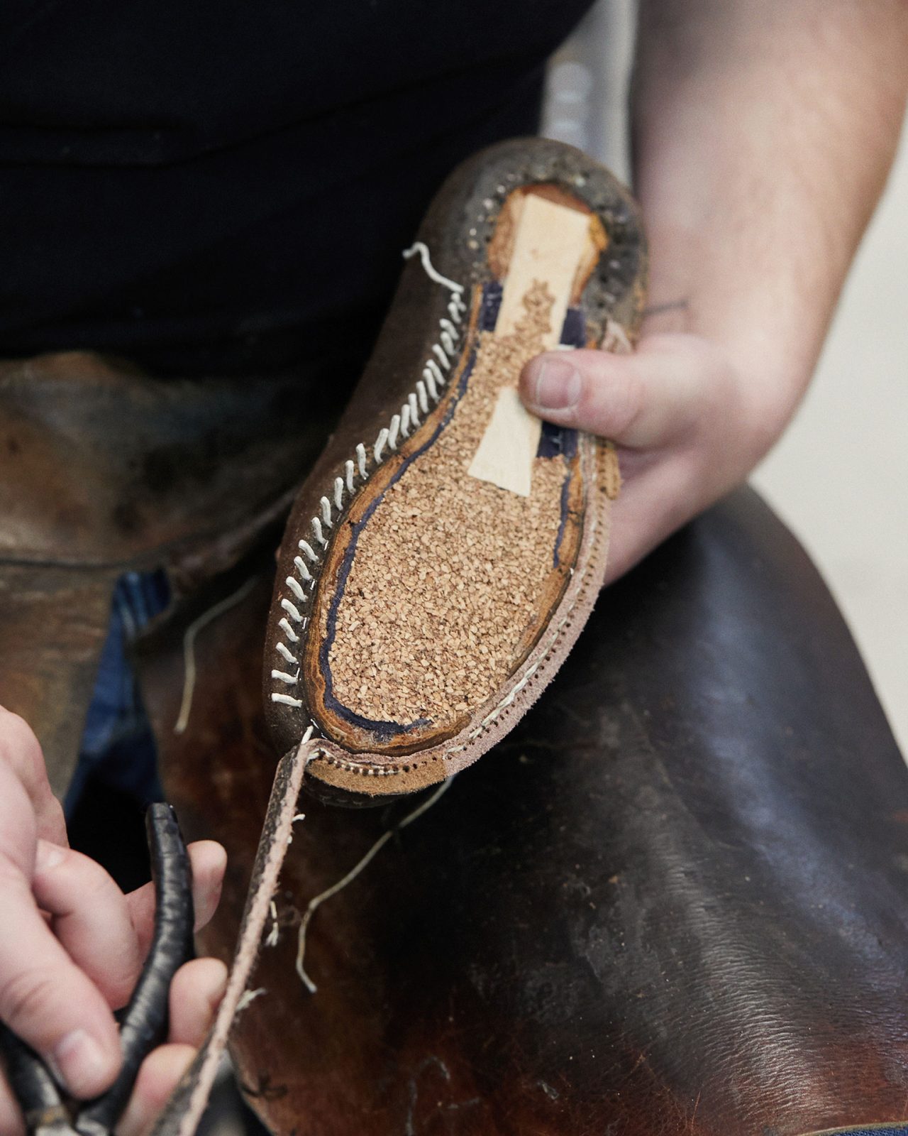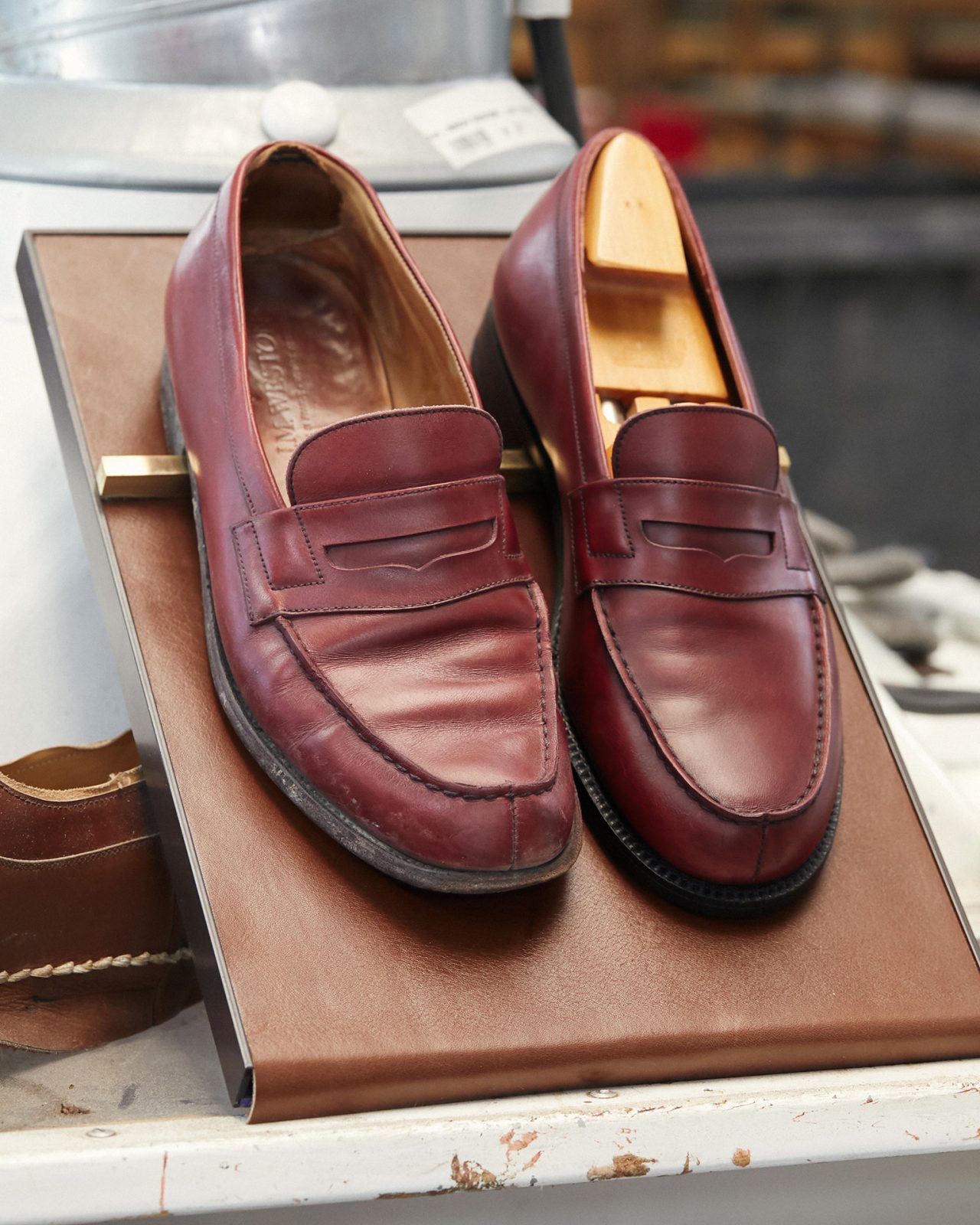 シューズを大切に長く履き続けてもらいたいという願いから、リモージュの工場内に修理工房を設け、専門の職人が手作業で修理・再生してきた J.M. WESTON。そんなブランドのコミットメントによりたどり着いたのが、ブランド初となるサスティナビリティにフォーカスしたコレクションとして2020年秋冬シーズンに発表された「WESTON VINTAGE」。役目を終えて回収された J.M. WESTONのシューズが、リモージュの工房で新しくソールやインナーを交換することで、新品と見間違えるような美しさと、以前の持ち主が大切に履き込んだ風合いが加わった、一足一足の雰囲気が異なる一点物に生まれ変わっている。
