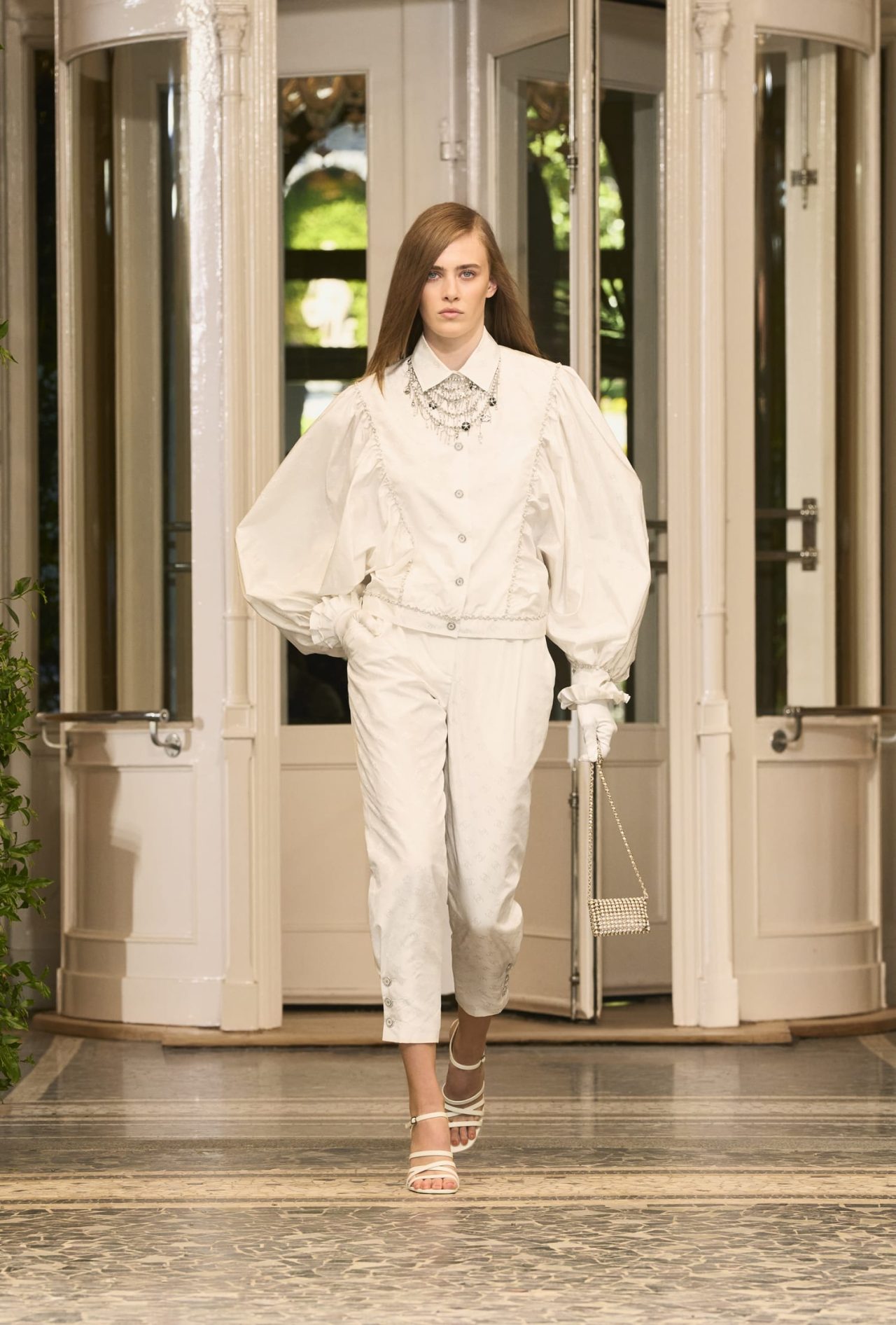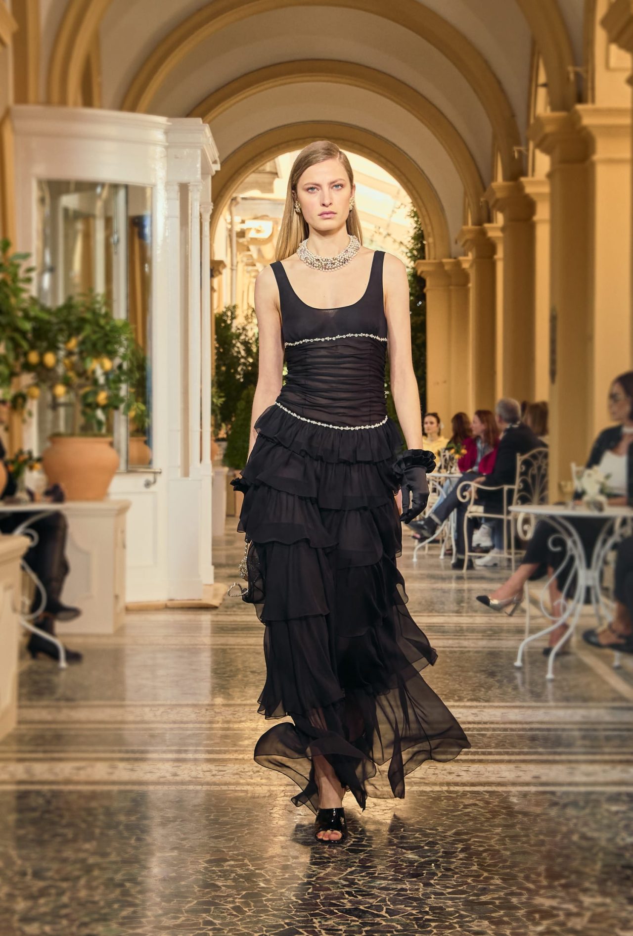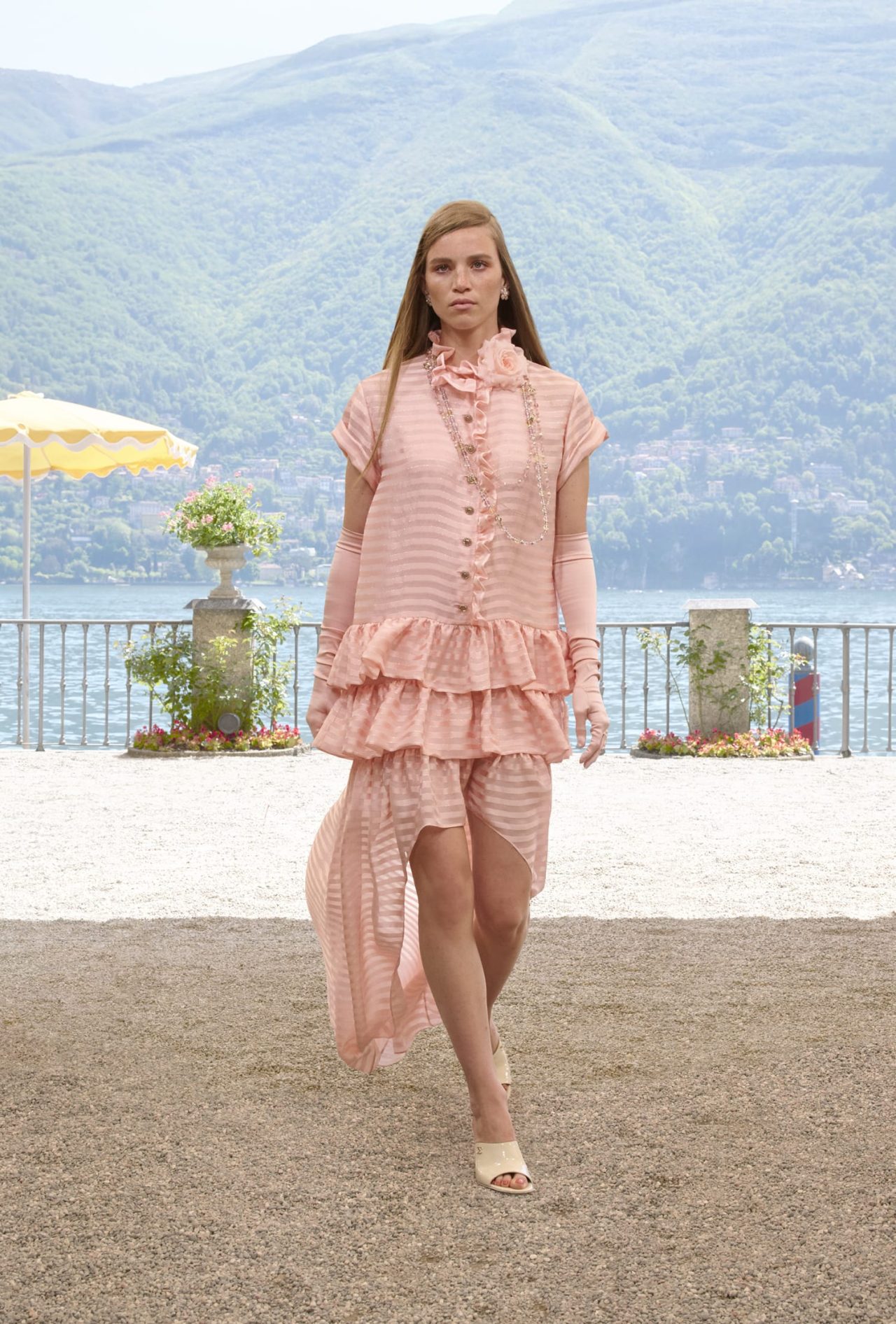 イタリア コモ湖の湖畔にある歴史あるホテル ヴィラ デステを舞台とした CHANEL 2025/26年クルーズ コレクション ショー。「ホテルで過ごす休日」をテーマに静けさとラグジュアリーが交差する瞬間を表現した。Gabrielle Chanel の友人であり、頻繁にコモ湖を訪れていた映画監督 Luchino Visconti (ルキノ・ヴィスコンティ) の世界観を思わせるドラマティックなロングケープやタフタドレスが登場。ボリューム袖や繊細な刺繍、ビーズ装飾のブラウス、花のモチーフが散りばめられたスーツやドレスなどロマンティックなディテールが並ぶ。白いストレートパンツ、ピーコート、ストライプ柄のパンツスーツやポロシャツなどクルーズコレクションらしいリゾート要素と都会的なスタイルが融合した。