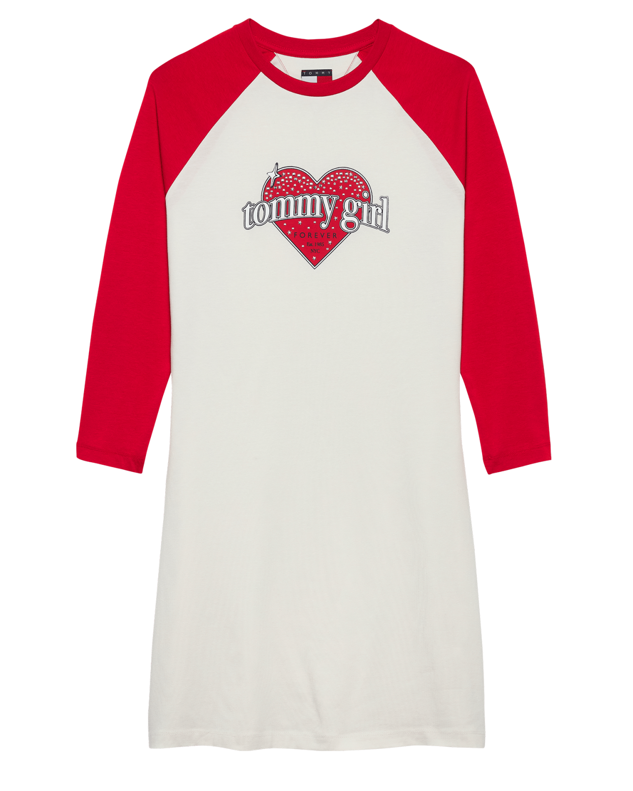 本コレクションのハイライトでもあるラグビーシャツは、クラシックなプレッピースタイルをより大胆に表現。ラインストーンをあしらったリンガーTシャツドレスは、季節のムードとブランドのアイデンティティをモダンに表現する仕上がりとなっている。