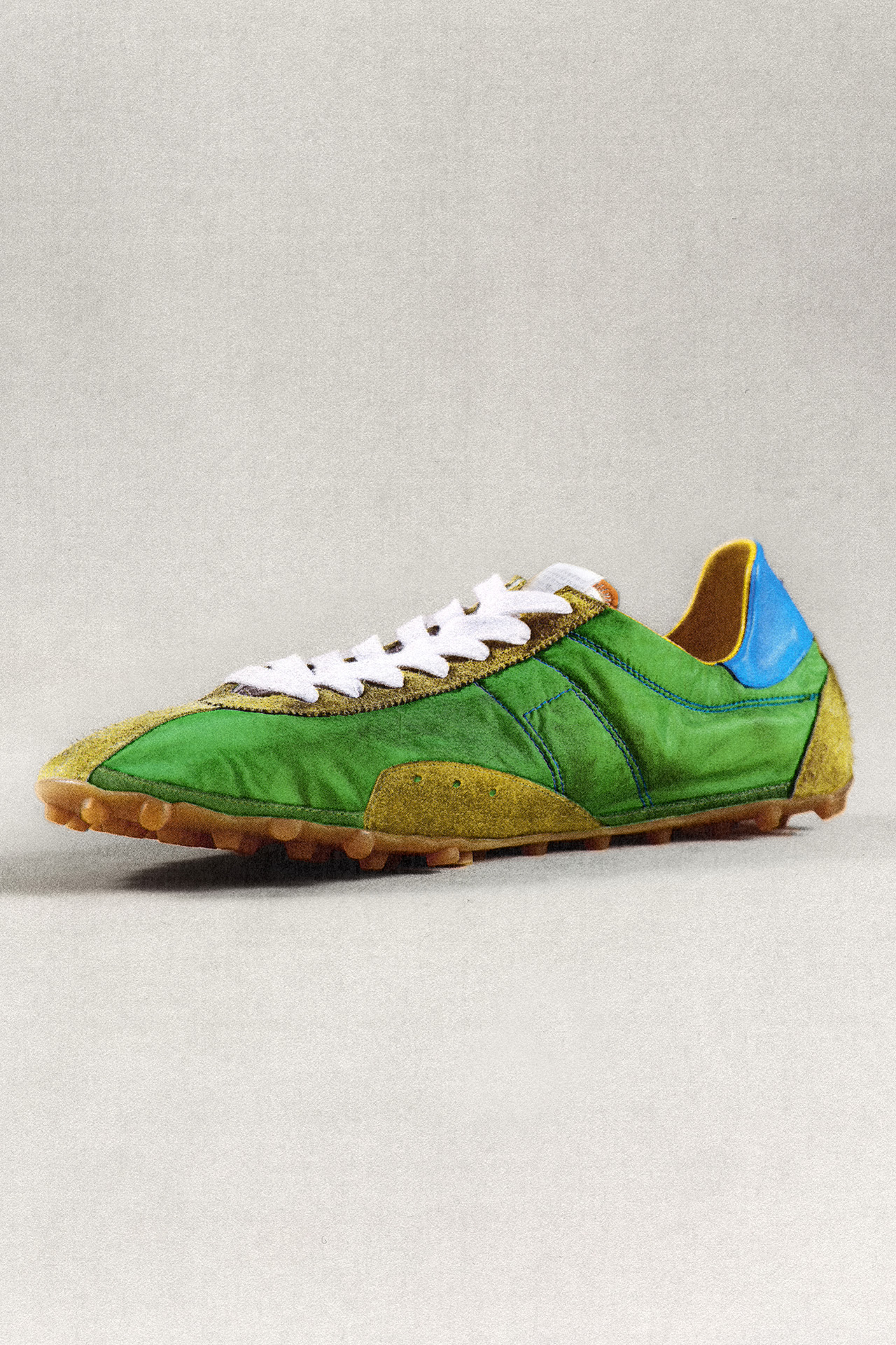 ブランドから新たに登場する スプリンターズ は、Maison Margiela の伝統である過去の衣服の再解釈に加え、エイジング加工の施されたアイテム。20世紀中頃の陸上競技用シューズからインスパイアされており、ソールのクッション性のあるラバーとスパイク状のトラックソールがクラシックな雰囲気を活かしつつ、快適さも備わっている。