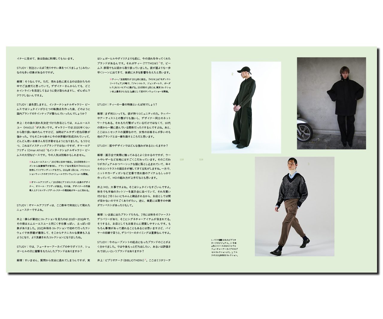 収録内容は、日本のストリートファッションに多大な影響を与え続けるファッション・カルチャープロデューサー 藤原ヒロシと、Dos Monos (ドスモノス) のメンバーでラッパーの TaiTan (タイタン) によるメディア初となる対談。さらに、パリコレでも注目を集める AURALEE (オーラリー) のデザイナー 岩井良太、TOKYO FASHION AWARD 2022を受賞した KIDILL (キディル) のデザイナー 末安弘明のロングインタビューも掲載される。