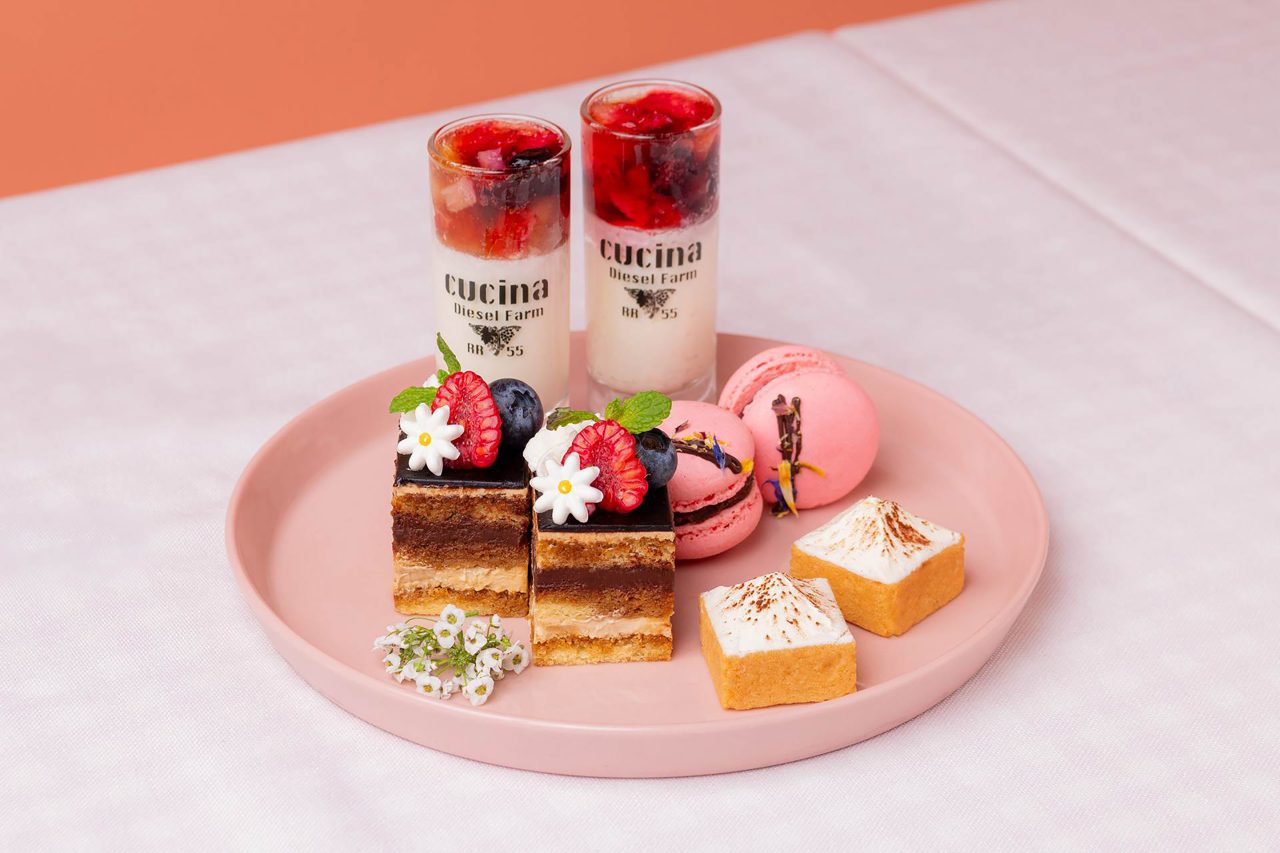 DIESEL の創始者 Renzo Rosso (レンツォ・ロッソ) の故郷である、イタリア北東部マロスティカの豊かな自然と文化を背景に誕生したレストラン「Cucina Diesel Farm」。そんな店内の暖かな雰囲気に寄り添うような、ピンクゴールドのティースタンドが新たにお目見えした。一段目には、イタリアの伝統的なモンブラン「モンテビアンコ」や、Cucina Diesel Farm のロゴがデザインされ、グラスに美しく盛りつけられた「パンナコッタと4種のベリー 紅茶のジュレ」、さらに「チョコレートケーキ」や「自家製チョコサラミのマカロン」など、遊び心とこだわりの詰まったプティフールがラインナップする。