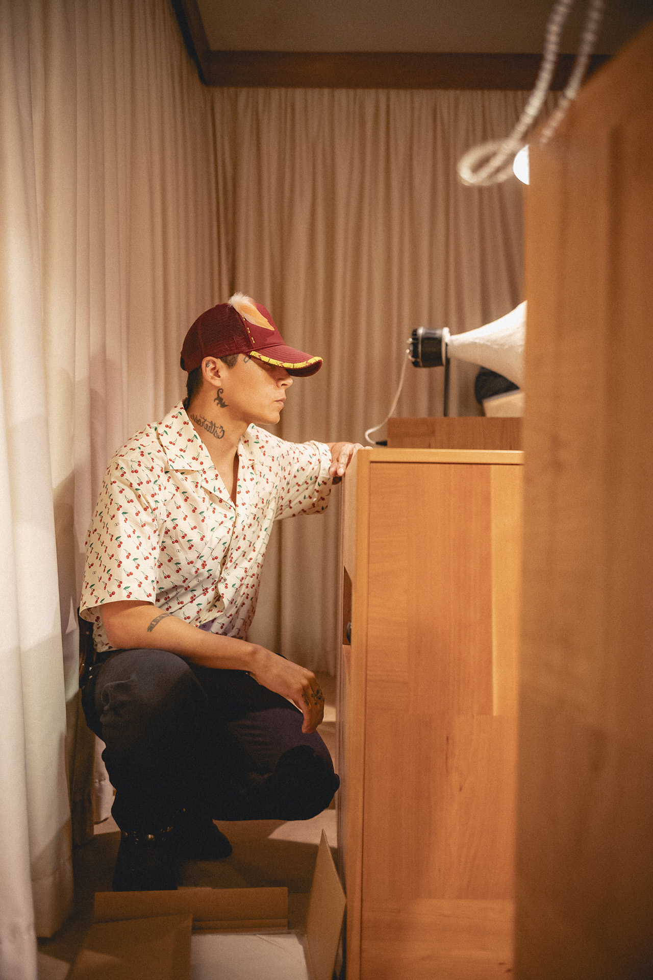 VALENTINO は、Ruggero Pietromarchi (ルッジェーロ・ ピエトロマルキ) が設立した Terraforma と共同で、音楽と建築が融合した没入型サウンドスペース「L’Atelier Sonore」を創出した。音の質にこだわるだけでなく、音を聴き、感じる環境にも細部にわたる配慮が施されており、訪れる人々に深い音楽体験を提供する。テラフォーマのキュレーションと、サウンドデザイナー Giorgio Di Salvo (ジョルジョ・ディ・サルヴォ) が特別に制作した音響が、静かに音に浸る空間を創り上げた。また、ブランドとのコラボレーションにより空間デザインを手がけた建築家 Francesco Lupia (フランチェスコ・ルピア) は、伝統的な家具製作から着想を得て、音楽と建築が調和する空間を演出。特注の多機能リスニングコンソールや、ベルベットのクッションを備えたモジュール式シートなど、3つの主要な要素を組み込み、木材を用いた精巧なパッチワークで覆うことで、クラフツマンシップと親密さを強調した。
