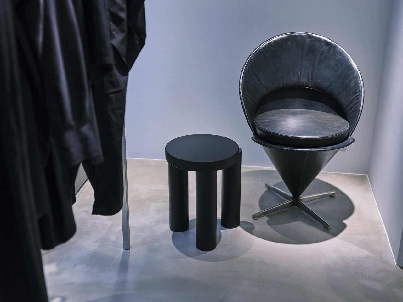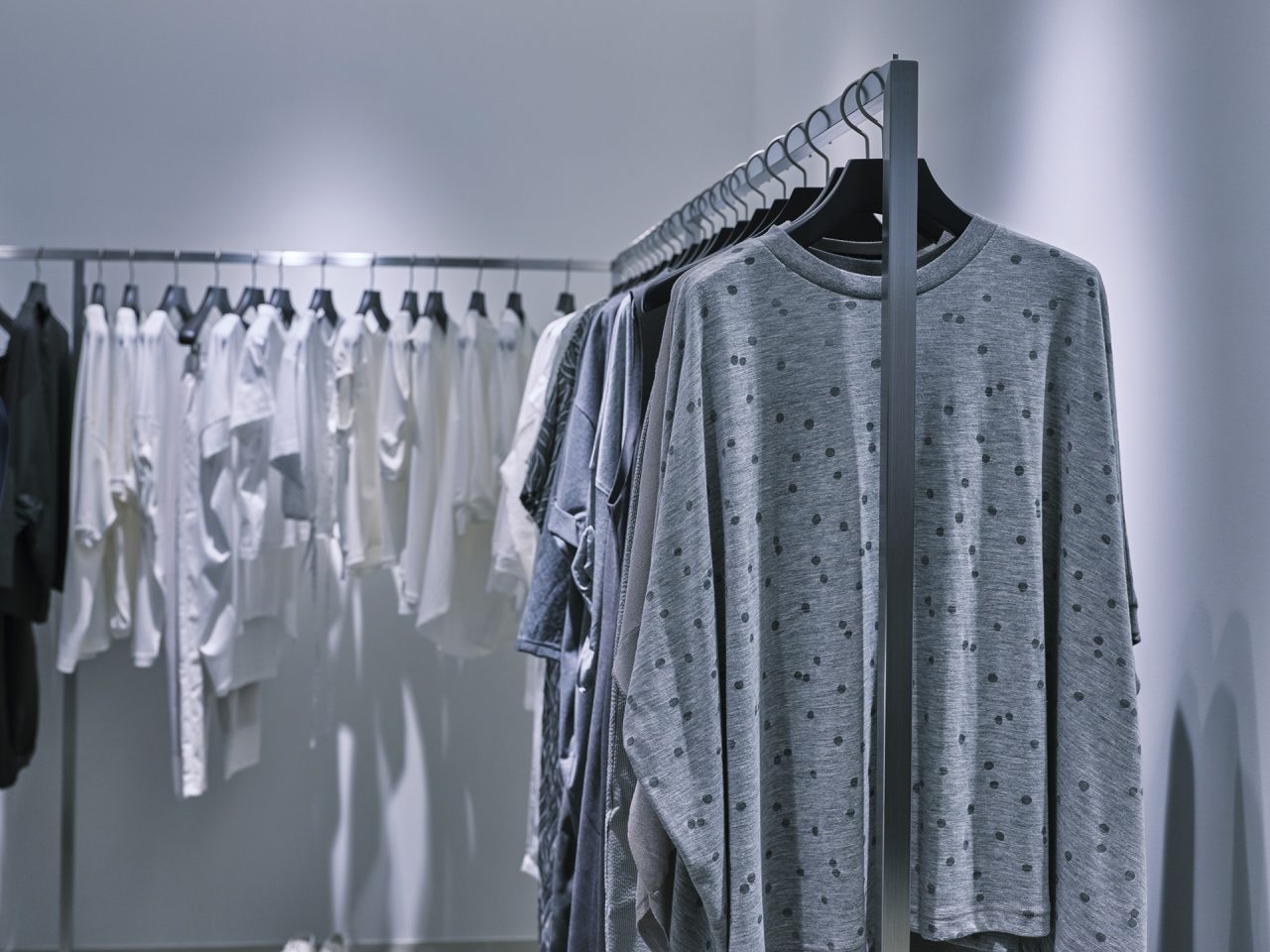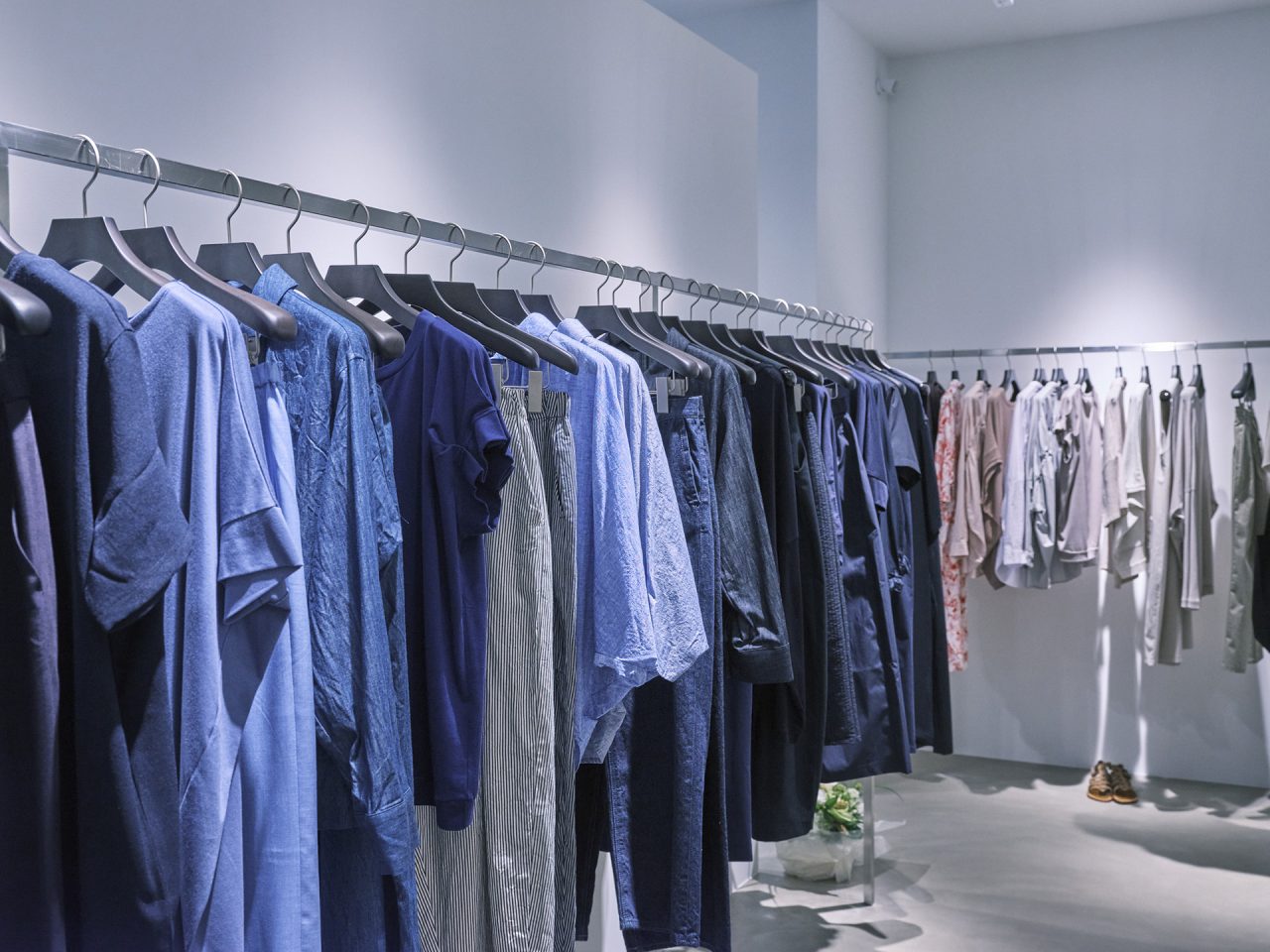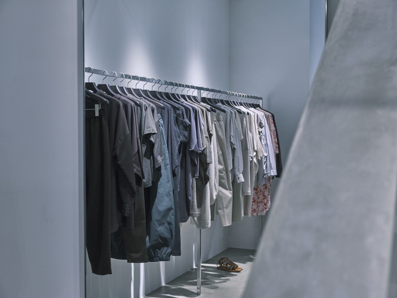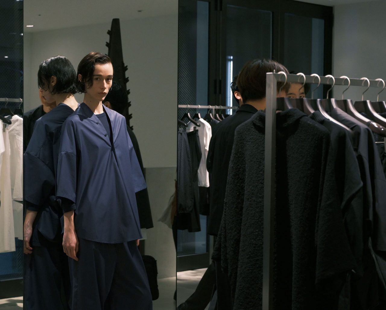 階段を上がった2F には、ブランド初のユニセックスライン「mizuiro ind free people (ミズイロインド フリーピープル)」が展開されている。2024年秋にパリで初披露されたこの新ラインは、国籍・性別・年齢といった枠を超えた自由な着こなしを提案するコレクション。mizuiro ind の特徴でもある「ほとんどのアイテムがフリーサイズ」という発想を、より開かれたかたちで昇華させたラインだ。青山店は、このコレクションを国内で唯一フルラインで展開する特別な場所となる。