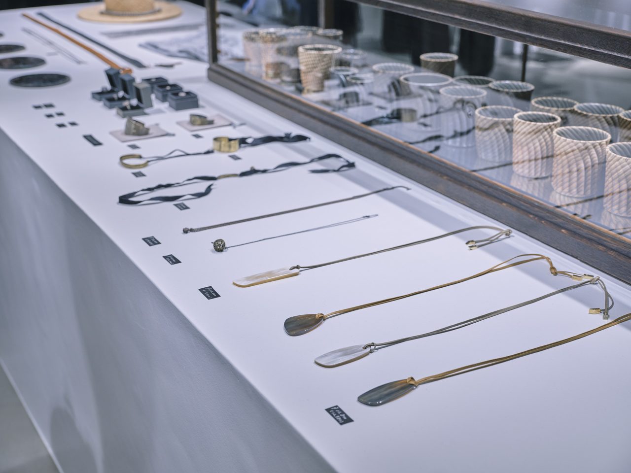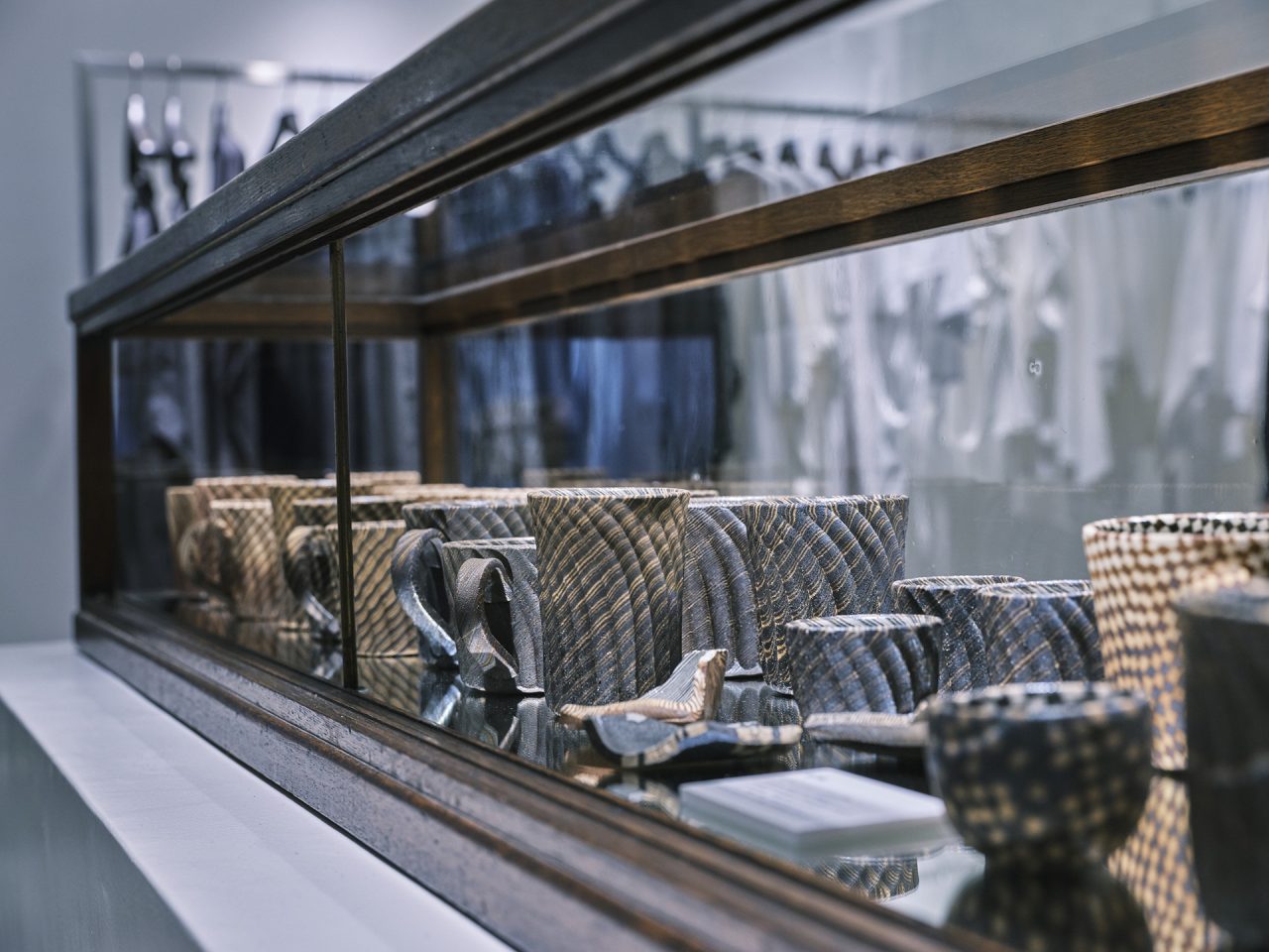 エントランスをくぐると、まず迎えてくれるのは開放感あふれる1F。mizuiro ind のシグネチャーアイテムを中心に、国内外からセレクトした服飾雑貨やモダンな器たちが丁寧に並ぶ。ディスプレイはあくまでも静かで、けれど温度を感じさせる。その配置や素材の選び方からも、mizuiro ind が大切にする「余白」の美しさが伝わってくる。