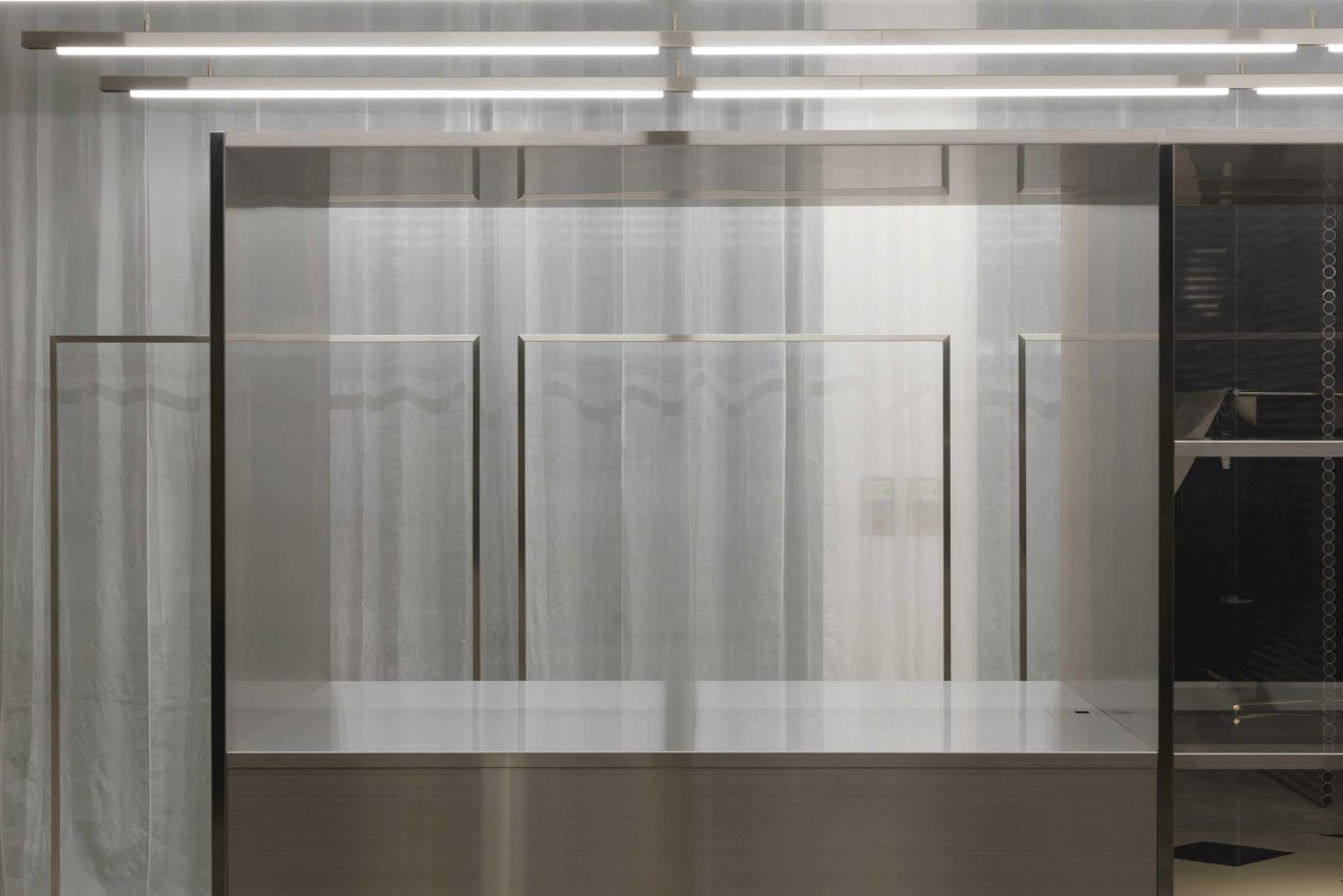 本ストアは、同ブランドのクリエイティブディレクター Christopher Nying (クリストファー・ニイン) による監修のもと、OUR LEGACY 全店舗の空間設計を手掛けるデザインスタジオ Profan (プロファン) がデザイン。シンメトリーと素材のコントラストを軸に設計された空間の中央には、ステンレススチール製のワンウェイミラー、そして内部にはキャッシャーとフィッティングルームが配置。また、ステンレスの什器とグラスファイバー製キャビネットが並んでおり、ブランドの美学が反映された店内になっている。ショップ奥に佇むシアーカーテンは、長年のコラボレーションパートナーであるアーティスト Akane Moriyama (森山 茜) によるもの。このシアーカーテンは、洗練された空間の中に柔らかさをもたらす。世界中で熱狂的なファンを魅了し続ける OUR LEGACY。その人気は、日本市場への上陸により国内でも一層高まるはず。