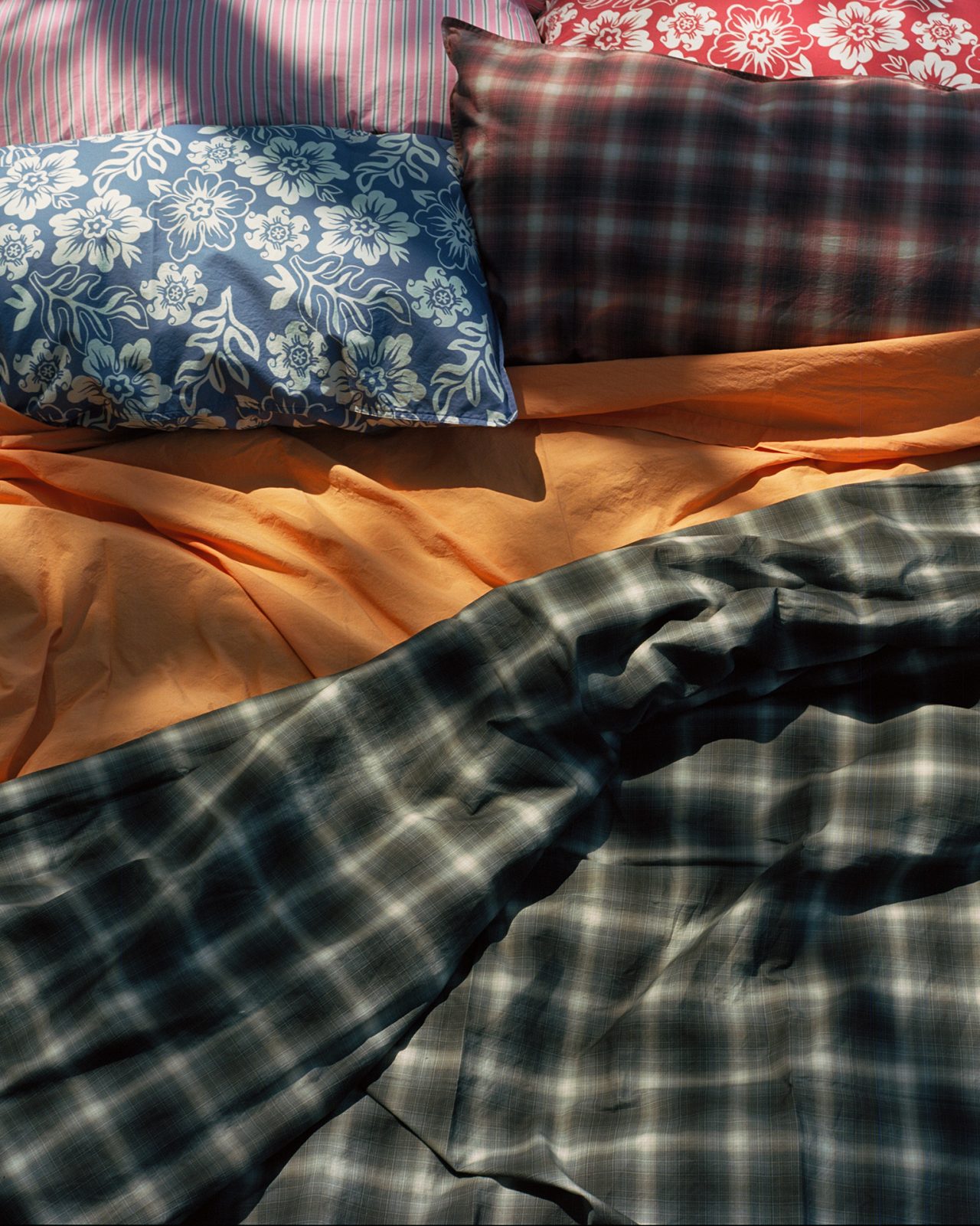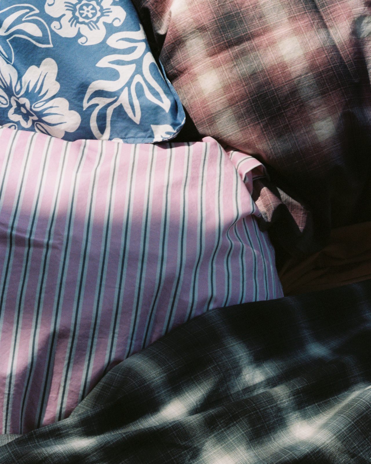 ピローカバーは、やわらかな赤チェックが印象的な「Red Plaid (レッドプレイド)」、プレッピーなシャツを思わせる「Pink Stripes (ピンクストライプ)」、ハイビスカスの花をイメージしたフローラル柄の「Blue Hawaiian (ブルーハワイアン)」と「Red Hawaiian (レッドハワイアン)」の4色で展開。デュベカバーは、スモーキーなチェック柄の「Black Plaid (ブラックプレイド)」で、フラットシーツとフィットシーツは、桃のようなやさしい色味のオレンジ「Apricot (アプリコット)」で登場した。さらに、人気の「Hand Drawn Stripes (ハンドドローンストライプ)」柄の寝具や、スリープウェアも限定で復刻販売中だ。自然と調和したこの夏限定のコレクションをチェックしてみて。