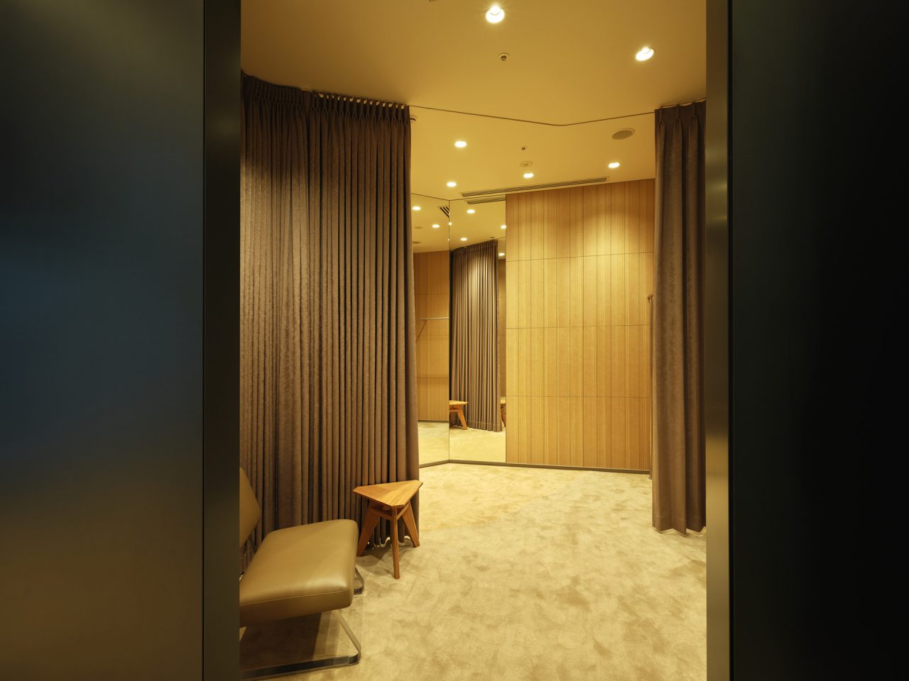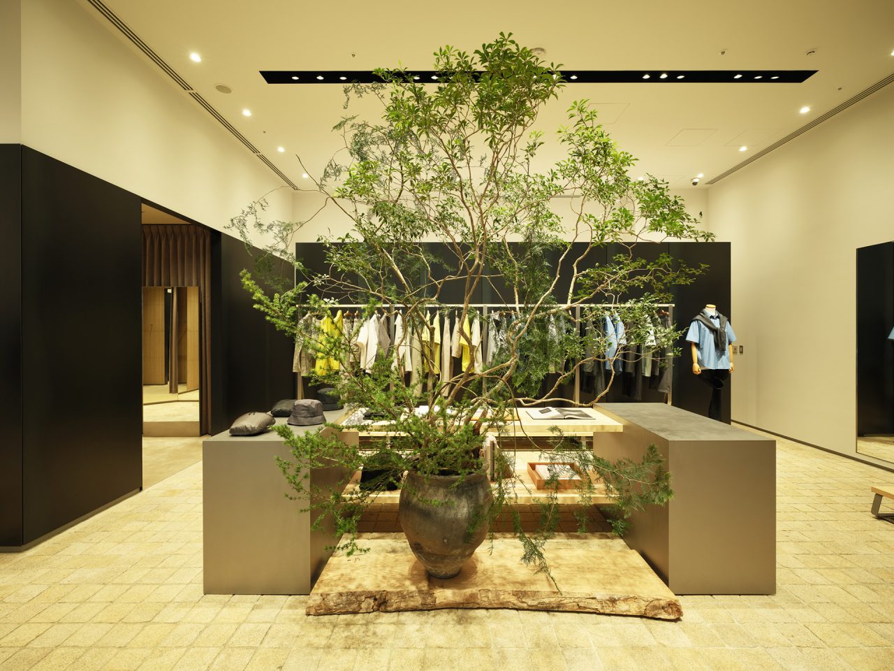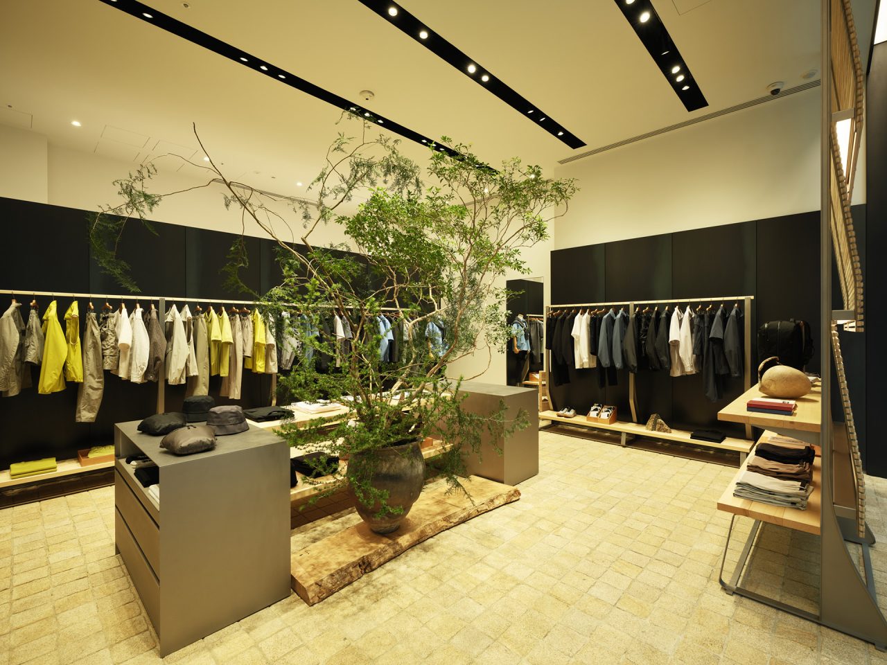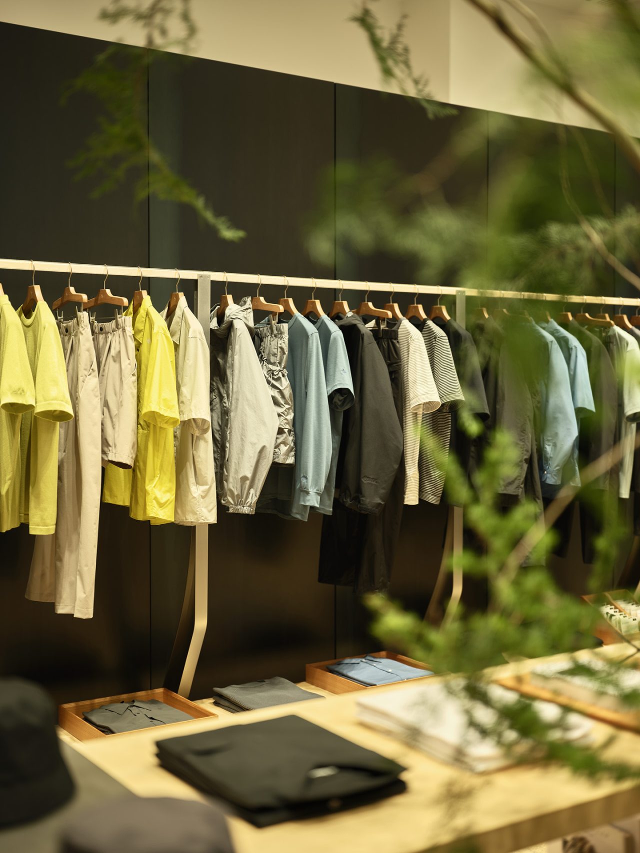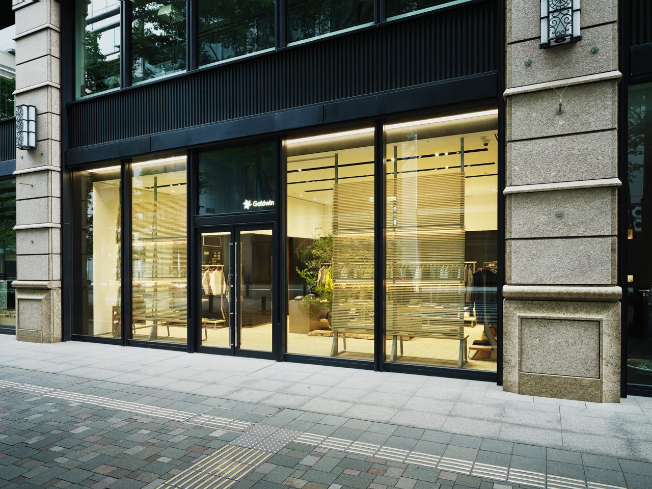 今回、移転拡大オープンした Goldwin Marunouchi は、今年5月に開業した京都店に引き続き、新素材研究所の榊田倫之が店舗デザインを手がけた。内装は、自然が長い時間をかけて生み出す造形美である地層の「地」と、ブランドが長年追求し、培ってきた知識と知見の「知」が組み合わさった「チ」の集積を表現。竹と桐がふんだんに用いられているほか、壁面には、鉄を焼成する際に自然に現れる表面の模様のゆらぎを「風」と見立てた黒皮鉄板をあしらい、時間の経過によって深い味わいを生み出す空間に。さらに、サロン兼フィッティングスペースも導入し、よりゆったりと買い物に没入できる空間を演出している。こうしたブランドの精神ともいえる細部へのこだわりが、訪れる人々の心に新たな風を吹き込み、時代と共に変化し続ける Goldwin の未来を体現している。