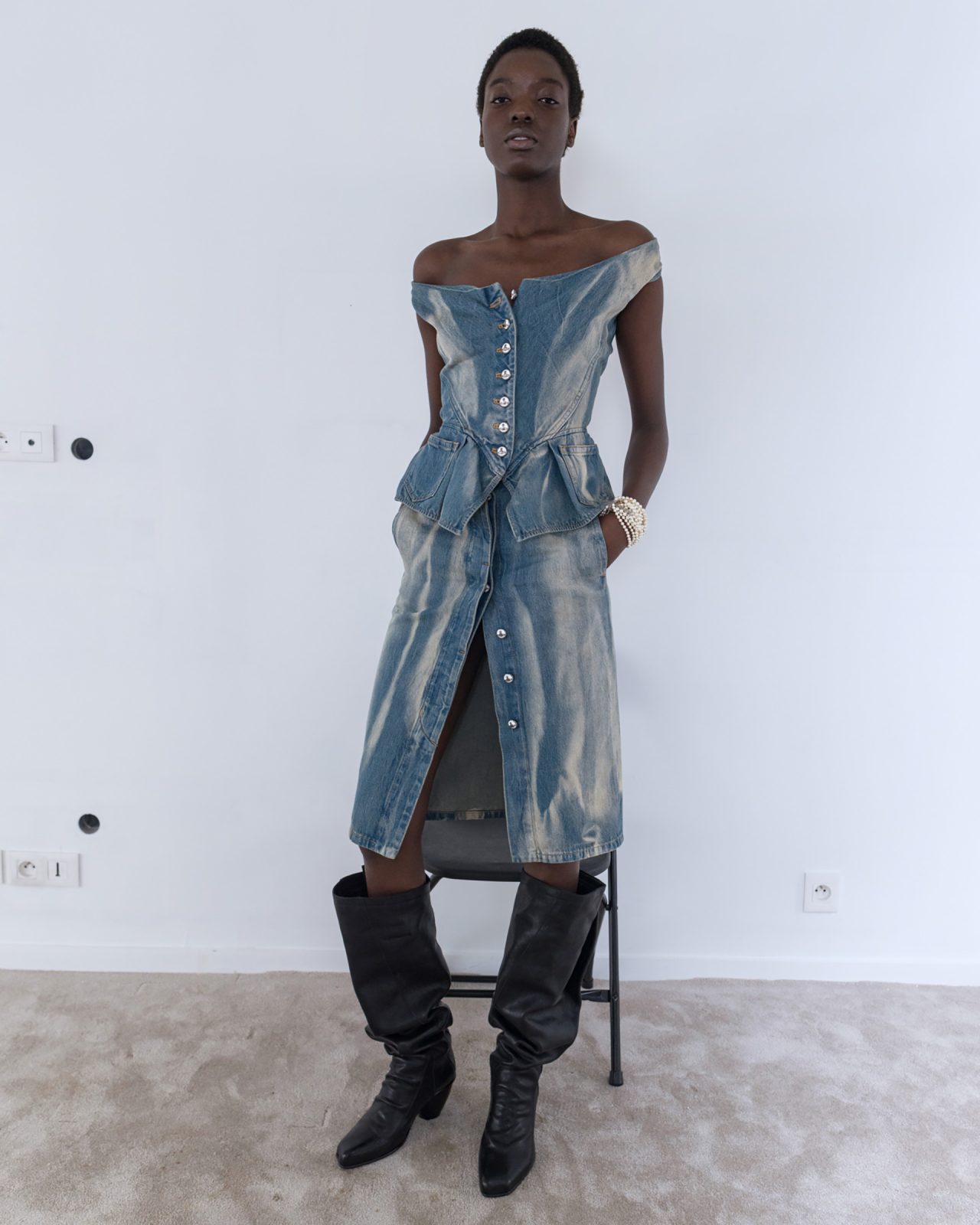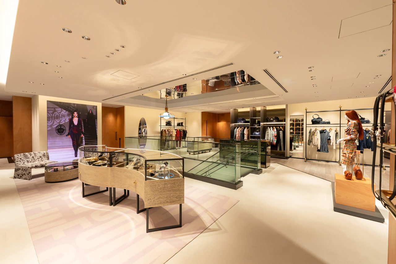 壁面は、ブランドオリジナルのパターンを、日本の伝統的な左官技術を用いて再構築。2階には、日本建築において格式の高い意匠とされる「格天井」を設置。さらに天井面にミラー加工を施し、伝統とアヴァンギャルドが交差する象徴的な空間に仕上げた。Vivienne Westwood のクラフトマンシップと、日本独自の美意識が交差するこの旗艦店は、ブランドを象徴する新たな存在となるだろう。