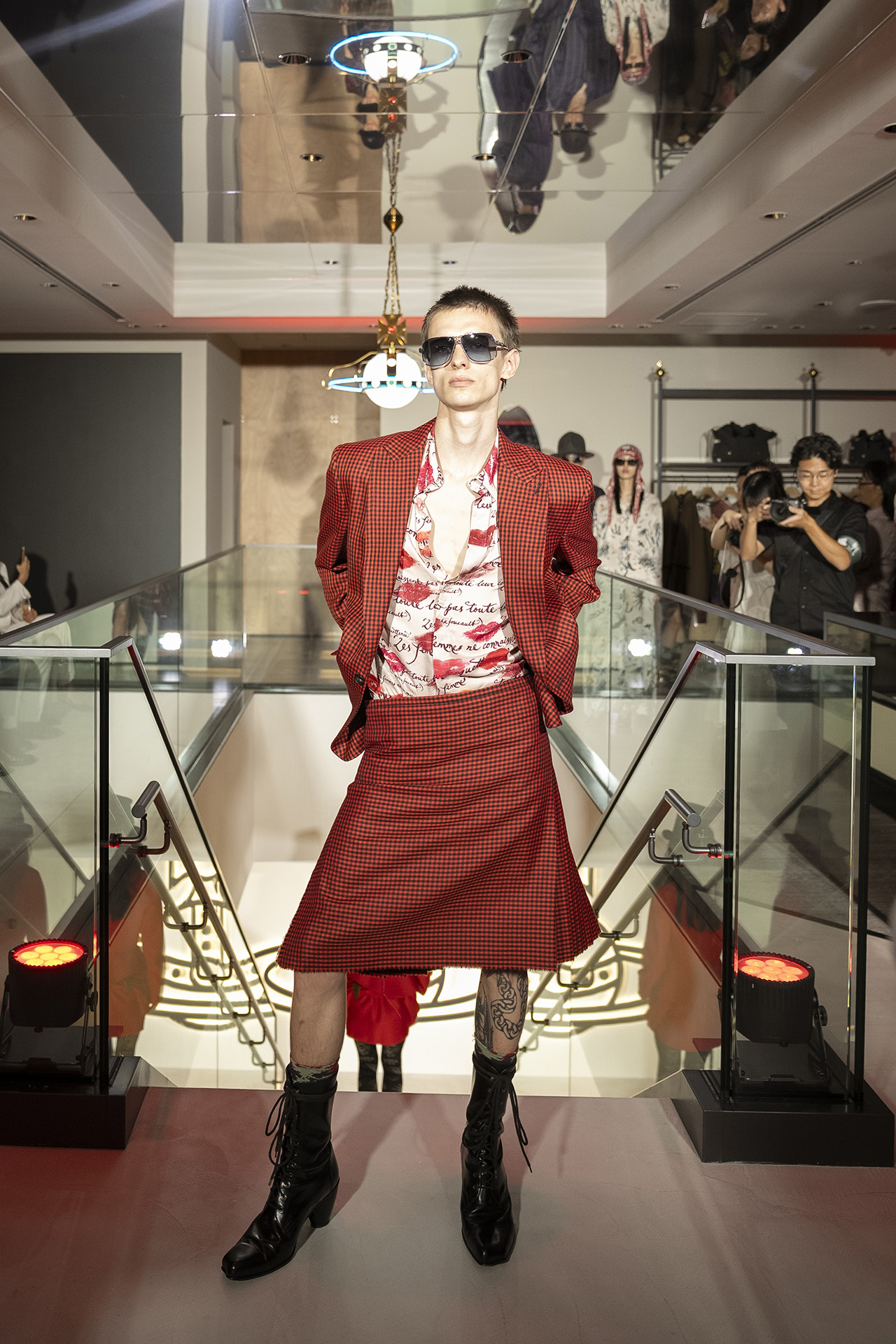 新店舗では、メンズ・ウィメンズアイテムに加え、日本初上陸となる「Vivienne Westwood CAFÈ」が併設され、リラックスした空間を提供。店舗デザインは、Vivienne Westwood のグローバルコンセプトを軸に、日本ならではの美意識や建築的要素を随所に取り入れた。「格子越し」の視覚的演出を採用し、視線をやわらかく遮りつつも、光や風、奥行き、そして日本的な間の美しさを表現。格子の奥には、漆の朱を思わせる色を差し込み、季節の移ろいや品のある佇まいを感じさせるアクセントが施されている。