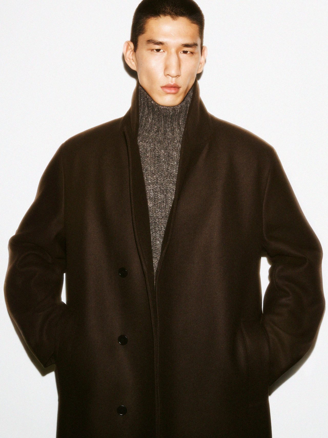 今季のコレクションは、上質な素材、精密なテーラリング、そして洗練されたディテールがコレクション全体に深みをもたらし、新たな次元へと昇華。インクのように深く沈むブラック、ガンメタル、カーキ、ネイビーといった重厚なカラーパレットを基調に、マットと光沢、シアリングとレザーなどの異なる質感が交差し、洗練されたレイヤリングを提案する。