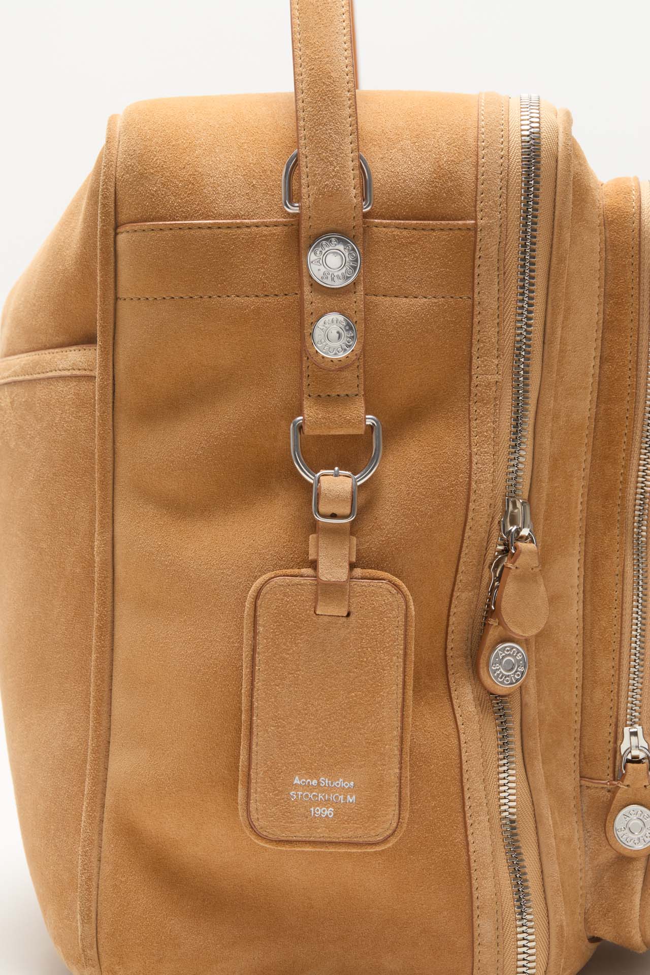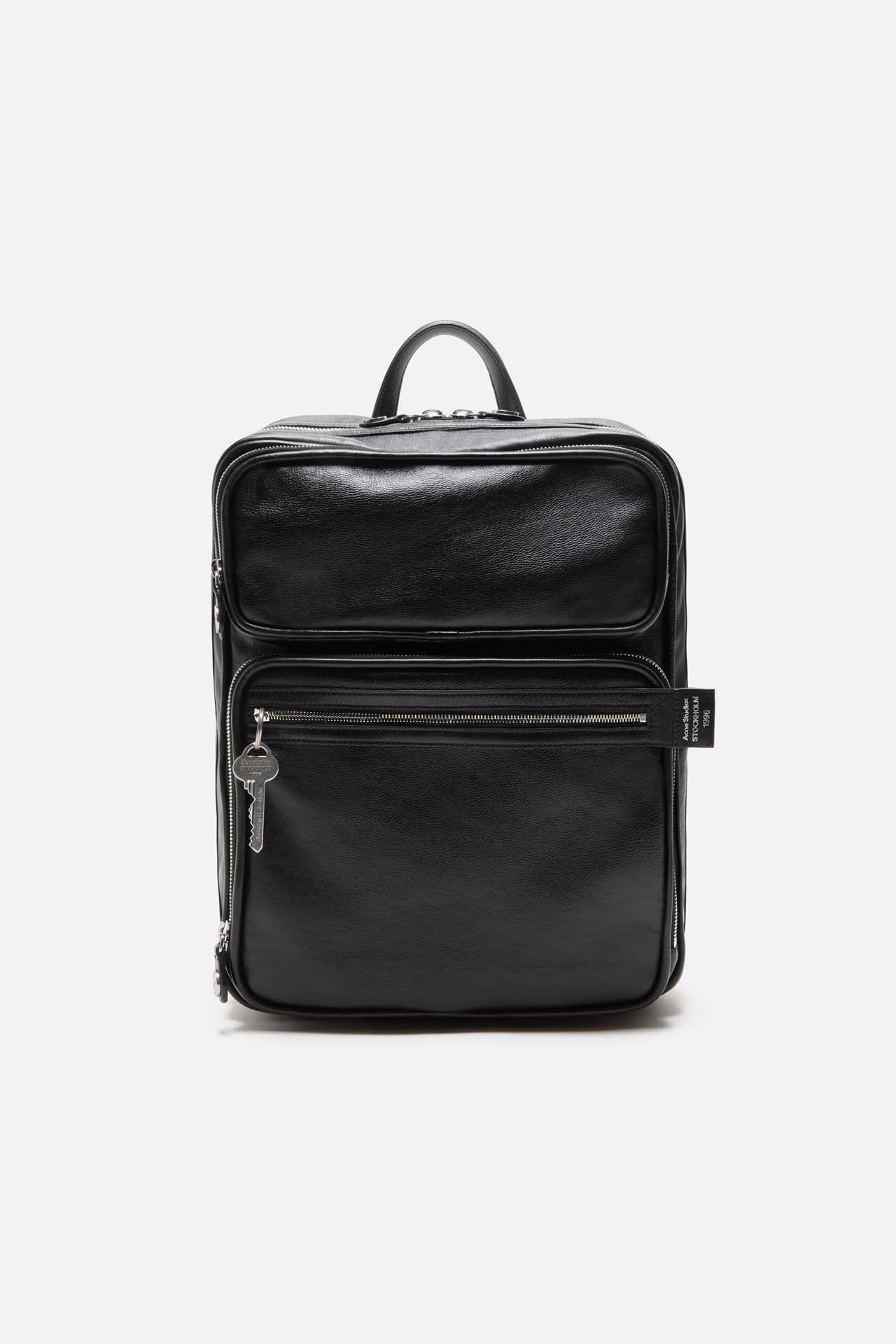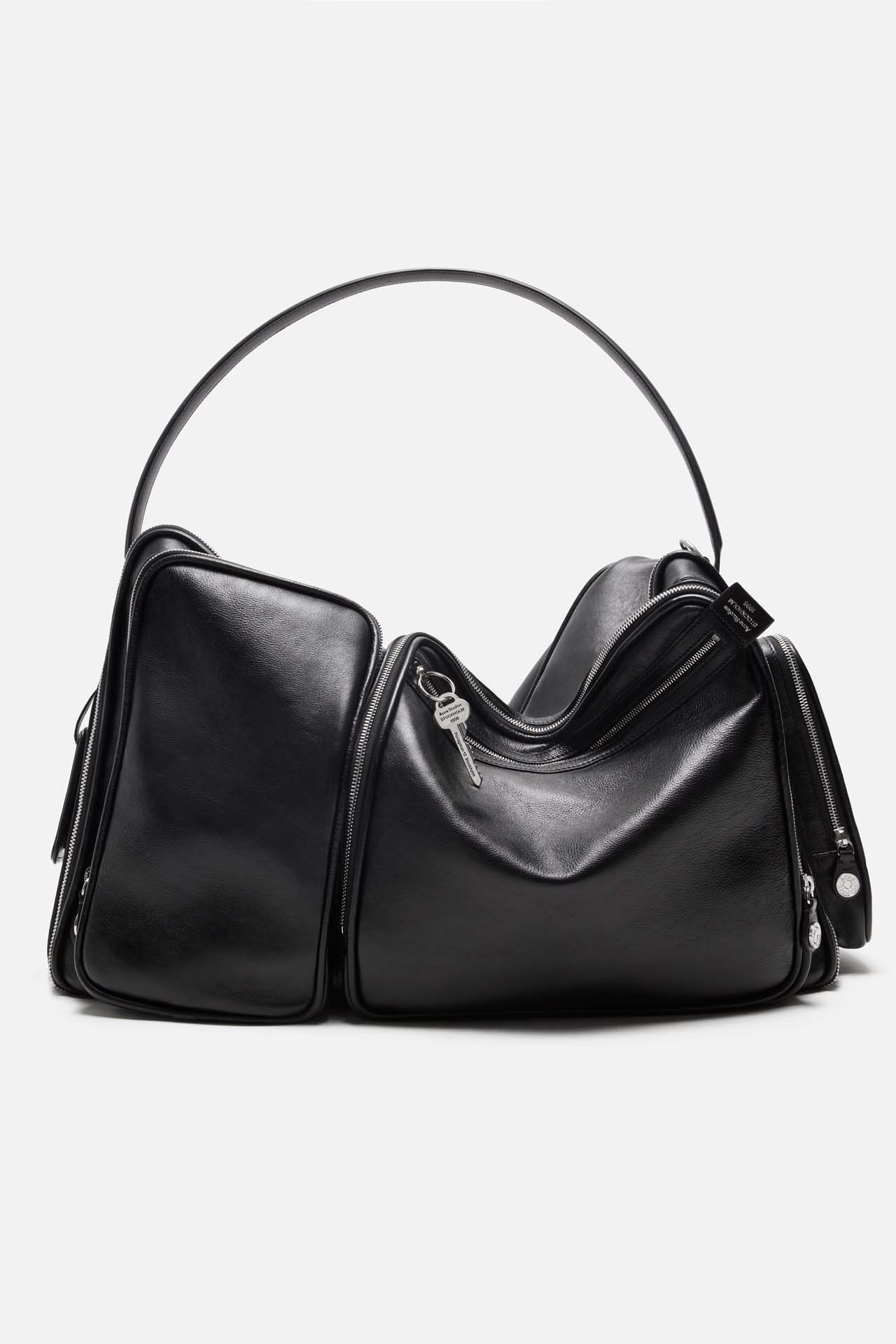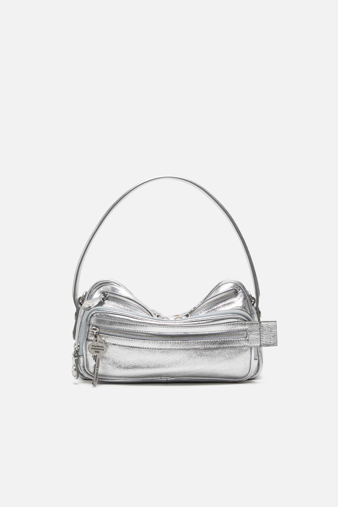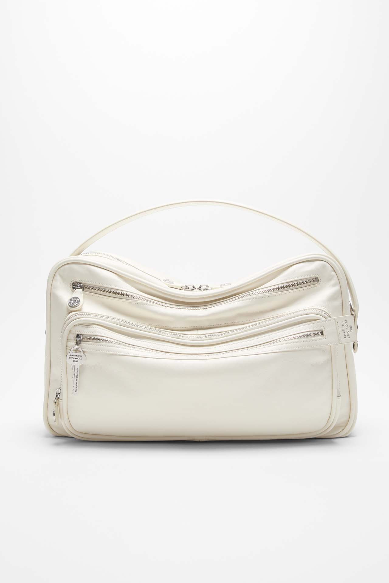今季は、オーバーサイズの「Hotel」とバックパック仕様の「Gym」が仲間入り。既存の「Camera」「Party」とあわせて、シチュエーションにリンクした4サイズ展開だ。全モデルに「Acne Studios Stockholm 1996」と刻まれたキー型チャームを配し、機能面でも複数のジップやリベットなど細部にこだわりが光る。「Hotel」にはシルバーフォイルでロゴをデボス加工したミラータグが加わり、特別感を演出している。