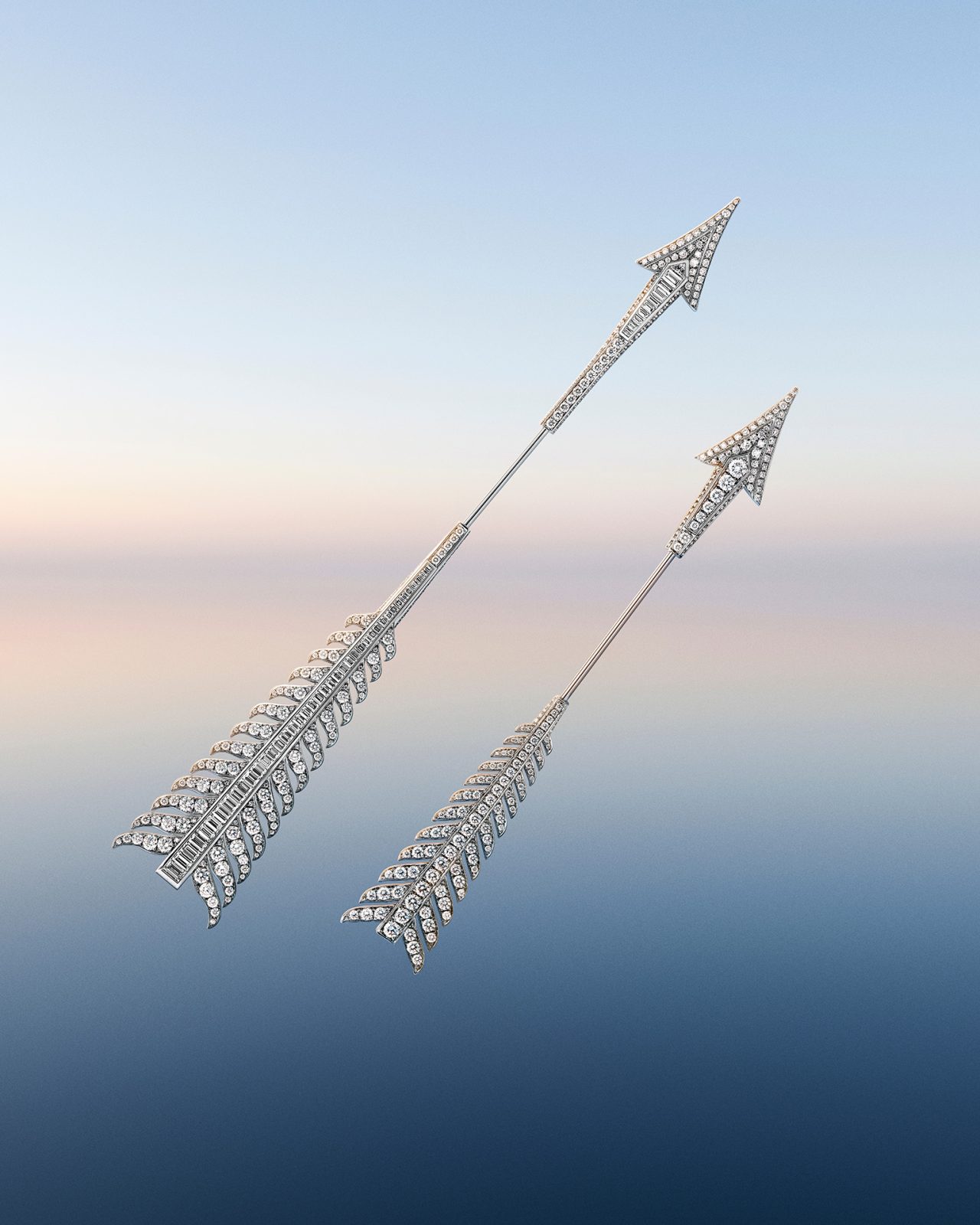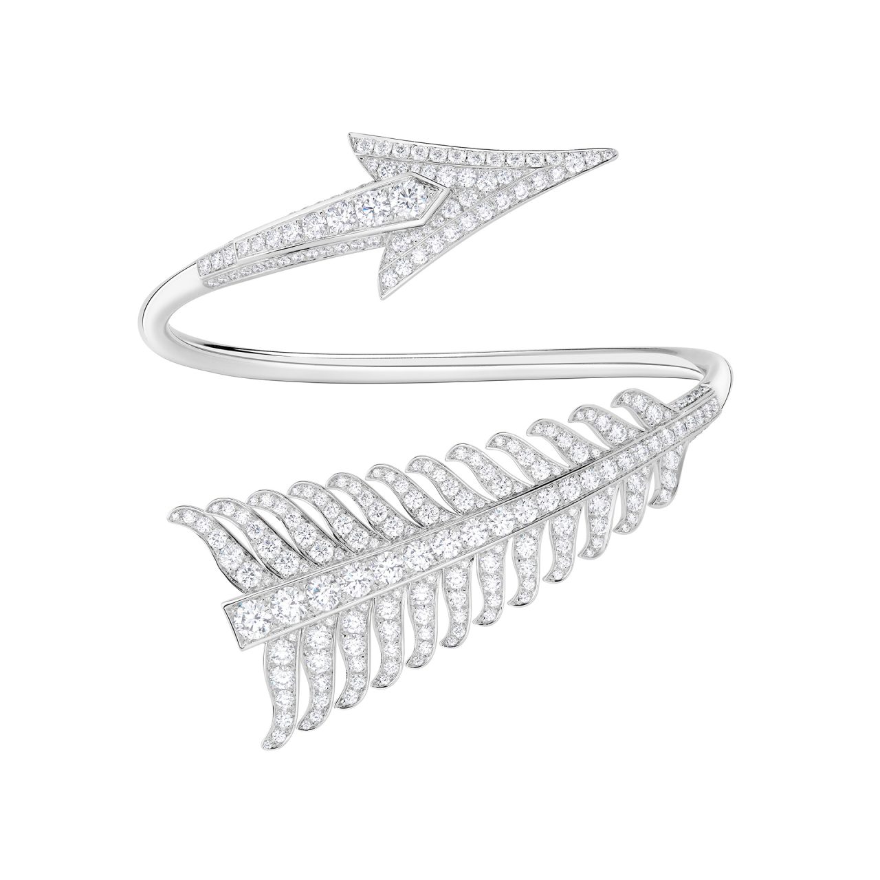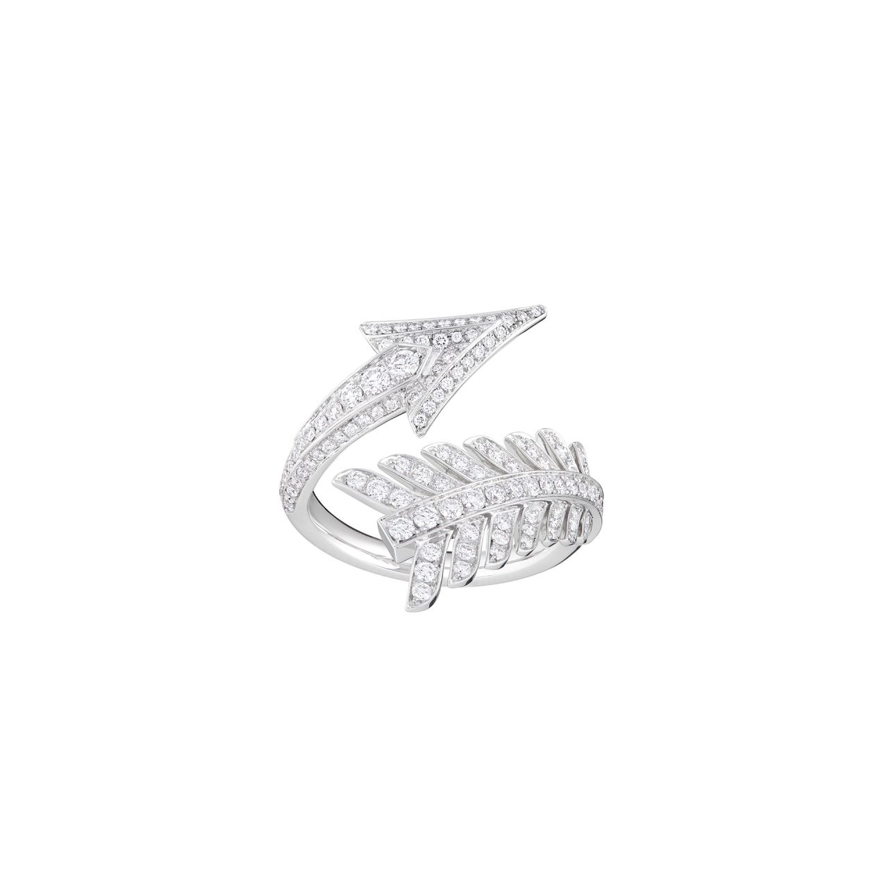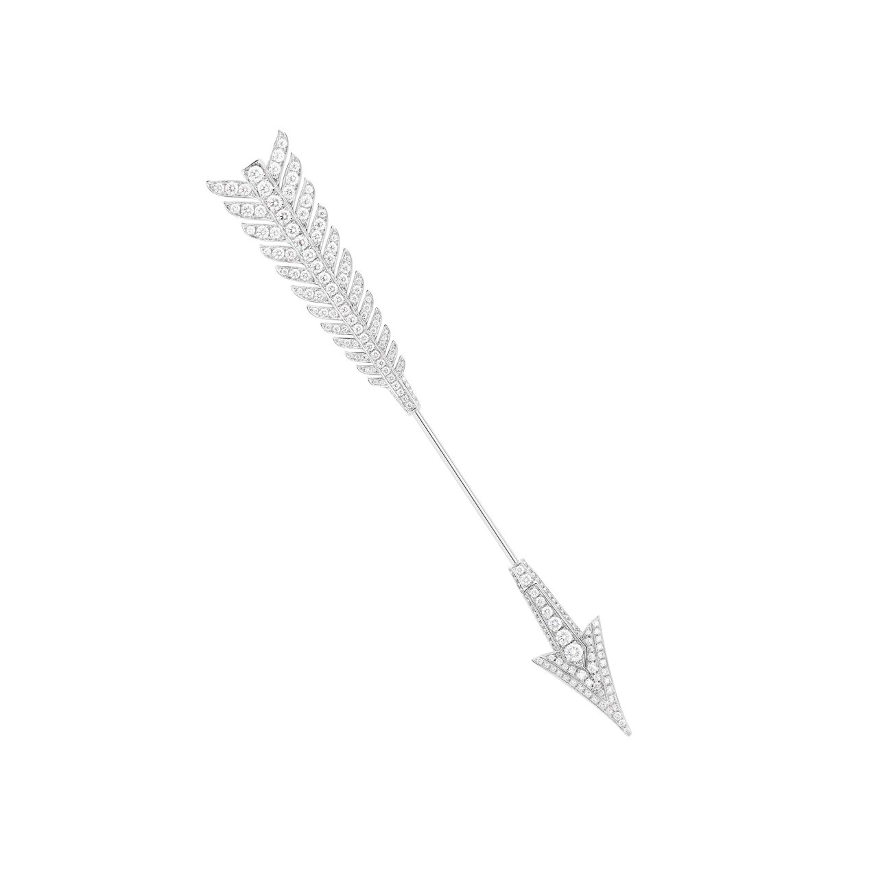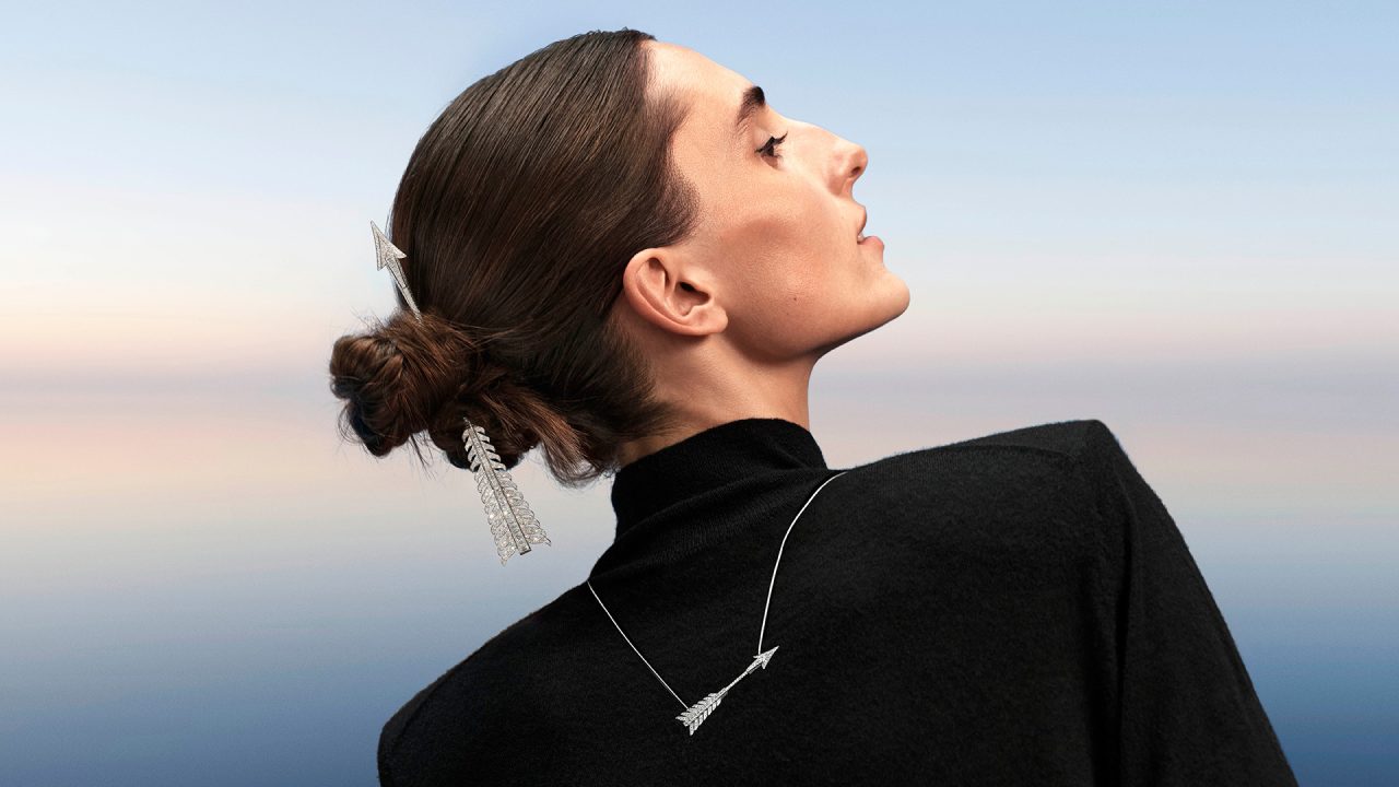 本コレクションでは、「矢」を忠実な形で再現した、精巧で繊細なデザインのブローチ、ラウンドカットとバゲットカットのダイヤモンドを組みわせた XXL サイズのブローチ、さらに、ラウンドカットのダイヤモンドで1本の指に巻き付くようなデザインに加え、3本の指にまたがる彫刻的なデザインの2種類のリングがラインナップ。そのほかにも、留め具のないフレキシブルな構造のネックレスやブレスレット、フープイヤリングやペンダントも登場した。
