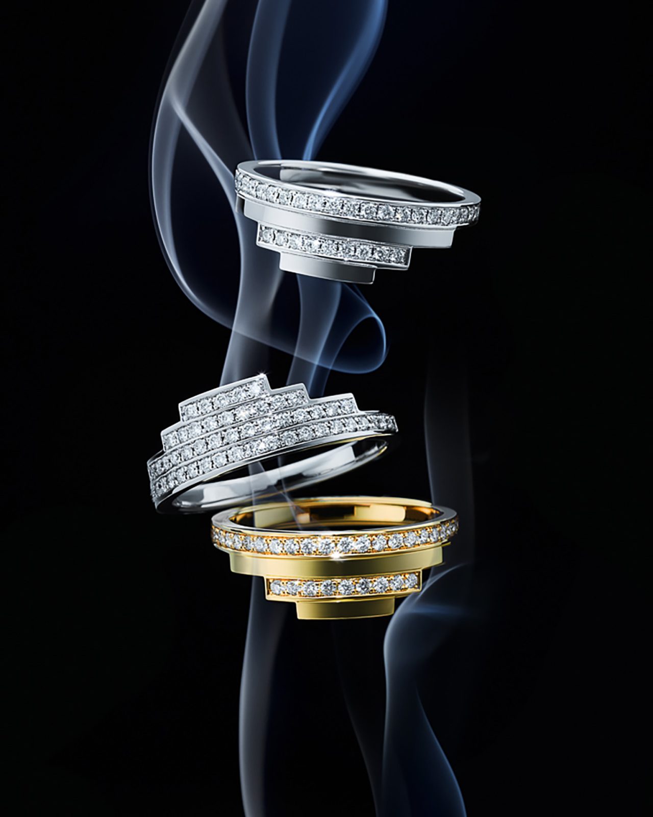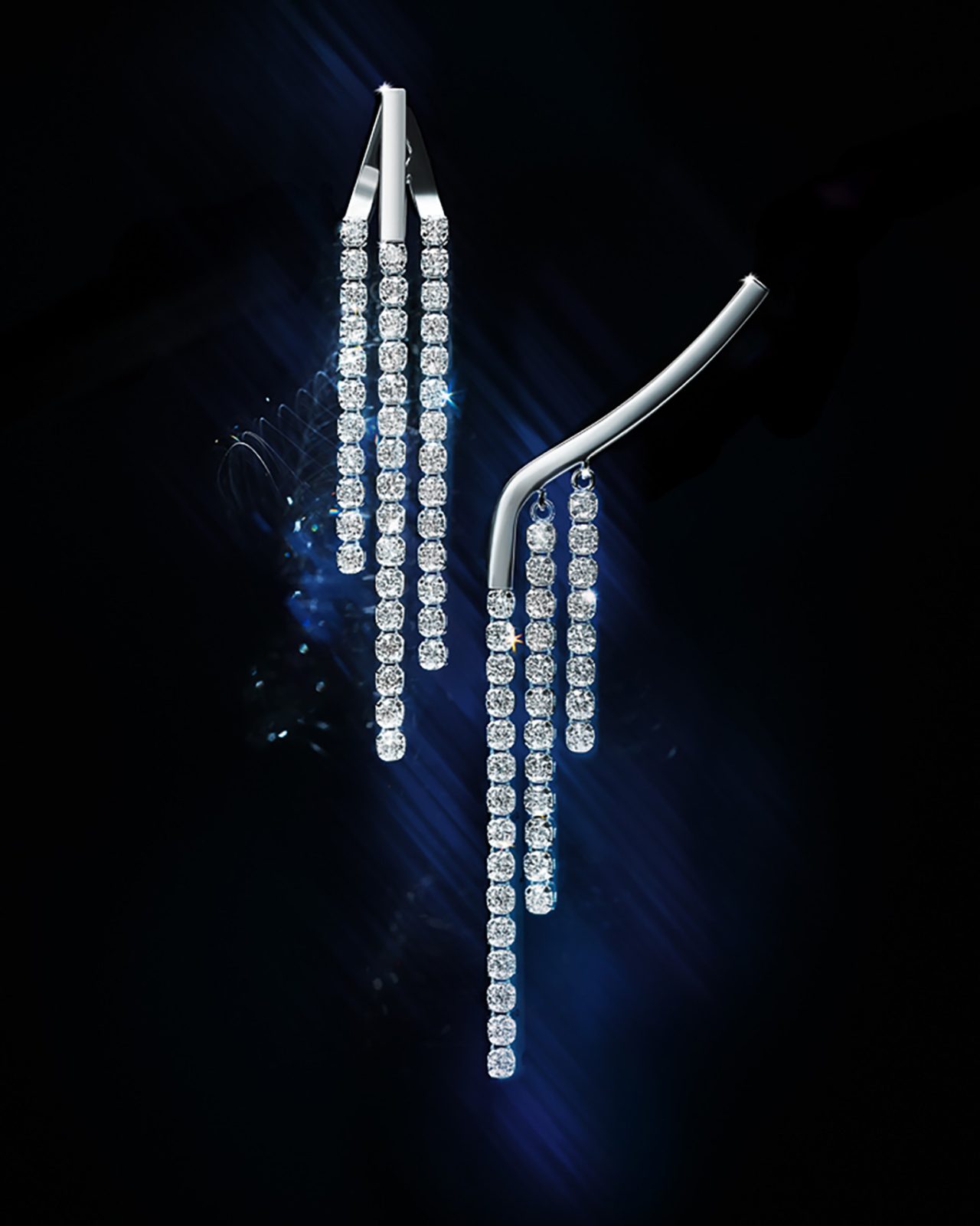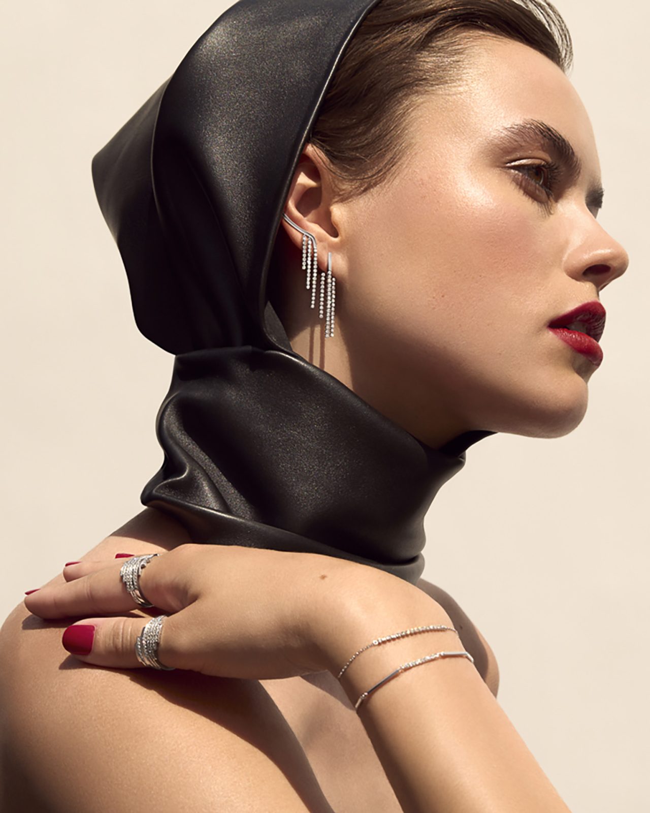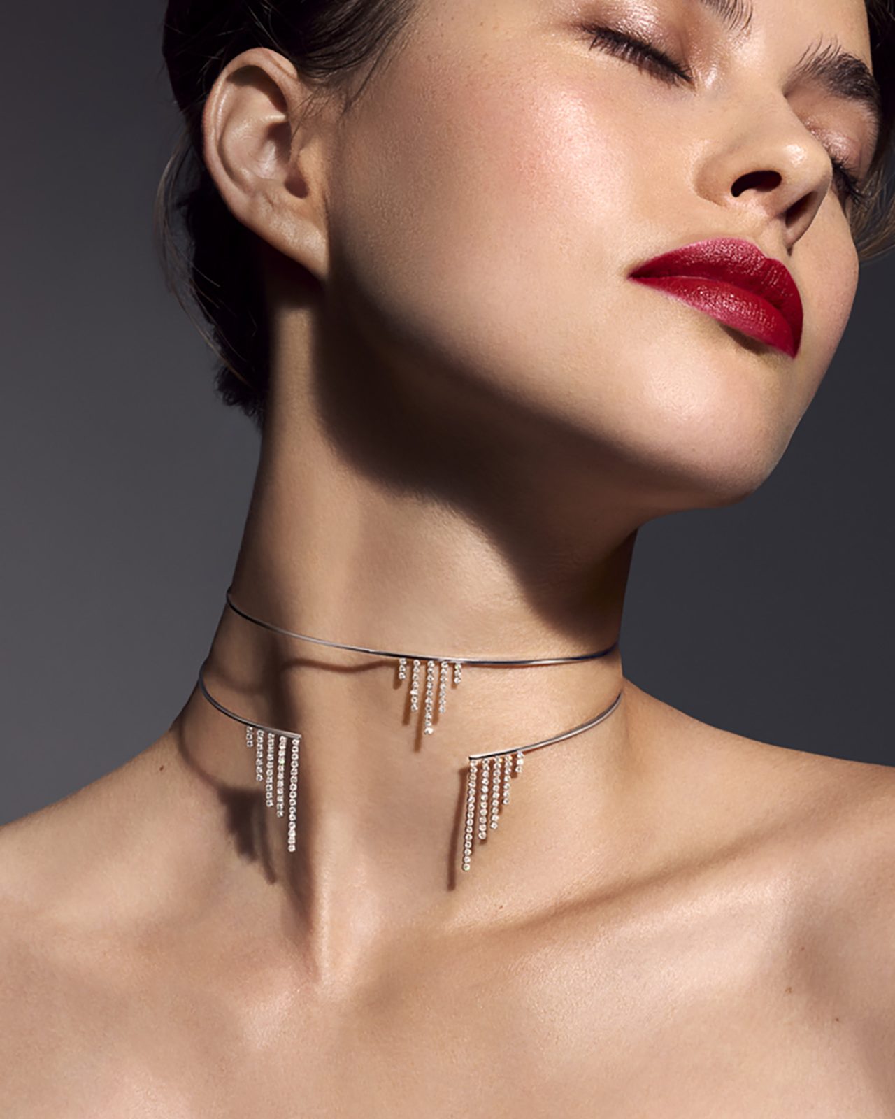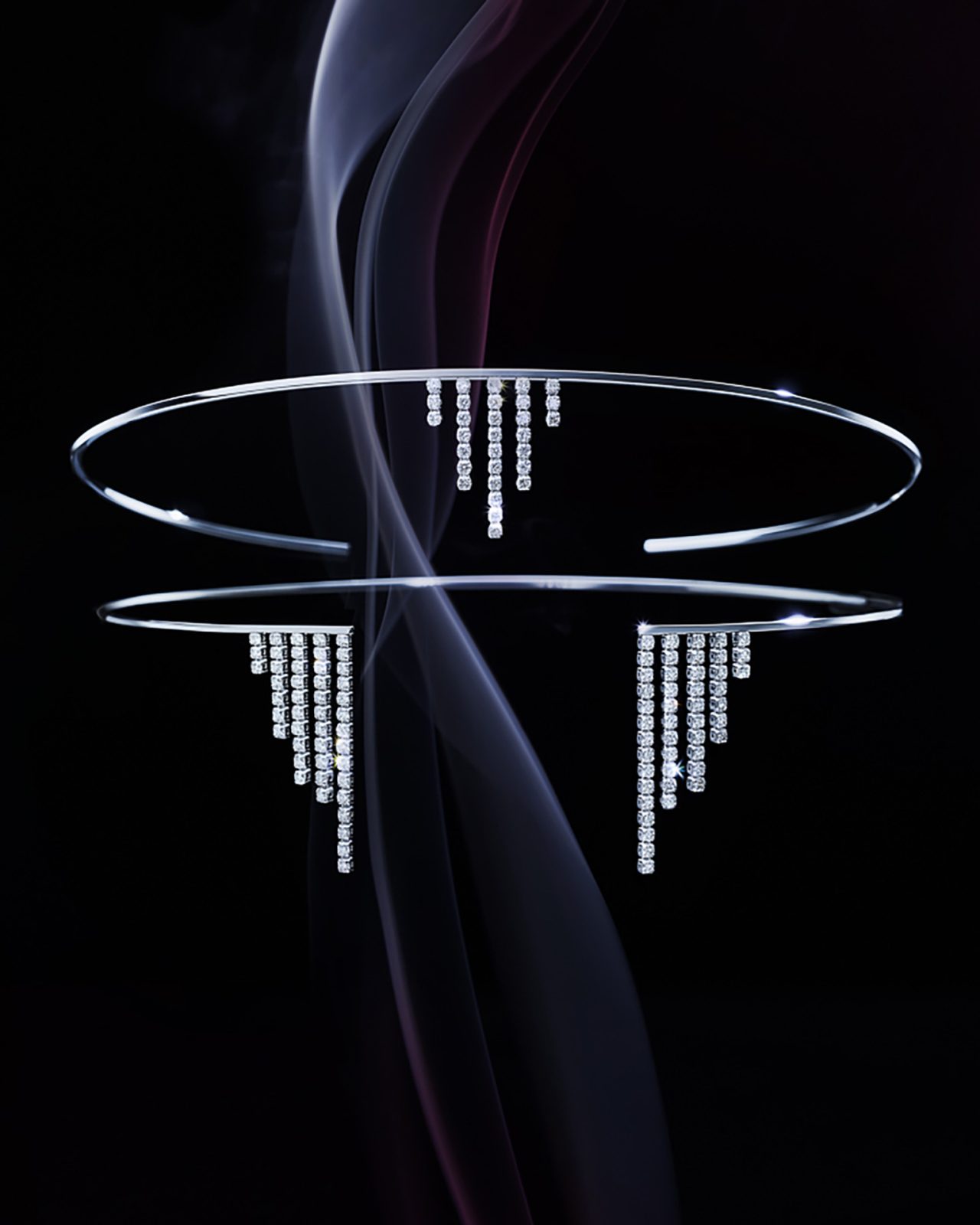 光を受けて輝くテニスチェーンの優美なフォルムと、軽やかな揺れ感が魅力の「シャンデリア」、ダイヤモンドとプラチナの輝きをレイヤードし、構築的にシャンデリアを表現した「シャンデリア レイヤード」の2シリーズに、それぞれ新たなバリエーションが加わった。ラインナップには、リングやピアス、チョーカーといったスタイルに凛とした存在感を与えるジュエリーが登場。まるで光そのものをまとったかのような繊細且つ華やかな輝きが、日常をドラマティックに変えてくれるはず。