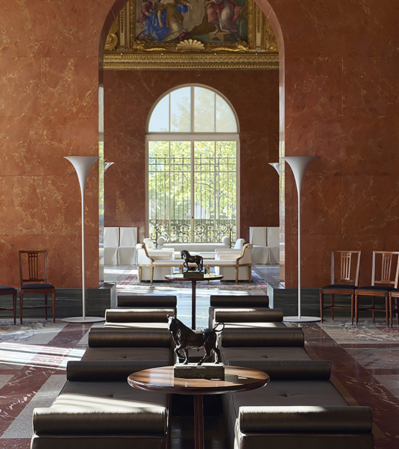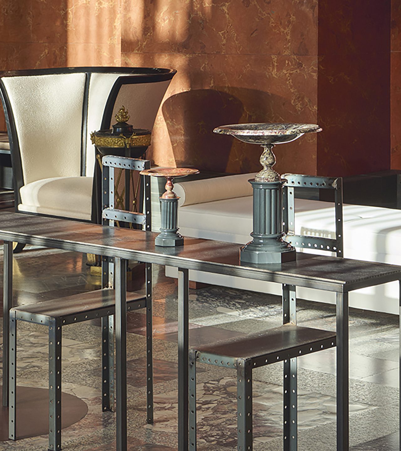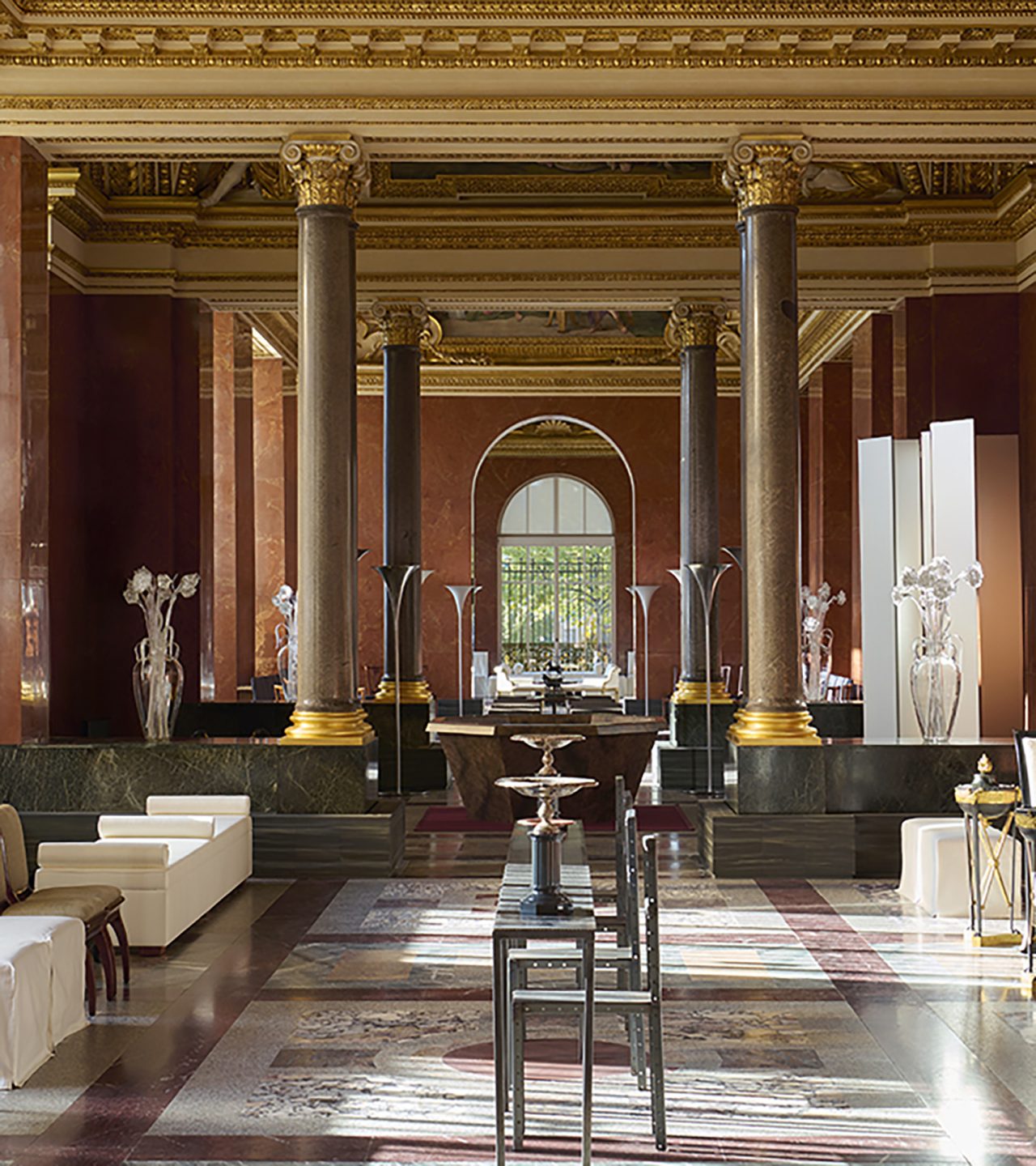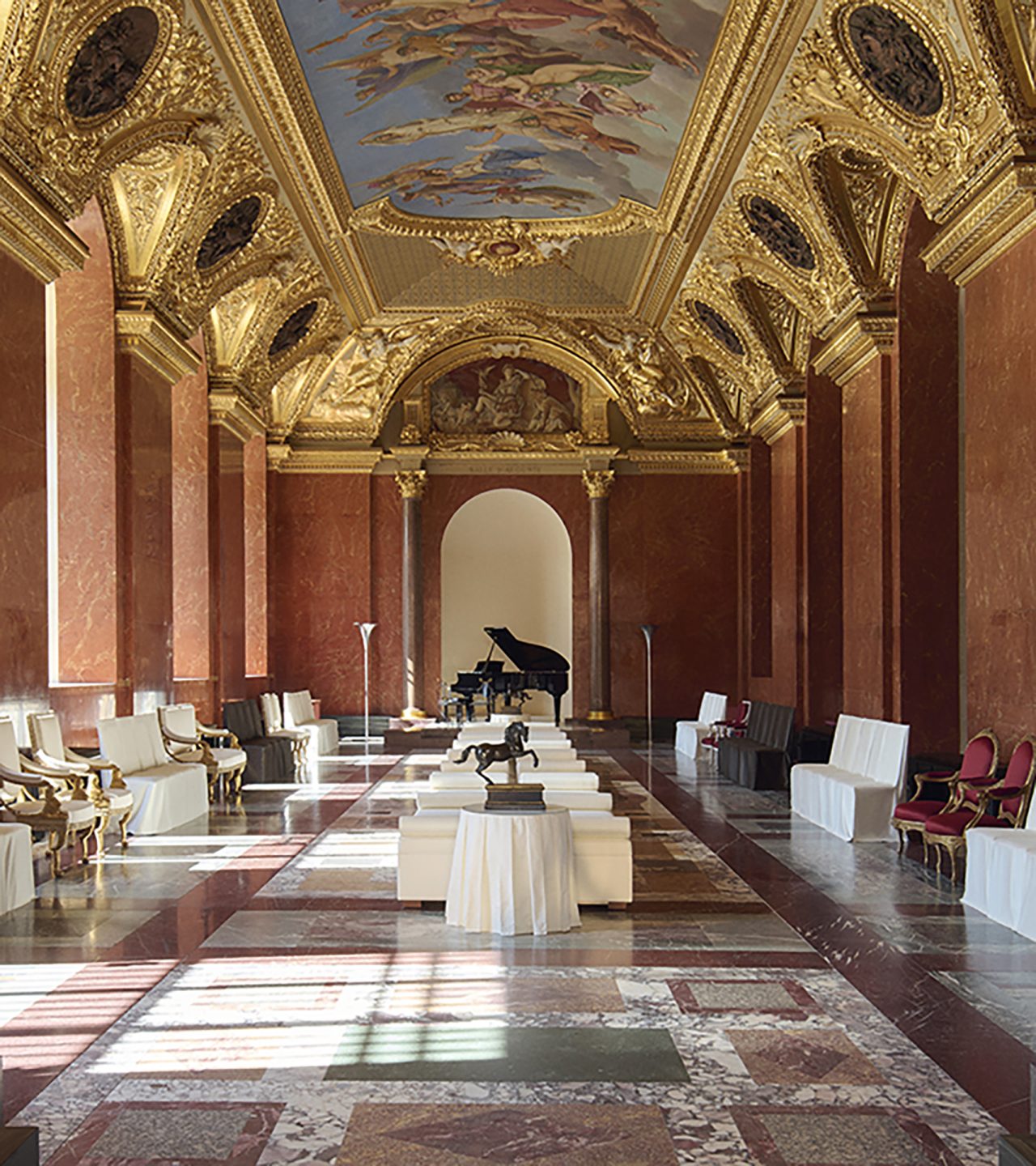 舞台となったのは、かつてフランス王妃 Anne d’Autriche (アンヌ・ドートリッシュ) が夏の日々を過ごしたルーヴル美術館。舞台美術家でデザイナーの Marie-Anne Delavelle (マリー=アンヌ・デルヴィール) が手がけた空間には、アーティスト Robert Wilson (ロバート・ウィルソン) の作品、1930年代の Michel Dufet (ミシェル・デュフェ) によるアールデコの椅子、19世紀の陶芸家 Pierre-Adrien Dalpayrat (ピエール=アドリアン・ダルペラ) の彫刻、そして彼女自身のデザインした家具など、時代を超えた名作が組み合わされ、モダンなアパルトマンが構築された。