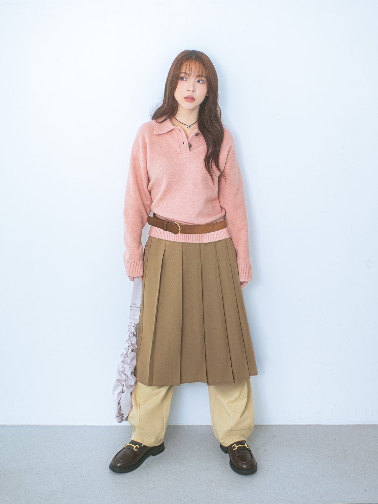 パフニット ポロシャツ ¥2,490、スカート ¥2,990、パンツ ¥2,990、バッグ ¥1,990、シューズ ¥2,990、ベルト ¥1,290、ネックレス ¥590、リング ¥590/すべて GU