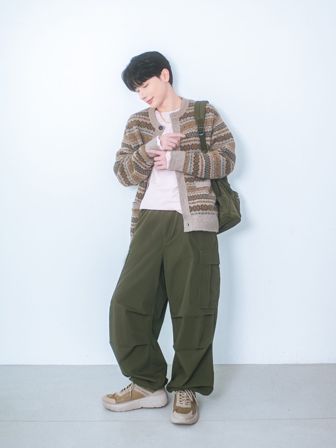よしあき:パフニット Vネックカーディガン ¥2,990、シャツ ¥2,490、Tシャツ ¥1,990、パンツ ¥2,990、シューズ ¥2,990/すべて GU