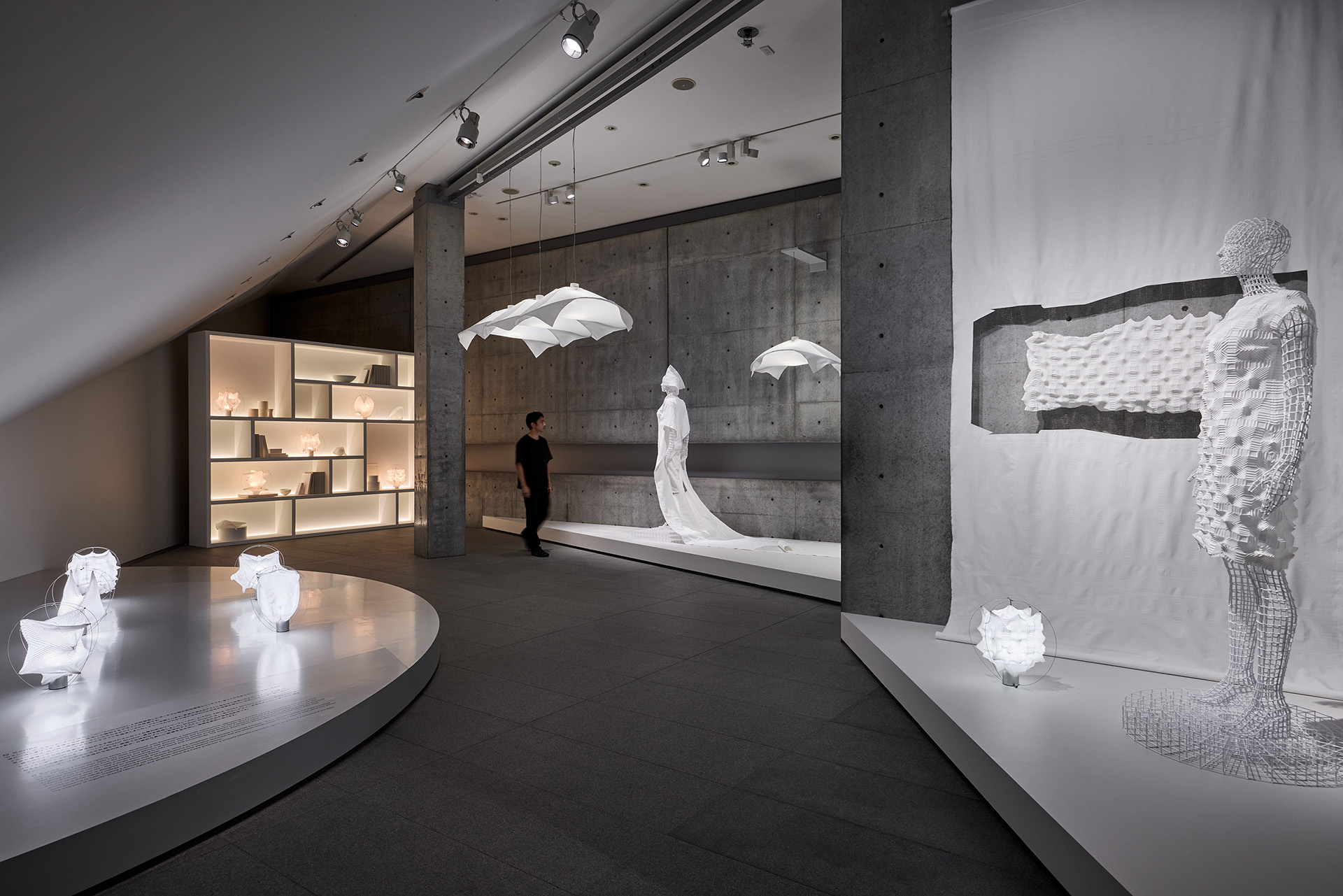 本展では、両ブランドのデザインに対する思想やアプローチへの共鳴から生まれた、「一枚の布」と「一本のワイヤー」を融合させた新たな照明プロジェクトによる、二つの照明器具シリーズ「O Series」「A Series」が登場。「O Series」は、日本のポータブル照明メーカー Ambientec (アンビエンテック) と共同開発したポータブル型の照明器具シリーズ。花が持つ繊細な美しさとしなやかさが着想源の本シリーズは、日常に優しく寄り添い、多様な空間や環境にも調和する一凛の花のような照明器具に仕上がった。「A Series」は、A-POC を象徴する無縫製ニットによる照明シリーズ。チューブ状に編まれた生地にワイヤーを入れることで立体的な形に変わり、カットする位置でシングルやダブルなど多様なフォルムに調整できる。遊び心と機能性が融合したデザインが特徴だ。展示では、スペインの照明ブランド PARACHILNA (パラチルナ) との協業によるペンダント型照明のプロトタイプを披露。厳選された素材やクラフトマンシップが、新たな光の表現を生み出している。